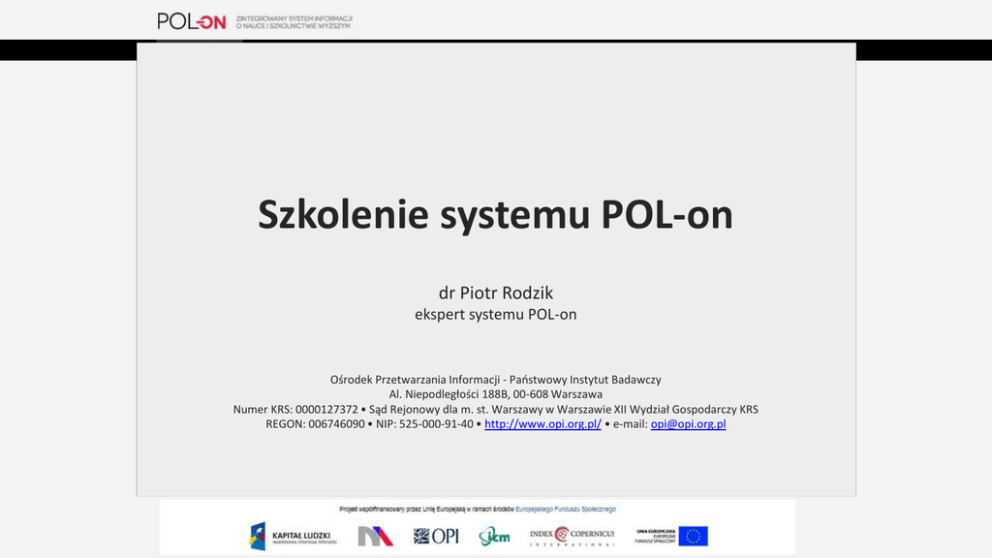Szkolenie systemu POL-on dr Piotr Rodzik ekspert systemu POL-on Ośrodek Przetwarzania Informacji - Państwowy Instytut Badawczy Al. Niepodległości 188B, 00-608 Warszawa Numer KRS: 0000127372 • Sąd Rejonowy dla m. st. Warszawy w Warszawie XII Wydział Gospodarczy KRS REGON: 006746090 • NIP: 525-000-91-40 • http://www.opi.org.pl/ • e-mail: [email protected] Pracownicy naukowi* i nauczyciele akademiccy * w rozumieniu znowelizowanej ustawy o zasadach finansowania nauki. Pracownicy naukowi i nauczyciele akademiccy Podstawy prawne • Ustawa z dnia 27 lipca 2005 r. Prawo o szkolnictwie wyższym z późniejszymi zmianami (ostatnia nowelizacja 11 lipca 2014 r.); • Ustawa z dnia 14 marca 2003 r. o stopniach naukowych i tytule naukowym oraz o stopniach i tytule w zakresie sztuki z późniejszymi zmianami (ostatnia nowelizacja 11 lipca 2014 r.); • Ustawa z dnia 30 kwietnia 2010 r. o zasadach finansowania nauki z późniejszymi zmianami (ostatnia nowelizacja 15 stycznia 2015 r.); Pracownicy naukowi i nauczyciele akademiccy • Rozporządzenie z dnia 25 września 2014 r. w sprawie ogólnopolskiego wykazu nauczycieli akademickich i pracowników naukowych. • Rozporządzenie z dnia 3 października 2014 r. w sprawie warunków prowadzenia studiów na określonym kierunku i poziomie kształcenia. • Rozporządzenie z dnia 8 sierpnia 2011 r. w sprawie obszarów wiedzy dziedzin nauki i sztuki oraz dyscyplin naukowych i artystycznych. • Rozporządzenie z dnia 8 sierpnia 2011 r. w sprawie nostryfikacji stopni naukowych i stopni w zakresie sztuki uzyskanych za granicą. • Rozporządzenie Ministra Nauki i Szkolnictwa Wyższego z dnia 00.00.2015 w sprawie Systemu Informacji o Nauce. (projekt został przedstawiony do konsultacji 23.04.2015). Pracownicy naukowi i nauczyciele akademiccy Prawo o szkolnictwie wyższym Pracownicy naukowi i nauczyciele akademiccy Art. 129a Ustawy: 1. Minister właściwy do spraw szkolnictwa wyższego prowadzi ogólnopolski wykaz nauczycieli akademickich i pracowników naukowych. 2. W wykazie zamieszcza się następujące dane dotyczące nauczyciela akademickiego lub pracownika naukowego: 1) imiona i nazwisko; 2) numer PESEL, a w przypadku jego braku – numer dokumentu potwierdzającego tożsamość oraz kraj wydania dokumentu tożsamości; 3) kraj pochodzenia – w przypadku cudzoziemców; 4) rok urodzenia; Pracownicy naukowi i nauczyciele akademiccy 5) płeć; 6) tytuł zawodowy, stopień naukowy lub tytuł naukowy; 7) informacje o uprawnieniach równoważnych z uprawnieniami doktora habilitowanego nabytych na podstawie art. 21a ustawy z dnia 14 marca 2003 r. o stopniach naukowych i tytule naukowym oraz o stopniach i ty-tule w zakresie sztuki; 8) informacje o podstawowym miejscu pracy i miejscu dodatkowego zatrudnienia; 9) informacje o zaliczeniu do minimum kadrowego. Pracownicy naukowi i nauczyciele akademiccy Rozporządzenie w sprawie ogólnopolskiego wykazu nauczycieli akademickich i pracowników naukowych § 2. W zakresie danych, o których mowa w art. 129a ust. 2 pkt 7 ustawy, w wykazie zamieszcza się następujące informacje: 1) datę wejścia w życie decyzji rektora w sprawie nabycia uprawnień równoważnych z uprawnieniami wynikającymi z posiadania stopnia doktora habilitowanego, wydanej na podstawie art. 21a ustawy z dnia 14 marca 2003 r. o stopniach naukowych i tytule naukowym oraz o stopniach i tytule w zakresie sztuki (Dz. U. Nr 65, poz. 595, z późn. zm.3)); 2) dziedzinę nauki i dyscyplinę naukową albo dziedzinę sztuki i dyscyplinę artystyczną, w której zostały nabyte uprawnienia, o których mowa w pkt 1. Pracownicy naukowi i nauczyciele akademiccy § 3. W zakresie danych, o których mowa w art. 129a ust. 2 pkt 8 ustawy, w wykazie zamieszcza się następujące informacje: 1) nazwę jednostki; [rozumiane przez MNiSW jako: instytucja zatrudniająca] 2) nazwę jednostki organizacyjnej posiadającej uprawnienie do nadawania stopni naukowych lub stopni w zakresie sztuki, w której nauczyciel akademicki albo pracownik naukowy jest wliczony do minimalnej liczby zatrudnionych, o których mowa w art. 6 ust. 1‒3 ustawy z dnia 14 marca 2003 r. o stopniach naukowych i tytule naukowym oraz o stopniach i tytule w zakresie sztuki; Pracownicy naukowi i nauczyciele akademiccy 3) podstawę nawiązania stosunku pracy i czy stosunek pracy został nawiązany na czas określony czy nieokreślony; 4) wymiar czasu pracy; 5) zajmowane stanowisko; 6) zgodę na dodatkowe zatrudnienie; 7) roczny wymiar zajęć dydaktycznych; 8) datę rozpoczęcia pracy; 9) datę rozwiązania stosunku pracy. Pracownicy naukowi i nauczyciele akademiccy § 4. W zakresie danych, o których mowa w art. 129a ust. 2 pkt 9 ustawy, w wykazie zamieszcza się następujące informacje: 1) datę złożenia oświadczenia upoważniającego do zaliczenia do minimum kadrowego; 2) nazwę podstawowej jednostki organizacyjnej albo nazwę uczelni; 3) nazwę kierunku studiów; 4) poziom kształcenia; 5) rok akademicki, którego dotyczy oświadczenie złożone przez nauczyciela akademickiego; 6) liczbę godzin zajęć dydaktycznych prowadzonych przez nauczyciela akademickiego w danym roku akademickim na danym kierunku studiów. Pracownicy naukowi i nauczyciele akademiccy § 7.1. Kierownik jednostki w terminie 14 dni od dnia: 1) zatrudnienia nauczyciela akademickiego lub pracownika naukowego ‒ wprowadza dane do wykazu; 2) zmiany danych dotyczących nauczyciela akademickiego lub pracownika naukowego lub uzyskania informacji o zmianie danych ‒ aktualizuje dane w wykazie; 3) ustania zatrudnienia nauczyciela akademickiego lub pracownika naukowego ‒ oznacza dane w wykazie jako archiwalne. 2. Dane oznaczone jako archiwalne przechowuje się w wykazie przez 10 lat, liczone od roku następującego po roku, w którym nastąpiło oznaczenie danych w wykazie jako archiwalne. Po upływie tego okresu jednostka niezwłocznie usuwa dane archiwalne z wykazu. Pracownicy naukowi i nauczyciele akademiccy Art. 34a. U