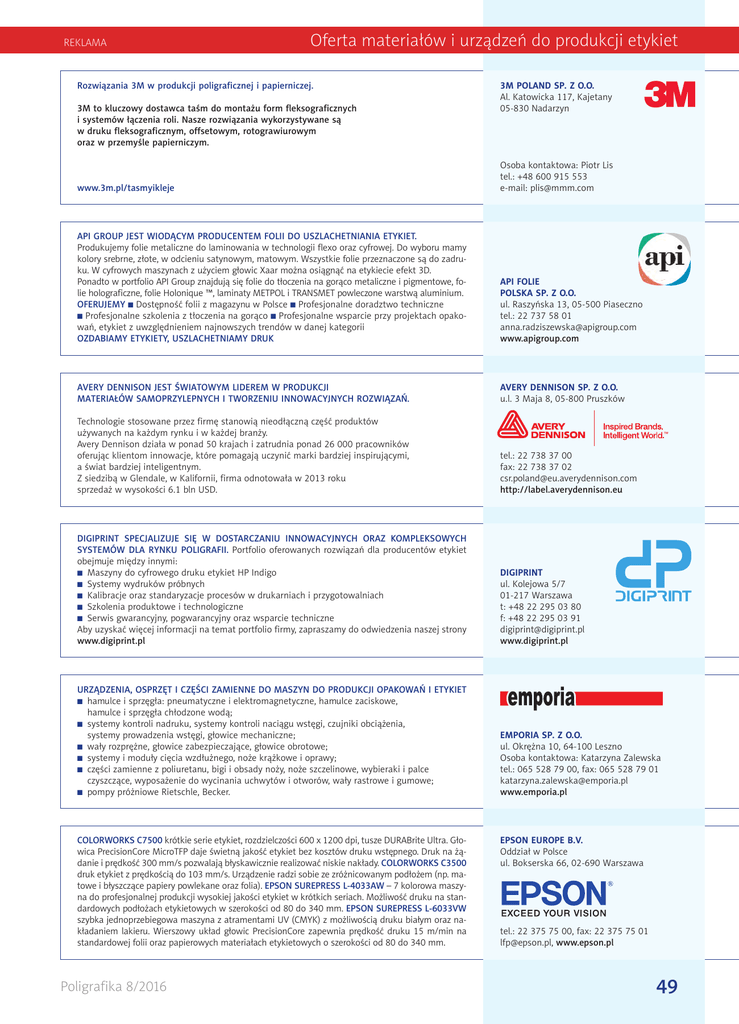 REKLAMA Oferta materiałów i urządzeń do produkcji etykiet rozwiązania 3m w produkcji poligraficznej i papierniczej. 3m to kluczowy dostawca taśm do montażu form fleksograficznych i systemów łączenia roli. nasze rozwiązania wykorzystywane są w druku fleksograficznym, offsetowym, rotograwiurowym oraz w przemyśle papierniczym. 3M poland sp. z o.o. Al. Katowicka 117, Kajetany 05-830 Nadarzyn www.3m.pl/tasmyikleje Osoba kontaktowa: Piotr Lis tel.: +48 600 915 553 e-mail: [email protected] Api group jEst WioDąCym proDuCEntEm folii Do uszlAChEtniAniA EtykiEt. Produkujemy folie metaliczne do laminowania w technologii flexo oraz cyfrowej. Do wyboru mamy kolory srebrne, złote, w odcieniu satynowym, matowym. Wszystkie folie przeznaczone są do zadruku. W cyfrowych maszynach z użyciem głowic Xaar można osiągnąć na etykiecie efekt 3D. Ponadto w portfolio API Group znajdują się folie do tłoczenia na gorąco metaliczne i pigmentowe, folie holograficzne, folie Holonique ™, laminaty METPOL i TRANSMET powleczone warstwą aluminium. ofErujEmy I Dostępność folii z magazynu w Polsce I Profesjonalne doradztwo techniczne I Profesjonalne szkolenia z tłoczenia na gorąco I Profesjonalne wsparcie przy projektach opakowań, etykiet z uwzględnieniem najnowszych trendów w danej kategorii ozDABiAmy EtykiEty, uszlAChEtniAmy Druk api FoliE polska sp. z o.o. ul. Raszyńska 13, 05-500 Piaseczno tel.: 22 737 58 01 [email protected] www.apigroup.com AVEry DEnnison jEst śWiAtoWym liDErEm W proDukCji mAtEriAłóW sAmoprzylEpnyCh i tWorzEniu innoWACyjnyCh rozWiązAń. aVEry dEnnison sp. z o.o. u.l. 3 Maja 8, 05-800 Pruszków Technologie stosowane przez firmę stanowią nieodłączną część produktów używanych na każdym rynku i w każdej branży. Avery Dennison działa w ponad 50 krajach i zatrudnia ponad 26 000 pracowników oferując klientom innowacje, które pomagają uczynić marki bardziej inspirującymi, a świat bardziej inteligentnym. Z siedzibą w Glendale, w Kalifornii, firma odnotowała w 2013 roku sprzedaż w wysokości 6.1 bln USD. tel.: 22 738 37 00 fax: 22 738 37 02 [email protected] http://label.averydennison.eu Digiprint spECjAlizujE siĘ W DostArCzAniu innoWACyjnyCh orAz komplEksoWyCh systEmóW DlA rynku poligrAfii. Portfolio oferowanych rozwiązań dla producentów etykiet obejmuje między innymi: I Maszyny do cyfrowego druku etykiet HP Indigo I Systemy wydruków próbnych I Kalibracje oraz standaryzacje procesów w drukarniach i przygotowalniach I Szkolenia produktowe i technologiczne I Serwis gwarancyjny, pogwarancyjny oraz wsparcie techniczne Aby uzyskać więcej informacji na temat portfolio firmy, zapraszamy do odwiedzenia naszej strony www.digiprint.pl digiprint ul. Kolejowa 5/7 01-217 Warszawa t: +48 22 295 03 80 f: +48 22 295 03 91 [email protected] www.digiprint.pl urząDzEniA, osprzĘt i CzĘśCi zAmiEnnE Do mAszyn Do proDukCji opAkoWAń i EtykiEt I hamulce i sprzęgła: pneumatyczne i elektromagnetyczne, hamulce zaciskowe, hamulce i sprzęgła chłodzone wodą; I systemy kontroli nadruku, systemy kontroli naciągu wstęgi, czujniki obciążenia, systemy prowadzenia wstęgi, głowice mechaniczne; I wały rozprężne, głowice zabezpieczające, głowice obrotowe; I systemy i moduły cięcia wzdłużnego, noże krążkowe i oprawy; I części zamienne z poliuretanu, bigi i obsady noży, noże szczelinowe, wybieraki i palce czyszczące, wyposażenie do wycinania uchwytów i otworów, wały rastrowe i gumowe; I pompy próżniowe Rietschle, Becker. EMporia sp. z o.o. ul. Okrężna 10, 64-100 Leszno Osoba kontaktowa: Katarzyna Zalewska tel.: 065 528 79 00, fax: 065 528 79 01 [email protected] www.emporia.pl ColorWorks C7500 krótkie serie etykiet, rozdzielczości 600 x 1200 dpi, tusze DURABrite Ultra. Głowica PrecisionCore MicroTFP daje świetną jakość etykiet bez kosztów druku wstępnego. Druk na żądanie i prędkość 300 mm/s pozwalają błyskawicznie realizować niskie nakłady. ColorWorks C3500 druk etykiet z prędkością do 103 mm/s. Urządzenie radzi sobie ze zróżnicowanym podłożem (np. matowe i błyszczące papiery powlekane oraz folia). Epson surEprEss l-4033AW – 7 kolorowa maszyna do profesjonalnej produkcji wysokiej jakości etykiet w krótkich seriach. Możliwość druku na standardowych podłożach etykietowych w szerokości od 80 do 340 mm. Epson surEprEss l-6033VW szybka jednoprzebiegowa maszyna z atramentami UV (CMYK) z możliwością druku białym oraz nakładaniem lakieru. Wierszowy układ głowic PrecisionCore zapewnia prędkość druku 15 m/min na standardowej folii oraz papierowych materiałach etykietowych o szerokości od 80 do 340 mm. Poligrafika 8/2016 Epson EuropE B.V. Oddział w Polsce ul. Bokserska 66, 02-690 Warszawa tel.: 22 375 75 00, fax: 22 375 75 01 [email protected], www.epson.pl 49 Oferta materiałów i urządzeń do produkcji etykiet REKLAMA EuropApiEr polskA jEst jEDnym z CzołoWyCh DystryButoróW poDłoży Do Druku i mEDióW Do rEklAmy W polsCE i EuropiE śroDkoWo-WsChoDniEj. Naszą ofertę opieramy na produktach renomowanych, międzynarodowych producentów. EuropapiEr polska sp. z o.o. Magazyn centralny: 05-870 Błonie k. Warszawy / Pass 20J tel.: +48 801 989 800, fax: +48 22 35 69 290 [email protected] www.europapier.pl Naszą ofertę materiałów do produkcji etykiet stanowią: Papiery etykietowe gładkie, płótnowane oraz suche i wodoodporne I Papiery i folie samoprzylepne I Papiery i folie samoprzylepne w formatach SRA3 I WWW.EuropApiEr-onlinE.pl flEXor jest marką obejmującą rodzinę maszyn o szerokości roboczej od 150 mm do 520 mm znajdujących zastosowanie w drukarniach fleksograficznych na wszystkich kontynentach. FlEXor / EMis sp. z o.o. ul. Jana Kochanowskiego 45/3, 01-864 Warszawa tel.: +48 22 560 30 80; fax; +48 22 560 30 89 e-mail: info@flexor.pl internet: www.flexor.pl youtube: www.youtube.com/flexor4u HkM sp. z o.o. ul. Rzemieślnicza 38 81-855 Sopot tel./fax: +48 58 550 79 51 tel./fax: +48 58 7