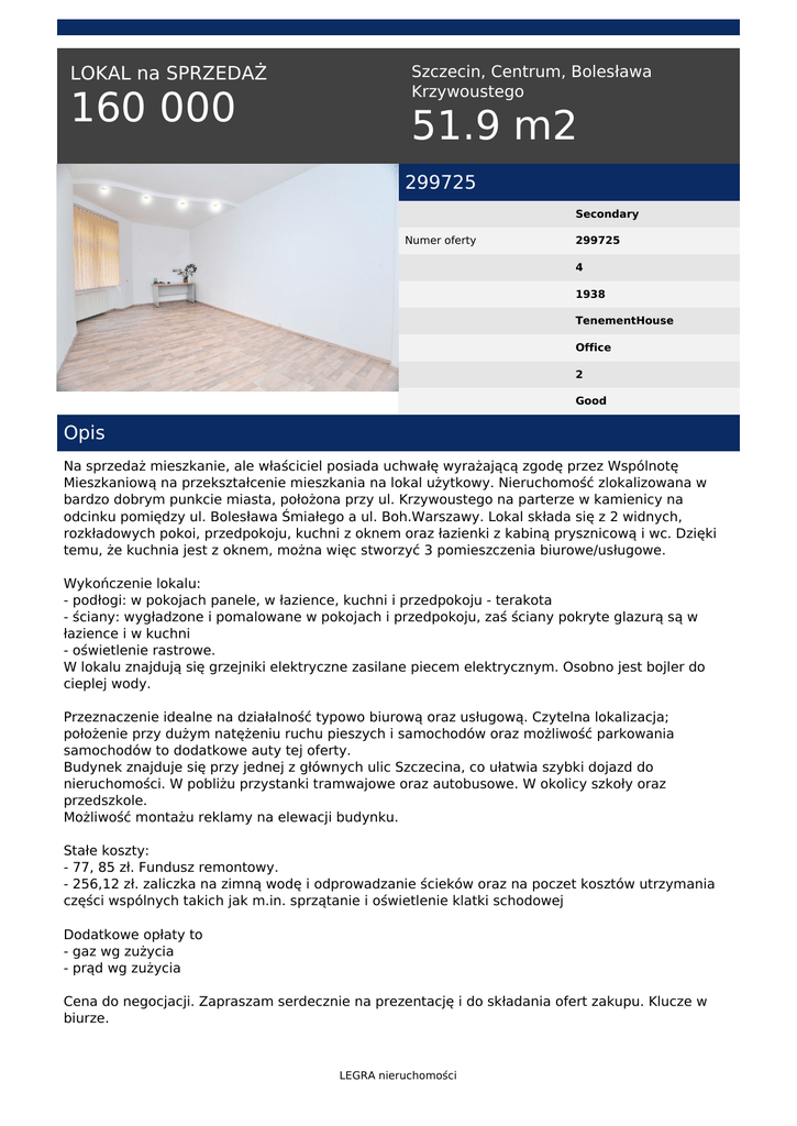 LOKAL na SPRZEDAŻ 160 000 Szczecin, Centrum, Bolesława Krzywoustego 51.9 m2 299725 Secondary Numer oferty 299725 4 1938 TenementHouse Office 2 Good Opis Na sprzedaż mieszkanie, ale właściciel posiada uchwałę wyrażającą zgodę przez Wspólnotę Mieszkaniową na przekształcenie mieszkania na lokal użytkowy. Nieruchomość zlokalizowana w bardzo dobrym punkcie miasta, położona przy ul. Krzywoustego na parterze w kamienicy na odcinku pomiędzy ul. Bolesława Śmiałego a ul. Boh.Warszawy. Lokal składa się z 2 widnych, rozkładowych pokoi, przedpokoju, kuchni z oknem oraz łazienki z kabiną prysznicową i wc. Dzięki temu, że kuchnia jest z oknem, można więc stworzyć 3 pomieszczenia biurowe/usługowe. Wykończenie lokalu: - podłogi: w pokojach panele, w łazience, kuchni i przedpokoju - terakota - ściany: wygładzone i pomalowane w pokojach i przedpokoju, zaś ściany pokryte glazurą są w łazience i w kuchni - oświetlenie rastrowe. W lokalu znajdują się grzejniki elektryczne zasilane piecem elektrycznym. Osobno jest bojler do cieplej wody. Przeznaczenie idealne na działalność typowo biurową oraz usługową. Czytelna lokalizacja; położenie przy dużym natężeniu ruchu pieszych i samochodów oraz możliwość parkowania samochodów to dodatkowe auty tej oferty. Budynek znajduje się przy jednej z głównych ulic Szczecina, co ułatwia szybki dojazd do nieruchomości. W pobliżu przystanki tramwajowe oraz autobusowe. W okolicy szkoły oraz przedszkole. Możliwość montażu reklamy na elewacji budynku. Stałe koszty: - 77, 85 zł. Fundusz remontowy. - 256,12 zł. zaliczka na zimną wodę i odprowadzanie ścieków oraz na poczet kosztów utrzymania części wspólnych takich jak m.in. sprzątanie i oświetlenie klatki schodowej Dodatkowe opłaty to - gaz wg zużycia - prąd wg zużycia Cena do negocjacji. Zapraszam serdecznie na prezentację i do składania ofert zakupu. Klucze w biurze. LEGRA nieruchomości LEGRA Nieruchomości Szczecin, ul. Monte Cassino 18A lok. nr 25-24 LEGRA nieruchomości tel. 91-83-141-89 email: [email protected] LEGRA nieruchomości Powered by TCPDF (www.tcpdf.org)