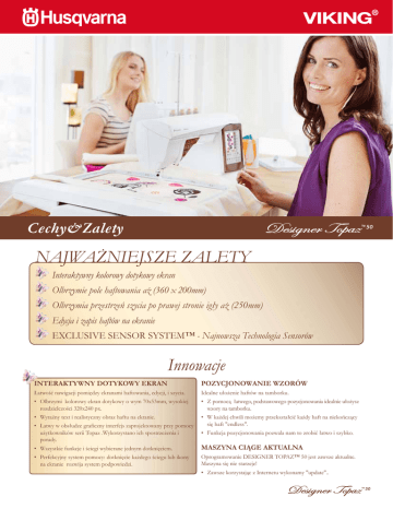 Cechy&Zalety NAJWAŻNIEJSZE ZALETY Interaktywny kolorowy dotykowy ekran Olbrzymie pole haftowania aż (360 x 200mm) Olbrzymia przestrzeń szycia po prawej stronie igły aż (250mm) Edycja i zapis haftów na ekranie EXCLUSIVE SENSOR SYSTEM™ - Najnowsza Technologia Sensorów Innowacje INTERAKTYWNY DOTYKOWY EKRAN POZYCJONOWANIE WZORÓW Łatwość nawigacji pomiędzy ekranami haftowania, edycji, i szycia. Idealne ułożenie haftów na tamborku. • Olbrzymi kolorowy ekran dotykowy o wym 70x53mm, wysokiej rozdzielczości 320x240 px. • Z pomocą łatwego, podstawowego pozycjonowania idealnie ułożysz wzory na tamborku. • Wyraźny text i realistyczny obraz haftu na ekranie. • W każdej chwili możemy przekształcić każdy haft na niekończący się haft "endless". • Łatwy w obsłudze graficzny interfejs zaprojektowany przy pomocy użytkowników serii Topaz .Wykorzystano ich spostrzeżenia i porady. • Funkcja pozycjonowania pozwala nam to zrobić łatwo i szybko. • Wszystkie funkcje i ściegi wybierane jednym dotknięciem. maszyna CiĄGE AKTUALNA • Perfekcyjny system pomocy: dotknięcie każdego ściegu lub ikony na ekranie rozwija system podpowiedzi. Oprogramowanie DESIGNER TOPAZ™ 50 jest zawsze aktualne. Maszyna się nie starzeje! • Zawsze korzystając z Internetu wykonamy "update".. Szycie każdego ściegu techniką "free motion" przy wyłączonym przesuwie materiału Łatwe pikowanie i wykonywanie pięknych haftów przy wykorzystaniu spośród wszystkich wybranych sciegów. OPROGRAMOWANIE ZAWARTE W MASZYNIE Pobierz najnowsze oprogramowanie do połączenia hafciarki z komputerem ze strony www. www.husqvarnaviking.com. • Organizuj swoją bibliotekę haftów, dadaj czy usuń komendy cięcia nici, twórz obrazy plików, drukuj katalogi itp. • Wybierz jedną z technik "Free Motion Floating" lub "Free Motion Spring" z SET-Menu. • Stwórz każdą literę TrueType™ czy alfabet z czcionek w komputerze używając QuickFont program. FUNKCJA START/STOP OPCJONALNIE OPROGRAMOWANIE 6D™ PREMIER® • Dodatkowe oprogramowanie doda nowy wymiar możliwości do Twoich projektów. Łatwiejsze szycie bez używania regulatora obrotów. • Funkcje Start/Stop do rozpoczęcia i zatrzymania szycia. • Doskonała przy szyciu ściegów dekoracyjnych, ściegów ozdobnych, pikowania czy wykonywania dziurek pod guzika. • Idealne rozwiązanie dla osób nie w pełni sprawnych. PROJEKT I WYKONANIE PRZEZ SZWEDZKICH INŻYNIERÓW HUSQVARNA VIKING® marka znana od 140 lat. Najwyższa jakość i najnowsze technologie! • Program 6D™ Premier uwolni Twoją wyobraźnię. OPROGRAMOWANIE TruEmbroidery™ TAKŻE DLA KOMUTERÓW MAC® • Zupełnie nowe oprogramowanie dla komputerów MAC® z systemem opracyjnym Leopard. www.myembroideries.com Tysiące wzorów jest dostępnych na w/w stronie. Możliwości EDYCJA I ZAPIS Nowe możliwości i doświadczenie w łatwym łączeniu pięknych haftów i napisów bezpośrednio na ekranie ROTACJA/SKALOWANIE/ODBICIA LUSTRZANE • Personalizacja Twoich haftów bezposrednio na tamborku. ŁĄCZENIE I ZAPIS HAFTÓW • Twórz nowe kombinacje haftów i liter czy samych haftów i zapisz je w pamięci maszyny lub na kluczu pamięci USB. OLBRZYMIE POLE HAFTU Możesz tworzyć wzory o wielkości (360x200mm) bez potrzeby przesuwania materiału w tamborku. • Dwa tamborki zawarte wyposażeniu hafciarki ; DESIGNER™ Royal Hoop o wielkości 360x200mm i tamborek DESIGNER™ Splendid Square Hoop o wielkości 120x120mm. • Wiele specjalnych opcjonalnych tamborków jest dodtępnych do wykorzystania specjalnych technik takich jak haftowanie nieskończenie dugich haftów, pikowanie , texturowanie haftów i wiele innych. • HUSQVARNA VIKING® nieustannie rozwijane projekty nowych tamborków i akcesoriów dla różnych technik szycia. DUŻA POWIERZCHNIA SZYCIA Idealna do szycia dużych powierzchni, pikowania, szycia domowych projektów czy odzieży. • Olbrzymia przestrzeń po prawej strony igły, aż 250 mm do swobodnego szycia! WYBÓR WZORÓW Nieograniczone możliwości twórcze. • 150 pięknych haftów do wyboru w nowej maszynie do szycia hafciarki DESIGNER TOPAZ™ 50. • Wszystkie wzory z automatycznym obcinaniem ściegów przeskokowych. • 2 zestawy specjalnych dużych czcionek w 3 różnych wielkościach do oznaczania swoich projektów. • 261 ściegów. • Ściegi o szerokości 7mm. • 5 programowalnych zestawów czcionek, małych i dużych liter. Wygoda UNIKALNY SYSTEM CZUJNIKÓW Automatycznie i ciągle dostosowuje docisk stopki do grubości materiału, dla jego równomiernego podawania. CZUJNIK PODNOSZENIA STOPKI • Stopka jest podnoszona i opuszczana automatycznie dla każdej techniki szycia. . • Cztery pozycje stopki: dolna,pivot,górna, górna z dodatkową przestrzenią pod stopką. CZUJNIK POZYCJI PIVOT • Zatrzymuje maszynę z igłą w materiale,syopka wyczuwa grubość materiału.Możliwość swobodnego poruszania materiałem pod stopką-obrót materiału przy pikowaniu,naszywaniu aplikacji. AUTOMATYCZNE OBCINANIE ŚCIEGÓW PRzESKOKOWYCH Eliminuje czasochłonne wycinanie długich ściegów z gotowego haftu. • Automatycznie obcina długie ściegi przeskokowe. • Przeciaga końcówki nitek na lewą stronę materiału. CZUJNIK GÓRNEJ I DOLNEJ NITKI Z SYGNALIZACJĄ ŚWIETLNĄ Maszyna zatrzymuje się i sygnalizuje dźwiękiem i sygnałem świetlnym zerwanie lub brak górnej lub dolnej nitki. • Nie ma potrzeby sprawdzania górnej i dolnej nitki podczas szycia i haftowania. EKSKLUZYWNY PORADNIK SZYCIA Wprowadzając rodzaj materiału i technikę szycia PORADNIK SZYCIA automatycznie wykona za Ciebie wszystkie ustawienia maszyny. • Ustawinienie najlepszego ściegu, jego długości i szerokości,naprężenia nitki, docisk stopki oraz prędkości szycia jednym dotknięciem przycisku. • Najlepszy ścieg wyświetlany jest na ekranie z podaniem\ zalecanego rodzaju stopki, grubości i rodzaju igły. AUTOMATYCZNY NÓŻ OŚWIETLENIE LED Pozwala na łatwe zako