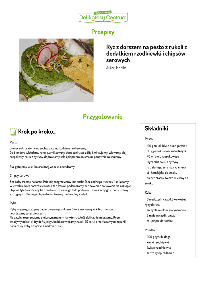 Przepisy Ryż z dorszem na pesto z rukoli z dodatkiem rzodkiewki i chipsów serowych Autor: Monika Przygotowanie Krok po kroku... Pesto Słonecznik prażymy na suchej patelni, studzimy i miksujemy. Do blendera wkładamy rukolę, zmiksowany słonecznik, ser żółty i miksujemy. Wlewamy olej rzepakowy, soku z cytryny, doprawiamy solą i pieprzem do smaku, ponownie miksujemy. Składniki Pesto: · 100 g rukoli (dwie duże garście) · 50 g pestek słonecznika (4 łyżki) · 70 ml oleju rzepakowego · 1 łyżeczka soku z cytryny Ryż gotujemy w lekko osolonej wodzie, odcedzamy. Chipsy serowe Ser żółty trzemy na tarce. Patelnię rozgrzewamy i na suchą (bez żadnego tłuszczu !) układamy w kształcie koła bardzo cieniutko ser. Powoli podsmażamy, ser powinien całkowicie się roztopić i być na tyle twardy, aby bez problemu można go było podnieść. Odwracamy go i „podsuszamy” z drugiej str. Ciepłego chipsa formułujemy na dowolny kształt. Ryba Rybę myjemy, suszymy papierowym ręcznikiem. Skórę nacinamy w kilku miejscach i oprószamy solą i pieprzem. Na patelni rozgrzewamy olej z cynamonem i anyżem, całość delikatnie mieszamy. Rybę smażymy od str. skóry do ¾ jej grubości, odwracamy na ok. 20 sek. i przekładamy na ręcznik papierowy, żeby odsączyć z nadmiaru oleju. · 15 g startego sera np. radamera · sól himalajska do smaku · pieprz czarny świeżo mielony do smaku Ryba: · 6 niedużych kawałków świeżej ryby dorsza · szczypta mielonego cynamonu · 3 małe gwiazdki anyżu · sól, pieprz do smaku Pnadto: · 200 g ryżu białego · kiełki rzodkiewki · świeża rzodkiewka · ser żółty np. radamer