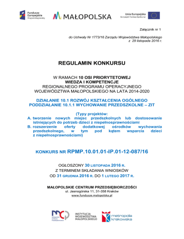 Załącznik nr 1 do Uchwały Nr 1773/16 Zarządu Województwa Małopolskiego z 29 listopada 2016 r. REGULAMIN KONKURSU W RAMACH 10 OSI PRIORYTETOWEJ WIEDZA I KOMPETENCJE REGIONALNEGO PROGRAMU OPERACYJNEGO WOJEWÓDZTWA MAŁOPOLSKIEGO NA LATA 2014-2020 DZIAŁANIE 10.1 ROZWÓJ KSZTAŁCENIA OGÓLNEGO PODDZIAŁANIE 10.1.1 WYCHOWANIE PRZEDSZKOLNE – ZIT (Typy projektów: A. tworzenie nowych miejsc przedszkolnych lub dostosowanie istniejących do potrzeb dzieci z niepełnosprawnościami B. rozszerzenie oferty dodatkowej ośrodków wychowania przedszkolnego, w tym pod kątem wsparcia dzieci z niepełnosprawnościami) KONKURS NR RPMP.10.01.01-IP.01-12-087/16 OGŁOSZONY 30 LISTOPADA 2016 R. Z TERMINEM SKŁADANIA WNIOSKÓW OD 31 GRUDNIA 2016 R. DO 1 LUTEGO 2017 R. MAŁOPOLSKIE CENTRUM PRZEDSIĘBIORCZOŚCI ul. Jasnogórska 11, 31-358 Kraków www.fundusze.malopolska.pl Spis treści Rozdział 1 .................................................................................................................. 3 POSTANOWIENIA OGÓLNE .................................................................................... 3 Podrozdział 1.1 Informacje ogólne .....................................................................................................................3 Podrozdział 1.2 Wykaz skrótów i definicji.........................................................................................................4 Podrozdział 1.3 Podstawa prawna i dokumenty programowe konkursu ............................................... 10 Podrozdział 1.4 Terminy i doręczenia ............................................................................................................. 12 Podrozdział 1.5 Forma i sposób udzielania informacji w kwestiach dotyczących konkursu............ 14 Podrozdział 1.6 System e-RPO......................................................................................................................... 14 Podrozdział 1.7 Wymagania dotyczące wniosku o dofinansowanie projektu ...................................... 16 Rozdział 2 ................................................................................................................ 17 PODSTAWOWE INFORMACJE NA TEMAT KONKURSU ..................................... 17 Podrozdział 2.1 Termin naboru wniosków o dofinansowanie projektów............................................... 17 Podrozdział 2.2 Podmioty uprawnione do ubiegania się o dofinansowanie realizacji projektu (Beneficjenci) ......................................................................................................................................................... 18 Podrozdział 2.3 Przedmiot konkursu – typy projektów oraz ostateczni odbiorcy wsparcia (Grupy docelowe) ............................................................................................................................................................... 20 Podrozdział 2.4 Szczegółowe wymogi dotyczące realizacji projektów................................................... 21 Podrozdział 2.5 Wskaźniki i monitorowanie postępu rzeczowego projektu.......................................... 31 Podrozdział 2.6 Dofinansowanie projektów ................................................................................................... 33 Podrozdział 2.7 Kwalifikowalność wydatków ............................................................................................... 34 Rozdział 3 ................................................................................................................ 36 PROCEDURA WYBORU PROJEKTÓW ................................................................. 36 Podrozdział 3.1 Weryfikacja wymogów formalnych.................................................................................... 36 Podrozdział 3.2 Ocena formalno-merytoryczna wniosków ....................................................................... 37 Podrozdział 3.3 Kryteria wyboru projektów .................................................................................................. 38 Podrozdział 3.4 Informacje kierowane do Wnioskodawcy ........................................................................ 40 Podrozdział 3.5 Podanie do publicznej wiadomości wyników konkursu............................................... 41 Rozdział 4 PROCEDURA ZAWARCIA UMOWY O DOFINANSOWANIE .............. 41 Rozdział 5 PROCEDURA ODWOŁAWCZA ............................................................ 42 Rozdział 6 POSTANOWIENIA KOŃCOWE ............................................................ 42 2 Rozdział 1 POSTANOWIENIA OGÓLNE Podrozdział 1.1 Informacje ogólne 1. Konkurs ogłoszony zostaje przez: Małopolskie Centrum Przedsiębiorczości (MCP) z siedzibą w Krakowie, ul. Jasnogórska 11, 31-358 Kraków oraz Związek ZIT - Stowarzyszenie Metropolia Krakowska (SMK) z siedzibą w Krakowie, ul. Reymonta 20, 30-059 Kraków zwane dalej Instytucjami Organizującymi Konkurs (IOK), pełniącymi jednocześnie rolę Instytucji Pośredniczących (IP) Regionalnego Programu Operacyjnego Województwa Małopolskiego na lata 2014-2020. 2. Regulamin niniejszego konkursu, zwany dalej Regulaminem, określa przedmiot i zasady konkursu nr RPMP.10.01.01-IP.01-12-087/16 ogłoszonego w ramach Działania 10.1 Rozwój kształcenia ogólnego, Poddziałania 10.1.1 Wychowanie przedszkolne – ZIT Regionalnego Programu Operacyjnego Województwa Małopolskiego na lata 2014-2020. 3. Projekty składane w ramach konkursu muszą realizować: CEL TEMATYCZNY 10: Inwestowanie w kształcenie, szkolenie oraz szkolenie zawodowe na rzecz zdobywania umiejętności i uczenia się przez całe życie, PRIORYTET INWESTYCYJNY 10i: Ograniczenie i zapobieganie przedwczesnemu kończeniu nauki szkolnej oraz zapewnianie równego dostępu do dobrej jakości wczesnej edukacji elementarnej oraz kształcenia podstawowego, gimnazjalnego i ponadgimnazjalnego, z uwzględnieniem formalnych, nieformalnych i