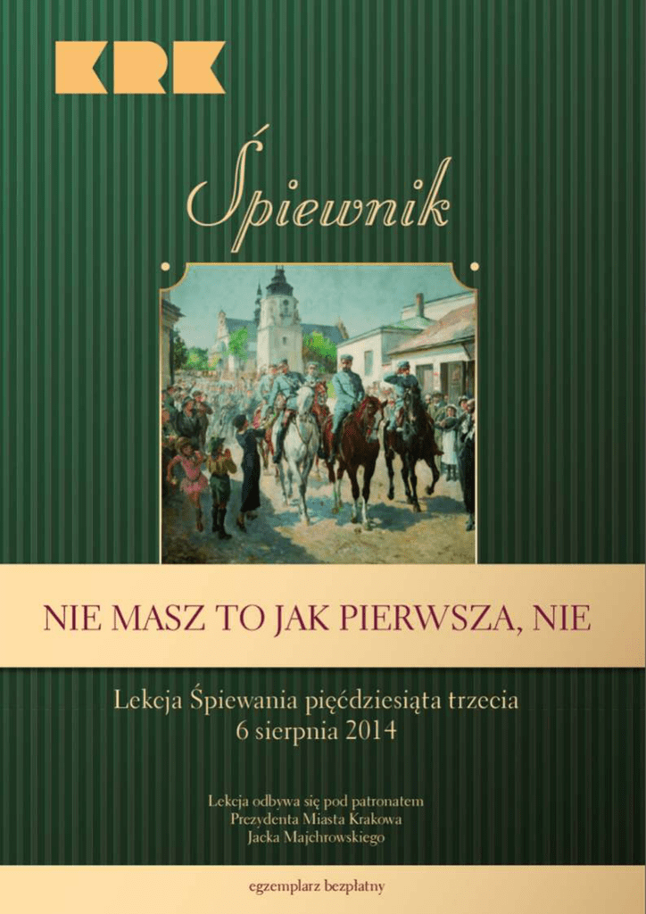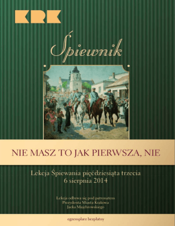 Śpiewnik NIE MASZ TO JAK PIERWSZA, NIE Rys. K. Sichulski XLIX (34. po wojnie) MARSZ I KOMPANII KADROWEJtrzecia Lekcja SZLAKIEM Śpiewania pięćdziesiąta 6 sierpnia 2014 Lekcja odbywa się pod patronatem Prezydenta Miasta Krakowa Jacka Majchrowskiego Świętujemy w tym roku w Krakowie 100. rocznicę Czynu Niepodległościowego Legionów Polskich oraz kolejną edycję trwającego od lat patriotycznego fenomenu, jakim jest Marsz Szlakiem I Kompanii Kadrowej, odbywający się rokrocznie w sierpniu na trasie z krakowskich Oleandrów do Kielc, śladem oddziałów strzeleckich Józefa Piłsudskiego z 1914 roku. W Kadrówce jest wszystko: historia, entuzjazm, wytrwałość i konsekwencja godna legionów pod wodzą Marszałka, a przede wszystkim radość „ułanów – malowanych dzieci”. To już tradycja, że krakowianie wspólnie świętując, także wspólnie śpiewają. Tegoroczna, 53. Lekcja Śpiewania to doskonała okazja, by rozgrzewać serca melodiami, które wciąż są z nami, choć powstały często sto lat temu na froncie, w okopach, w marszu i w bitwach. Gorąco zapraszam do radosnego świętowania, by pamięć o wielkim legionowym czynie nie zaginęła! Jacek Majchrowski Prezydent Miasta Krakowa KOMENDANT MARSZU SZLAKIEM KADRÓWKI PREZES ZWIĄZKU PIŁSUDCZYKÓW R ankiem 6 sierpnia 1914 r. w krakowskich Oleandrach zabrzmiała pieśń „Hej, strzelcy wraz, nad nami Orzeł Biały”. Młodzi szaleńcy niepodległości poszli z jej słowami na ustach ku granicy w Michałowicach, aby na rozkaz Józefa Piłsudskiego rozpocząć bój o wolność Polski. Ich ówczesny marsz ku wolności trwał cztery lata i zakończył się wielkim sukcesem. W listopadzie 1918 r. Rzeczypospolita powróciła na mapy Europy po ponad półtorawiekowej niewoli. Na tej drodze do wolności towarzyszyła im piosenka. Była ona taka jak losy żołnierskie. Wyrażała i brawurę ułanów „malowanych dzieci”, i radość „Kadrówki, co rusza na Moskala”, i smutek za Jasieńkiem, „co pod Wilnem gdzieś w wojence padł”, i rycerską dumę „Pierwszej Brygady”. Po latach Marszałek Józef Piłsudski bardzo trafnie stwierdzał, iż „kulturę polską ożywiły pieśni żołnierskie. Jeżeli pieśń ma jakieś znaczenie, jeżeli to, co jest piękne, co odpowiada głębokiej potrzebie duszy, ma jakiś wpływ – to pieśń żołnierska”. Pieśń ta dawała siłę, krzepiła ducha i podtrzymywała cechę, którą przed wiekiem Stefan Żeromski, obserwujący działania Józefa Piłsudskiego i jego strzelców, określał mianem „niewzruszonej wiary” w niepodległość Polski. W wigilię 100. rocznicy Legionowego Czynu Niepodległościowego i w przededniu kolejnego Marszu Szlakiem I Kompanii Kadrowej wiodącego z Krakowa do Kielc, gromadzimy się, aby wspólnie z Lochem Camelot i Biblioteką Polskiej Piosenki śpiewać pieśni tamtego czasu. To wspaniała tradycja, która pozwala nam poczuć wiatr historii. A i zastanowić się nad przesłaniem, jakie strzelcy sprzed stu lat pozostawili nam współczesnym w „najdumniejszej pieśni jaką Polska stworzyła”, jak nazwał „Pierwszą Brygadę” Józef Piłsudski: Chcieć – to móc! Jan Józef Kasprzyk KTO? TY JESTEŚ! Dzięki nim jesteś i to im zawdzięczasz. Co? Musisz rozstrzygnąć we własnym sumieniu. Można uwolnić się od historii i zobowiązań i zostać N iezależnym I ndywidualnym K omfortowym I dealnym M akroplanktonem Cieszymy się, że jesteście znowu z nami, aby razem śpiewać i świętować w przeddzień wielkiej rocznicy 6 sierpnia 1914 roku. Wtedy właśnie zabrzmiały tu w Krakowie pierwsze kroki w drodze ku Odrodzeniu. Wasz CZERWONE MAKI NA MONTE CASSINO Biblioteka Polskiej Piosenki informuje, że ubiega się o nabycie praw do melodii pieśni „Czerwone Maki na Monte Cassino”. W chwili obecnej posiadaczem tych praw jest Wolne Państwo Bawaria, niemiecki kraj związkowy. Podczas II wojny światowej Niemcy stworzyli we Włoszech linię Gustawa, której kluczową twierdzą była kolebka Benedyktynów – klasztor na Monte Cassino. Przez wiele miesięcy wzgórze było nie do zdobycia. W walkach o Monte Cassino brali udział m.in.: Brytyjczycy, Kanadyjczycy, Amerykanie, oddziały z Nowej Zelandii oraz Indii. W sumie około 20 narodowości. Ostatecznie szturmu podjęli się Polacy pod dowództwem gen. Władysława Andersa. Walcząc w ekstremalnych warunkach, żołnierze zdobywali to wzgórze w dniach 12-18 maja 1944 r. W krwawych walkach poległo 860 żołnierzy i oficerów polskich, a prawie 3 tys. odniosło rany. Po stronie aliantów straty wyniosły blisko 30 tysięcy zabitych. Wygrana bitwa otworzyła drogę do wyzwolenia Italii. W nocy z 17 na 18 maja 1944 roku, na kilka godzin przed zdobyciem klasztoru, w siedzibie Teatru Żołnierza Polskiego przy 2 Korpusie Sił Zbrojnych w Campobasso Feliks Konarski, żołnierz 2 Korpusu, pisze pierwsze dwie zwrotki do Pieśni „Czerwone Maki na Monte Cassino”. W tym samym czasie, jego przyjaciel Alfred Schütz komponuje muzykę. Wkrótce po wygranej bitwie, Gwidon Borucki po raz pierwszy zaśpiewał „Maki…” w czasie uroczystej akademii zorganizowanej dla żołnierzy 12. Pułku Ułanów Podolskich, zdobywców Monte Cassino… W wyniku zawiłości historii oraz losów autora pieśni Alfreda Schütza dysponentem praw do melodii stała się niemiecka organizacja zarządzająca prawami autorskimi – GEMA (odpowiednik polskiego ZAIKS-u). Wobec objęcia władzy w Polsce po wojnie przez siły komunistyczne, Schütz osiedlił się w Monachium, gdzie zmarł w 1999 roku. W kilka lat później zmarła również jego żona, Veronika Schütz, nie pozostawiając żadnych spadkobierców. Zgodnie z prawem niemieckim (art. 1936 BGB) spadkobiercą praw do melodii stała się tym samym Bawaria. Potwierdzono ten stan rzeczy w dniu 17 marca 2011 roku postanowieniem o sygnaturze 69 VI 3108/04 przez sąd niemiecki (Ausfertigung Amtsgericht Munchen). Obecnie zyski za każde wykonanie tej pieśni (