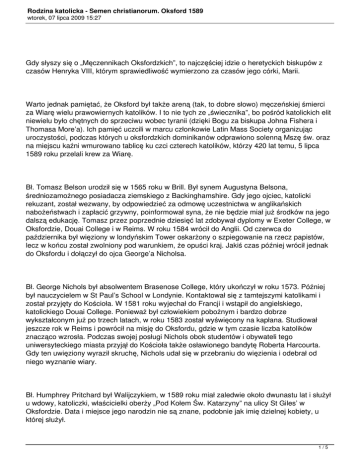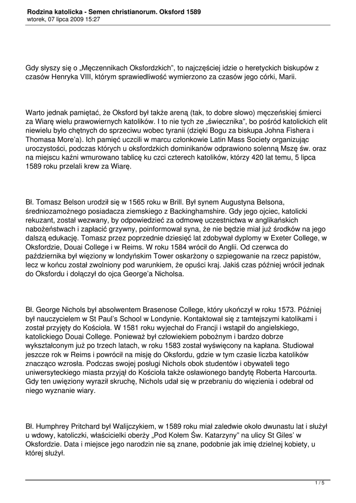 Rodzina katolicka - Semen christianorum. Oksford 1589 wtorek, 07 lipca 2009 15:27 Gdy słyszy się o „Męczennikach Oksfordzkich”, to najczęściej idzie o heretyckich biskupów z czasów Henryka VIII, którym sprawiedliwość wymierzono za czasów jego córki, Marii. Warto jednak pamiętać, że Oksford był także areną (tak, to dobre słowo) męczeńskiej śmierci za Wiarę wielu prawowiernych katolików. I to nie tych ze „świecznika”, bo pośród katolickich elit niewielu było chętnych do sprzeciwu wobec tyranii (dzięki Bogu za biskupa Johna Fishera i Thomasa More’a). Ich pamięć uczcili w marcu członkowie Latin Mass Society organizując uroczystości, podczas których u oksfordzkich dominikanów odprawiono solenną Mszę św. oraz na miejscu kaźni wmurowano tablicę ku czci czterech katolików, którzy 420 lat temu, 5 lipca 1589 roku przelali krew za Wiarę. Bł. Tomasz Belson urodził się w 1565 roku w Brill. Był synem Augustyna Belsona, średniozamożnego posiadacza ziemskiego z Backinghamshire. Gdy jego ojciec, katolicki rekuzant, został wezwany, by odpowiedzieć za odmowę uczestnictwa w anglikańskich nabożeństwach i zapłacić grzywny, poinformował syna, że nie będzie miał już środków na jego dalszą edukację. Tomasz przez poprzednie dziesięć lat zdobywał dyplomy w Exeter College, w Oksfordzie, Douai College i w Reims. W roku 1584 wrócił do Anglii. Od czerwca do października był więziony w londyńskim Tower oskarżony o szpiegowanie na rzecz papistów, lecz w końcu został zwolniony pod warunkiem, że opuści kraj. Jakiś czas później wrócił jednak do Oksfordu i dołączył do ojca George’a Nicholsa. Bł. George Nichols był absolwentem Brasenose College, który ukończył w roku 1573. Później był nauczycielem w St Paul’s School w Londynie. Kontaktował się z tamtejszymi katolikami i został przyjęty do Kościoła. W 1581 roku wyjechał do Francji i wstąpił do angielskiego, katolickiego Douai College. Ponieważ był człowiekiem pobożnym i bardzo dobrze wykształconym już po trzech latach, w roku 1583 został wyświęcony na kapłana. Studiował jeszcze rok w Reims i powrócił na misję do Oksfordu, gdzie w tym czasie liczba katolików znacząco wzrosła. Podczas swojej posługi Nichols obok studentów i obywateli tego uniwersyteckiego miasta przyjął do Kościoła także osławionego bandytę Roberta Harcourta. Gdy ten uwięziony wyraził skruchę, Nichols udał się w przebraniu do więzienia i odebrał od niego wyznanie wiary. Bł. Humphrey Pritchard był Walijczykiem, w 1589 roku miał zaledwie około dwunastu lat i służył u wdowy, katoliczki, właścicielki oberży „Pod Kołem Św. Katarzyny” na ulicy St Giles’ w Oksfordzie. Data i miejsce jego narodzin nie są znane, podobnie jak imię dzielnej kobiety, u której służył. 1/5 Rodzina katolicka - Semen christianorum. Oksford 1589 wtorek, 07 lipca 2009 15:27 Bł. Richard Yaxley urodził się w 1560 roku w Bostonie, w Lincolnshire. W 1582 roku rozpoczął studia w Reims i został tam wyświęcony w roku 1586. Niebawem wrócił do Anglii. Podczas swojej podróży do Oksfordu zatrzymał się na krótko w Denham, by odwiedzić swego przyjaciela ze studiów, błogosławionego Roberta Dibdale, który był kapelanem katolickiej rodziny aż do dnia swego męczeństwa w Tyburn w 1586 roku. Wszyscy czterej zostali aresztowani w oberży „Pod Kołem Św. Katarzyny” w Oksfordzie (stała ona obok kościoła św. Marii Magdaleny, dokładnie naprzeciw ołtarza dedykowanego św. Katarzynie Aleksandryjskiej; obecnie część Balliol College). Szpiedzy donieśli władzom, że jest to głównie miejsce katolickiej aktywności w Oksfordzie. Prześladowcy najpierw przeszukali dom w Stanton St John należący do Henry’ego Rooke – znanego z tego, że udzielał schronienia katolickim księżom. Nikogo tam nie znalazłszy przyjechali w nocy do Oksfordu i usiłowali sforsować drzwi oberży. Służący Pritchard został aresztowany gdy tylko je otworzył, a oberżystka poprosiła o kilka minut na ubranie i w tym czasie ostrzegła śpiącego Belsona oraz księży Nicholsa i Yaxleya. Dom był jednak otoczony i nie było sposobu by mogli go opuścić niedostrzeżeni. Stanęli naprzeciw intruzów i odpowiedzieli na ich pytania tak, by nie dawać powodów do podejrzeń. Ci jednak przeszukali gruntownie gospodę i znaleźli w niej należące do kapłanów paramenta. Pozwalało to przypuszczać, że choć jeden z nich był księdzem i wszystkich aresztowano. Wraz z nimi oberżystkę i jej służącego. Gdy aresztanci z eskortą odjechali przyjaciele i sąsiedzi zniszczyli, lub ukryli pozostałe „dowody zbrodni”. Następnego dnia więźniowie zostali przesłuchani przez Martina Hetona, wicekanclerza uniwersytetu i kilku innych urzędników, wśród których był także Lillie, Mistrz Balliol College, i Willis, z St John’s College. Nichols i Yaxley – w nadziei uchronienia ich świeckich pomocników od zarzutu dawania schronienia zdrajcom – choć ujawnili, iż są katolikami, to odmówili przyznania, że są kapłanami. Jednak dowody znalezione w gospodzie świadczyły przeciwko nim i Nichols, jako starszy, wziął „winę” na siebie starając się przekonać przesłuchujących, że tylko on jest księdzem. Jednak wobec postawy Yaxleya, który nie był równie przekonujący jak Nichols, nie dano im wiary i uznano, że ten również musi być kapłanem. Świeccy zostali zamknięci na oksfordzkim zamku, a księża w starym więzieniu Bocardo znajdującym się w Bramie Północnej. Byli tam odwiedzani przez anglikańskich duchownych usiłujących skłonić ich argumentami teologicznymi do odstępstwa od „papistowskich zabobonów” – bez skutku. Wszyscy więźniowie zostali zakuci w kajdany i zaprowadzeni do Christ Church, gdzie pytano ich o innych katolików. Gdy odmówili udzielenia jakichkolwiek informacji kobieta została zwolniona za kaucją, a mężczyźni wysła