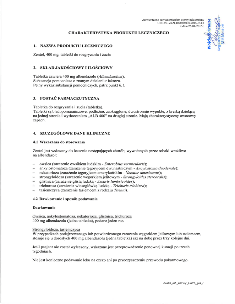 Dawkowanie u pacjentów w podeszłym wieku Doświadczenie kliniczne ze stosowaniem leku u pacjentów w wieku powyżej 65 lat jest ograniczone. Doniesienia wskazują, że nie ma konieczności zmiany dawkowania leku. U pacjentów w podeszłym wieku ze stwierdzoną zaburzoną czynnością wątroby albendazol należy stosować ze szczególną ostrożnością (patrz Dawkowanie u pacjentów z zaburzoną czynnością wątroby). Dawkowanie u pacjentów z zaburzoną czynnością nerek Klirens albendazolu i jego głównego metabolitu (sulfotlenku) nie zmienia się u pacjentów z zaburzeniami czynności nerek, ponieważ nerkowa eliminacja tych związków jest znikoma. Nie ma konieczności zmiany dawkowania leku. Należy kontrolować pacjentów ze stwierdzoną zaburzoną czynnością nerek. Dawkowanie u pacjentów z zaburzoną czynnością wątroby Zaburzenie czynności wątroby może mieć znaczący wpływ na farmakokinetykę głównego czynnego farmakologicznie metabolitu (sulfotlenku), ponieważ albendazol jest szybko metabolizowany w wątrobie do tego metabolitu. W czasie leczenia należy kontrolować pacjentów z zaburzeniami aktywności enzymów wątrobowych (aminotransferaz). Sposób podawania Zalecaną dawkę leku należy połknąć popijając wodą. Jeśli pacjent ma trudności z połykaniem całych tabletek, może je rozkruszyć, rozgryźć lub żuć, popijając niewielką ilością wody. U dzieci i pacjentów mających trudności z połykaniem tabletek zalecane jest stosowanie leku w postaci zawiesiny. 4.3 Przeciwwskazania Nadwrażliwość na albendazol lub którąkolwiek substancję pomocniczą. Przeciwwskazane jest stosowanie leku w czasie ciąży lub gdy podejrzewa się, że pacjentka jest w ciąży. 4.4 Specjalne ostrzeżenia i środki ostrożności dotyczące stosowania W celu uniknięcia zastosowania albendazolu we wczesnym okresie ciąży, zaleca się, aby u kobiet w wieku rozrodczym kurację tym lekiem przeprowadzać w ciągu pierwszych 7 dni od wystąpienia miesiączki lub po uzyskaniu ujemnego wyniku testu ciążowego. Leczenie albendazolem może ujawnić wągrzycę ośrodkowego układu nerwowego wcześniej przebiegającą bezobjawowo, szczególnie w regionach o dużej częstości występowania tasiemczycy. W wyniku reakcji zapalnej powodowanej przez obumieranie pasożytów w obrębie mózgu u pacjenta mogą wystąpić objawy neurologiczne, tj. drgawki, zwiększone ciśnienie śródczaszkowe oraz objawy ogniskowe. Objawy mogą pojawić się wkrótce po leczeniu i może być konieczne natychmiastowe rozpoczęcie podawania steroidów i leków przeciwdrgawkowych. Lek zawiera laktozę. Nie powinien być stosowany u pacjentów z rzadko występującą dziedziczną nietolerancją galaktozy, niedoborem laktazy (typu Lapp) lub zespołem złego wchłaniania glukozygalaktozy. Lek zawiera żółcień pomarańczową, która może powodować reakcje alergiczne. 4.5 Interakcje z innymi produktami leczniczymi i inne rodzaje interakcji W czasie jednoczesnego stosowania prazykwantelu, cymetydyny lub deksametazonu obserwowano w osoczu zwiększenie się stężenia aktywnego metabolitu albendazolu. 2 Zentel_tab_400 mg_ChPL_qrd_r Rytonawir, fenytoina, karbamazepina oraz fenobarbital mogą zmniejszać stężenia aktywnego metabolitu albendazolu (sulfotlenku albendazolu) w osoczu. Znaczenie kliniczne tej obserwacji nie jest znane, jednak jej skutkiem może być zmniejszona skuteczność, szczególnie podczas leczenia zarażeń układowych. U tych pacjentów należy kontrolować skuteczność leczenia. Konieczna może być modyfikacja dawkowania. 4.6 Wpływ na płodność, ciążę i laktację Ciąża Przeciwwskazane jest stosowanie leku w czasie ciąży lub gdy podejrzewa się, że pacjentka jest w ciąży (patrz punkt 4.3). W celu uniknięcia zastosowania albendazolu we wczesnym okresie ciąży, zaleca się, aby u kobiet w wieku rozrodczym kurację tym lekiem przeprowadzać w ciągu pierwszych 7 dni od wystąpienia miesiączki lub po uzyskaniu ujemnego wyniku testu ciążowego. Karmienie piersią Nie wiadomo czy albendazol lub jego metabolity przenikają do mleka ludzkiego. Dlatego produktu Zentel nie należy stosować u kobiet w okresie karmienia piersią, chyba że potencjalne korzyści przewyższą ryzyko związane z leczeniem. 4.7 Wpływ na zdolność prowadzenia pojazdów i obsługiwania maszyn Zentel nie ma wpływu lub wywiera nieistotny wpływ na zdolność prowadzenia pojazdów i obsługiwania maszyn. 4.8 Działania niepożądane Częstości występowania działań niepożądanych od ‘bardzo często’ do ‘rzadko’ określono na podstawie danych pochodzących z dużych badań klinicznych. Częstość występowania pozostałych działań niepożądanych została określona głównie na podstawie danych uzyskanych po wprowadzeniu produktu do obrotu i odnosi się do częstości zgłaszania, a nie do faktycznej częstości występowania. Przyjęto następujące zasady dla sporządzenia klasyfikacji częstości występowania: bardzo często: ≥1/10 często: ≥1/100, <1/10 niezbyt często: ≥1/1000, <1/100 rzadko: ≥1/10 000, <1/1000 bardzo rzadko: <1/10 000 Zaburzenia układu immunologicznego Rzadko: reakcje nadwrażliwości (takie jak wysypka, świąd i pokrzywka). Zaburzenia układu nerwowego Niezbyt często: ból głowy, zawroty głowy. Zaburzenia żołądka i jelit Niezbyt często: objawy ze strony górnego odcinka przewodu pokarmowego (np. ból w nadbrzuszu lub bóle brzucha, nudności, wymioty), biegunka. Zaburzenia wątroby i dróg żółciowych Rzadko: zwiększenie aktywności enzymów wątrobowych. Zaburzenia skóry i tkanki podskórnej Bardzo rzadko: rumień wielopostaciowy, zespół Stevensa-Johnsona. 3 Zentel_tab_400 mg_ChPL_qrd_r Zgłaszanie podejrzewanych działań niepożądanych Po dopuszczeniu produktu leczniczego do obrotu istotne jest zgłaszanie podejrzewanych działań niepożądanych. Umożliwia to nieprzerwane monitorowanie stosunku korzyści do ryzyka stosowania pro
