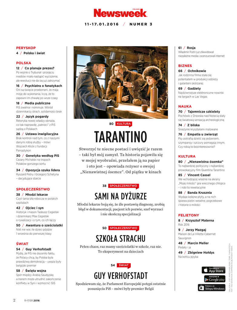 1 1 - 1 7. 0 1 . 2 0 1 6 / NUMER 3 PERYSKOP 61 / Rosja 4 / Polska i świat Władimir Putin już zlikwidował niezależne media i ocenzurował internet POLSKA BIZNES 12 / Co planuje prezes? 66 / Ochnikowie Po wojnie o Trybunał i przejęciu mediów miało nastąpić wyciszenie, ale rewolucji nie da się już zatrzymać Jak rodzinna firma stała się potentatem w produkcji odzieży i galanterii skórzanej 16 / Psychiatra o fanatykach 69 / Gadżety Oni są święcie przekonani, że mają misję do wykonania, liczą, że to zapewni im chwałę po wsze czasy Najdziwniejsze elektroniczne nowinki na targach w Las Vegas 18 / Media publiczne PiS zwalnia i nominuje. Wśród dziennikarzy strach, solidarności brak NAUKA 22 / Język pogardy Pochówki z Drawska nad Notecią stały się światową sensacją archeologiczną 70 / Tajemnicze szkielety Retoryka nowej władzy obnaża, co tak naprawdę „patrioci” z PiS sądzą o Polakach Brak kontroli nad tym, co z naszymi danymi robią służby – mówi Wojciech Klicki z fundacji Panoptykon 30 / Genetyka według PiS Cezary Michalski na tropach Polaków gorszego sortu 34 / Opozycja szuka lidera Ryszard Petru i Grzegorz Schetyna – decydujące starcie KULTURA Śnieżynki kryształami malowane TARANTINO Stworzyć te niecne postaci i uwięzić je razem – taki był mój zamysł. Ta historia pojawiła się w mojej wyobraźni, przelałem ją na papier i oto jest – opowiada reżyser o swojej „Nienawistnej ósemce”. Od piątku w kinach 38 SPOŁECZEŃSTWO SPOŁECZEŃSTWO 38 / Młodzi lekarze Czyli tania siła robocza w polskich szpitalach 42 / Ojciec i syn Historyk i mason Tadeusz Cegielski i dziennikarz Max Cegielski o rywalizacji i o tym, co ich łączy 50 / Awantura o sześciolatki Nikt nie wie, ile dzieci pójdzie 1 września do pierwszej klasy ŚWIAT 54 / Guy Verhofstadt Myślę, że PiS nie doceniło faktu, że Polacy chcą, by Polska była prawdziwą demokracją – uważa były belgijski premier 58 / Święta wojna Spór między Arabią Saudyjską a Iranem może utrudnić zakończenie konfliktu w Syrii i wzmocnić ISIS 2 11-17.01.2016 74 / Z bliska SAMI NA DYŻURZE Młodzi lekarze boją się, że źle postawią diagnozę, zrobią błąd w dokumentacji, pacjent ich pozwie, szef wyrzuci i nie skończą specjalizacji 76 / Empatia u zwierząt Psy potrafią dzielić się jedzeniem, szympansy i szczury pomagają innym. Czy robią to bezinteresownie? KULTURA 80 / „Nienawistna ósemka” To najbardziej polityczny i najbardziej prowokacyjny film Quentina Tarantino 85 / Vincent Cassel We wchodzącej właśnie na ekrany „Mojej miłości” gra wiecznego chłopca – i robi to rewelacyjnie 88 / Banda Krusznia Wydaje kolejne płyty, a na nich śpiewa pieśni weselne, pogrzebowe i historie o miłości FELIETONY 8 / Krzysztof Materna Rok 2016 50 SPOŁECZEŃSTWO SZKOŁA STRACHU Pełen chaos, raz mamy sześciolatki w szkole, raz nie. To eksperyment na dzieciach 9 / Jerzy Mazgaj Maison de La Villette Cabernet Sauvignon 48 / Marcin Meller Pedały i ja 49 / Zbigniew Hołdys Na końcu języka 54 ŚWIAT GUY VERHOFSTADT Spodziewam się, że Parlament Europejski potępi ostatnie posunięcia PiS – mówi były premier Belgii Download Pobierz ze from Sklepu Windows Windows Store OKŁADKA:. FOT. MARCIN KALIŃSKI, 123RF, THINKSTOCK FOT. THE WEINSTEIN COMPANY/ALBUM/EAST NEWS 26 / Ustawa inwigilacyjna 80
