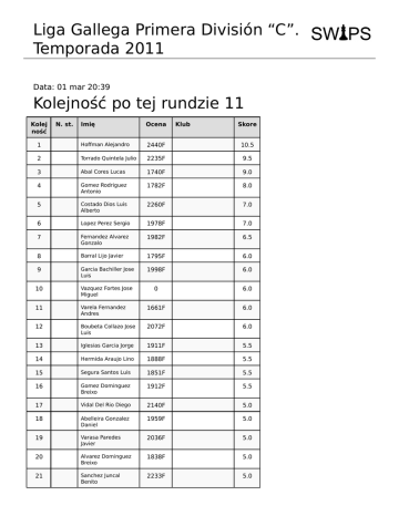 Liga Gallega Primera División “C”. Temporada 2011 Data: 01 mar 20:39 Kolejność po tej rundzie 11 Kolej ność N. st. Imię Ocena Klub Skore 1 Hoffman Alejandro 2440F 10.5 2 Torrado Quintela Julio 2235F 9.5 3 Abal Cores Lucas 1740F 9.0 4 Gomez Rodriguez Antonio 1782F 8.0 5 Costado Dios Luis Alberto 2260F 7.0 6 Lopez Perez Sergio 1978F 7.0 7 Fernandez Alvarez Gonzalo 1982F 6.5 8 Barral Lijo Javier 1795F 6.0 9 Garcia Bachiller Jose Luis 1998F 6.0 10 Vazquez Fortes Jose Miguel 0 6.0 11 Varela Fernandez Andres 1661F 6.0 12 Boubeta Collazo Jose Luis 2072F 6.0 13 Iglesias Garcia Jorge 1911F 5.5 14 Hermida Araujo Lino 1888F 5.5 15 Segura Santos Luis 1851F 5.5 16 Gomez Dominguez Breixo 1912F 5.5 17 Vidal Del Rio Diego 2140F 5.0 18 Abelleira Gonzalez Daniel 1959F 5.0 19 Varasa Paredes Javier 2036F 5.0 20 Alvarez Dominguez Breixo 1838F 5.0 21 Sanchez Juncal Benito 2233F 5.0 Kolej ność N. st. Imię Ocena Klub Skore 22 De La Torre Alfonso Jesus Angel 1916F 4.5 23 Gomez Dominguez Xabier 2061F 4.5 24 Gonzalez Levices Constantino 2019F 4.0 25 Perez Dominguez David 1791F 4.0 26 Misa Juncal Alberto 1882F 4.0 27 Dominguez Carnero Javier 1633F 4.0 28 Ogando Gonzalez Francisco J. 2011F 3.5 29 Agra Torres Alfonso 1868F 3.5 30 Perez Costa Alberto 1864F 3.5 31 Docampo Garcia David 1726F 3.5 32 Prol Lusquinos Jose Manuel 1792F 3.5 33 Prieto Penas Marcial 1963F 3.5 34 Palacios Gonzalez Miguel 1703F 3.5 35 Leiros Barreiro Iago 1753F 3.5 36 Rodriguez Dominguez Miguel I 1716F 3.0 37 Sousa Barreiro Bieito 1745F 3.0 38 Fondevila Maron Manuel 1862F 3.0 39 Pereira Antonio Pedro Caramez 2081F 3.0 40 Salazar Bernard Ignacio 2039F 2.5 41 Gomez Dieguez Adrian 1640F 2.5 42 Mougan Gonzalez Santiago 1765F 2.5 43 Anadon Manez Antonio 1829F 2.5 44 Doval Gonzalez Jose 1946F 2.5 45 Alvarez Fernandez Manuel 2031F 2.0 46 Vazquez Dorrio Angel Manuel 1860F 2.0 Kolej ność N. st. Imię Ocena Klub Skore 47 Baldwin Del Castillo Ricardo 2017F 2.0 48 Arellano Pardo Martin 1868F 2.0 49 Gonzalez Rodriguez Agapito 1830F 2.0 50 Suarez Fidalgo Alvaro 1868F 2.0 51 Cebrian Ramos Jose Luis 2056F 2.0 52 Boado Rodriguez Martin 2152F 2.0 53 Margarido Ricardo Emanuel Torre 1944F 2.0 54 Gonzalez Roca Pablo 2024F 2.0 55 Conde Carvajal Juan Delfin 1880F 2.0 56 Suarez Gomez Julio 1770F 2.0 57 Vidal Fernandez Pablo 0 1.5 58 Lorenzo Dieguez Manuel 1534F 1.5 59 Cid Liston Ramon 1556F 1.5 60 Alvarez Fernandez Jose Antonio 1950F 1.5 61 Hernandez Heras Santiago 1975F 1.5 62 Cabanas Rodriguez Roi 1846F 1.5 63 Cruz Guerra Samuel 1792F 1.0 64 Gonzalez Costas Elvia 1926F 1.0 65 Fernandez Andrade Antonio 1825F 1.0 66 Otero Nogueira Brais 1947F 1.0 67 Ruiz De Almiron Lomo Luis 0 1.0 68 Maldonado Prada Cristian Emilio 0 1.0 69 Bayon Rolo Juan Andres 1615F 1.0 70 Blazquez Criado Sergio 1826F 1.0 71 Gil Fernandez Juan Jose 1611F 1.0 Kolej ność N. st. Imię Ocena Klub Skore 72 Gomez Dieguez David 1948F 1.0 73 Martinez Martinez Amable 0 1.0 74 Tome Vazquez Oscar 2008F 1.0 75 Arias Pineiro Alejandro 1878F 1.0 76 Lamas Gonzalez Jose Javier 1487F 0.5 77 Guitian Sanchez Pedro 0 0.5 78 Vazquez Lopez David 0 0.5 79 Perez Gondar Javier 1706F 0.5 80 Gonzalez Regueiro Rodrigo 1583F 0.5 81 Ubeira Martinez Enrique 2026F 0.5 82 Martinez Fernandez Jacobo M 1825F 0.5 83 Vila Vaquero Ruben 0 0.5 84 Lopez Otero Celestino Jesus 0 0.5 85 Fernandez Alonso Julio 1645F 0.5 86 Boan Rodriguez Anxo 0 0.5 87 Delgado Comerma Ramon 2179F 0.5 88 Garcia Vigo Ricardo 0 0.0 89 Rodriguez Alleres Samuel 1550F 0.0 90 Sotelo Lopez Francisco 1679F 0.0 91 Gomez Cid Graciela 0 0.0 92 Rodriguez Ferreiro Jose Camilo 0 0.0 93 Rojo Rojo Enrique 0 0.0 94 Bedoya Ramos Hector Mario 1664F 0.0 95 Varela Lopez Cesar Augusto 0 0.0 96 Martinez Vecillas Javier 1847F 0.0 Kolej ność N. st. Imię Ocena Klub Skore 97 Fernandez Vazquez Jorge 1948F 0.0 98 Silva Luis Neves Da 1933F 0.0 99 Salgado Alonso Patricio 1841F 0.0 0 0.0 1915F 0.0 100 Iglesias Fernandez Avelino Ale 101 Lopez Garrido Daniel 102 Alvarez Gonzalez Diego 0 0.0 103 Escudeiro Tilve no valido 1947F 0.0 104 Fernandez Vinal David 0 0.0 105 Roma Barge Luis 1697F 0.0 106 Rey Torres Salvador 1896F 0.0 107 Alvarez Florez Julio 0 0.0 108 Morales Gomez Manuel 0 0.0 109 Losada Orois Diego 1848F 0.0 110 Reboreda Garcia Daniel 0 0.0 111 Vazquez Gomez David 1623F 0.0 112 Sabuz Forneiro Martin 1487F 0.0 113 De Santiago Rodriguez Jorge 1652F 0.0 Created by www.swips.eu