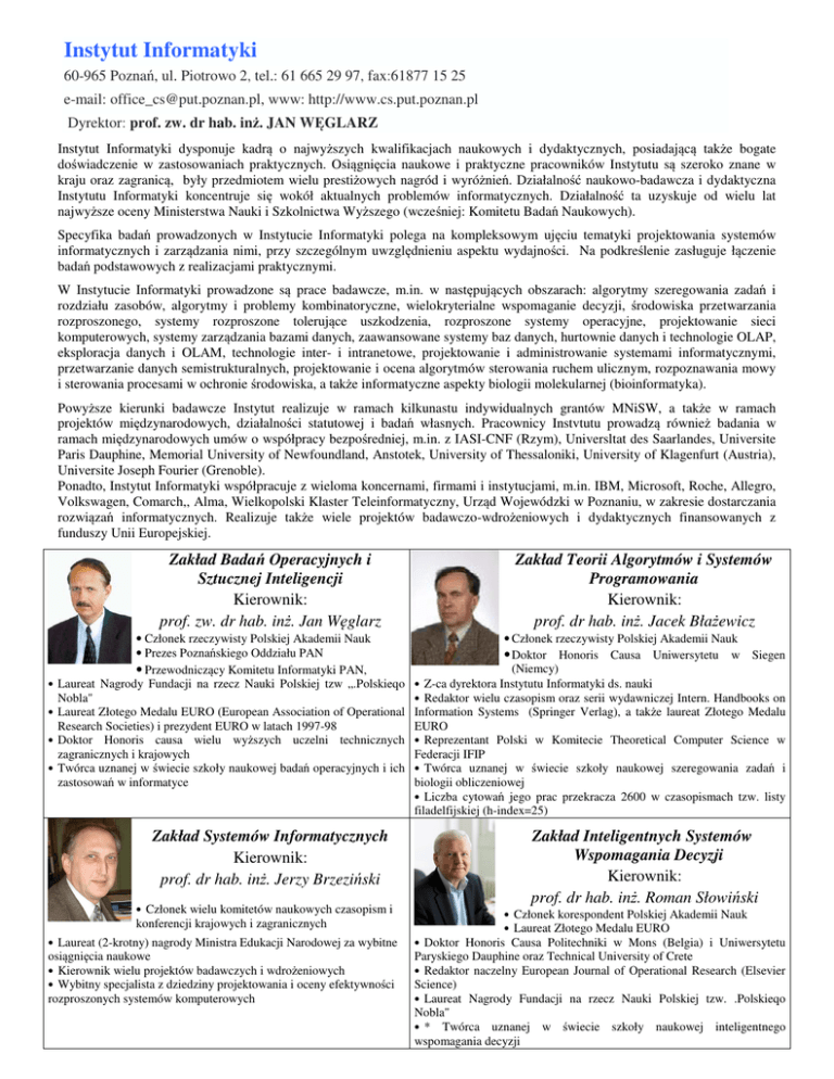 Instytut Informatyki 60-965 Poznań, ul. Piotrowo 2, tel.: 61 665 29 97, fax:61877 15 25 e-mail: [email protected], www: http://www.cs.put.poznan.pl Dyrektor: prof. zw. dr hab. inż. JAN WĘGLARZ Instytut Informatyki dysponuje kadrą o najwyższych kwalifikacjach naukowych i dydaktycznych, posiadającą także bogate doświadczenie w zastosowaniach praktycznych. Osiągnięcia naukowe i praktyczne pracowników Instytutu są szeroko znane w kraju oraz zagranicą, były przedmiotem wielu prestiżowych nagród i wyróżnień. Działalność naukowo-badawcza i dydaktyczna Instytutu Informatyki koncentruje się wokół aktualnych problemów informatycznych. Działalność ta uzyskuje od wielu lat najwyższe oceny Ministerstwa Nauki i Szkolnictwa Wyższego (wcześniej: Komitetu Badań Naukowych). Specyfika badań prowadzonych w Instytucie Informatyki polega na kompleksowym ujęciu tematyki projektowania systemów informatycznych i zarządzania nimi, przy szczególnym uwzględnieniu aspektu wydajności. Na podkreślenie zasługuje łączenie badań podstawowych z realizacjami praktycznymi. W Instytucie Informatyki prowadzone są prace badawcze, m.in. w następujących obszarach: algorytmy szeregowania zadań i rozdziału zasobów, algorytmy i problemy kombinatoryczne, wielokryterialne wspomaganie decyzji, środowiska przetwarzania rozproszonego, systemy rozproszone tolerujące uszkodzenia, rozproszone systemy operacyjne, projektowanie sieci komputerowych, systemy zarządzania bazami danych, zaawansowane systemy baz danych, hurtownie danych i technologie OLAP, eksploracja danych i OLAM, technologie inter- i intranetowe, projektowanie i administrowanie systemami informatycznymi, przetwarzanie danych semistrukturalnych, projektowanie i ocena algorytmów sterowania ruchem ulicznym, rozpoznawania mowy i sterowania procesami w ochronie środowiska, a także informatyczne aspekty biologii molekularnej (bioinformatyka). Powyższe kierunki badawcze Instytut realizuje w ramach kilkunastu indywidualnych grantów MNiSW, a także w ramach projektów międzynarodowych, działalności statutowej i badań własnych. Pracownicy Instvtutu prowadzą również badania w ramach międzynarodowych umów o współpracy bezpośredniej, m.in. z IASI-CNF (Rzym), Universltat des Saarlandes, Universite Paris Dauphine, Memorial University of Newfoundland, Anstotek, University of Thessaloniki, University of Klagenfurt (Austria), Universite Joseph Fourier (Grenoble). Ponadto, Instytut Informatyki współpracuje z wieloma koncernami, firmami i instytucjami, m.in. IBM, Microsoft, Roche, Allegro, Volkswagen, Comarch,, Alma, Wielkopolski Klaster Teleinformatyczny, Urząd Wojewódzki w Poznaniu, w zakresie dostarczania rozwiązań informatycznych. Realizuje także wiele projektów badawczo-wdrożeniowych i dydaktycznych finansowanych z funduszy Unii Europejskiej. Zakład Badań Operacyjnych i Sztucznej Inteligencji Kierownik: prof. zw. dr hab. inż. Jan Węglarz • • • • Zakład Teorii Algorytmów i Systemów Programowania Kierownik: prof. dr hab. inż. Jacek Błażewicz • Członek rzeczywisty Polskiej Akademii Nauk • Członek rzeczywisty Polskiej Akademii Nauk • Prezes Poznańskiego Oddziału PAN • Doktor Honoris Causa Uniwersytetu w Siegen (Niemcy) • Przewodniczący Komitetu Informatyki PAN, Laureat Nagrody Fundacji na rzecz Nauki Polskiej tzw „.Polskieqo • Z-ca dyrektora Instytutu Informatyki ds. nauki Nobla" • Redaktor wielu czasopism oraz serii wydawniczej Intern. Handbooks on Laureat Złotego Medalu EURO (European Association of Operational Information Systems (Springer Verlag), a także laureat Złotego Medalu Research Societies) i prezydent EURO w latach 1997-98 EURO Doktor Honoris causa wielu wyższych uczelni technicznych • Reprezentant Polski w Komitecie Theoretical Computer Science w zagranicznych i krajowych Federacji IFIP Twórca uznanej w świecie szkoły naukowej badań operacyjnych i ich • Twórca uznanej w świecie szkoły naukowej szeregowania zadań i zastosowań w informatyce biologii obliczeniowej • Liczba cytowań jego prac przekracza 2600 w czasopismach tzw. listy filadelfijskiej (h-index=25) Zakład Systemów Informatycznych Kierownik: prof. dr hab. inż. Jerzy Brzeziński • Członek wielu komitetów naukowych czasopism i konferencji krajowych i zagranicznych • Laureat (2-krotny) nagrody Ministra Edukacji Narodowej za wybitne osiągnięcia naukowe • Kierownik wielu projektów badawczych i wdrożeniowych • Wybitny specjalista z dziedziny projektowania i oceny efektywności rozproszonych systemów komputerowych Zakład Inteligentnych Systemów Wspomagania Decyzji Kierownik: prof. dr hab. inż. Roman Słowiński • Członek korespondent Polskiej Akademii Nauk • Laureat Złotego Medalu EURO • Doktor Honoris Causa Politechniki w Mons (Belgia) i Uniwersytetu Paryskiego Dauphine oraz Technical University of Crete • Redaktor naczelny European Journal of Operational Research (Elsevier Science) • Laureat Nagrody Fundacji na rzecz Nauki Polskiej tzw. .Polskieqo Nobla" • * Twórca uznanej w świecie szkoły naukowej inteligentnego wspomagania decyzji