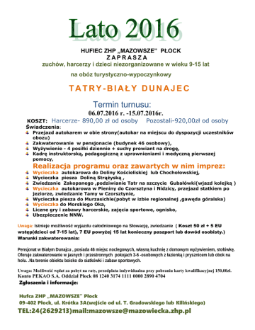 HUFIEC ZHP „MAZOWSZE” PŁOCK ZAPRASZA zuchów, harcerzy i dzieci niezorganizowane w wieku 9-15 lat na obóz turystyczno-wypoczynkowy TATRY-BIAŁY DUNAJEC Termin turnusu: 06.07.2016 r. -15.07.2016r. KOSZT: Harcerze- 890,00 zł od osoby Świadczenia: Pozostali-920,00zł od osoby Przejazd autokarem w obie strony(autokar na miejscu do dyspozycji uczestników obozu) Zakwaterowanie w pensjonacie (budynek 46 osobowy), Wyżywienie - 4 posiłki dziennie + suchy prowiant na drogę, Kadrę instruktorską, pedagogiczną z uprawnieniami i medyczną pierwszej pomocy, Realizacja programu oraz zawartych w nim imprez: Wycieczka autokarowa do Doliny Kościeliskiej lub Chochołowskiej, Wycieczka piesza Doliną Strążyską , Zwiedzanie Zakopanego ,podziwianie Tatr na szczycie Gubałówki(wjazd kolejką ) Wycieczka autokarowa w Pieniny do Czorsztyna i Nidzicy, przejazd statkiem po jeziorze, zwiedzanie Tamy w Czorsztynie, Wycieczka piesza do Murzasichle(pobyt w izbie regionalnej ,gawęda góralska) Wycieczka do Morskiego Oka, Liczne gry i zabawy harcerskie, zajęcia sportowe, ognisko, Ubezpieczenie NNW. Uwaga: Istnieje możliwość wyjazdu całodniowego na Słowację, zwiedzanie ( Koszt 50 zł + 5 EU wstęp(dzieci od 7-15 lat), 7 EU powyżej 15 lat konieczny paszport lub dowód osobisty.) Warunki zakwaterowania: Pensjonat w Białym Dunajcu , posiada 46 miejsc noclegowych, własną kuchnię z domowym wyżywieniem, stołówkę. Oferuje zakwaterowanie w jasnych i przestronnych pokojach 3-6 -osobowych z łazienką i prysznicem lub obok na holu. .Na terenie obiektu boisko do siatkówki i zabaw sportowych. Uwaga: Możliwość wpłat za pobyt na raty, przedpłata indywidualna przy pobraniu karty kwalifikacyjnej 150,00zł. Konto PEKAO S.A. Oddział Płock 08 1240 3174 1111 0000 2890 4704 Zgłoszenia i informacje: Hufca ZHP „MAZOWSZE” Płock 09-402 Płock, ul. Krótka 3A(wejście od ul. T. Gradowskiego lub Kilińskiego) TEL:24(2629213)mail:[email protected]