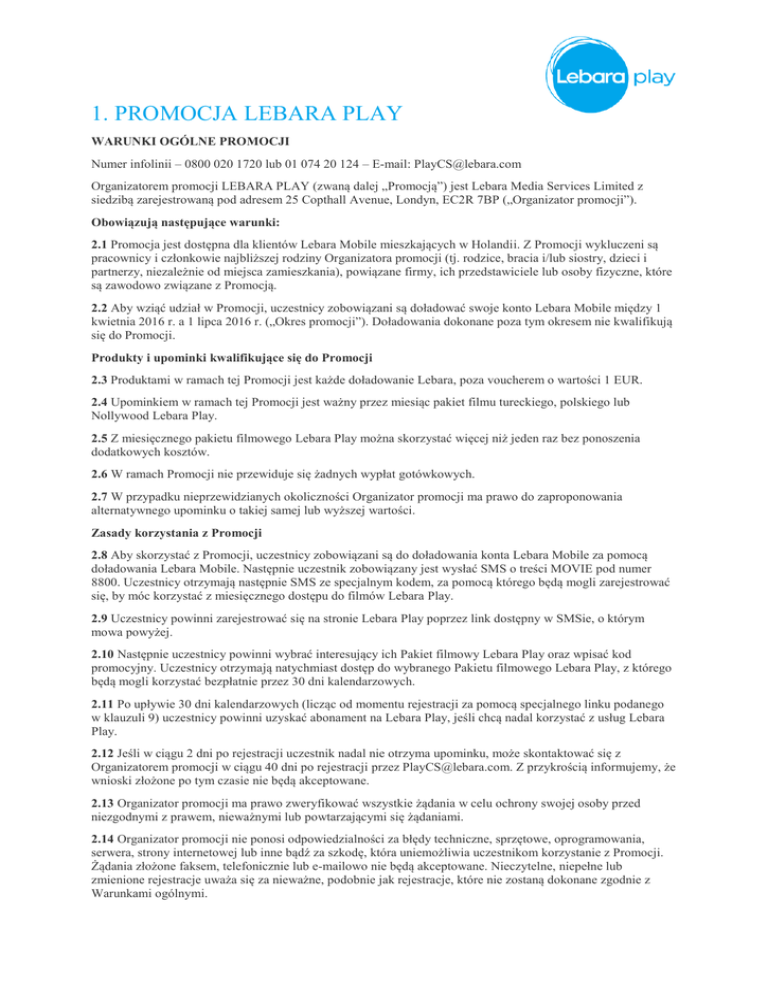 1. PROMOCJA LEBARA PLAY WARUNKI OGÓLNE PROMOCJI Numer infolinii – 0800 020 1720 lub 01 074 20 124 – E-mail: [email protected] Organizatorem promocji LEBARA PLAY (zwaną dalej „Promocją”) jest Lebara Media Services Limited z siedzibą zarejestrowaną pod adresem 25 Copthall Avenue, Londyn, EC2R 7BP („Organizator promocji”). Obowiązują następujące warunki: 2.1 Promocja jest dostępna dla klientów Lebara Mobile mieszkających w Holandii. Z Promocji wykluczeni są pracownicy i członkowie najbliższej rodziny Organizatora promocji (tj. rodzice, bracia i/lub siostry, dzieci i partnerzy, niezależnie od miejsca zamieszkania), powiązane firmy, ich przedstawiciele lub osoby fizyczne, które są zawodowo związane z Promocją. 2.2 Aby wziąć udział w Promocji, uczestnicy zobowiązani są doładować swoje konto Lebara Mobile między 1 kwietnia 2016 r. a 1 lipca 2016 r. („Okres promocji”). Doładowania dokonane poza tym okresem nie kwalifikują się do Promocji. Produkty i upominki kwalifikujące się do Promocji 2.3 Produktami w ramach tej Promocji jest każde doładowanie Lebara, poza voucherem o wartości 1 EUR. 2.4 Upominkiem w ramach tej Promocji jest ważny przez miesiąc pakiet filmu tureckiego, polskiego lub Nollywood Lebara Play. 2.5 Z miesięcznego pakietu filmowego Lebara Play można skorzystać więcej niż jeden raz bez ponoszenia dodatkowych kosztów. 2.6 W ramach Promocji nie przewiduje się żadnych wypłat gotówkowych. 2.7 W przypadku nieprzewidzianych okoliczności Organizator promocji ma prawo do zaproponowania alternatywnego upominku o takiej samej lub wyższej wartości. Zasady korzystania z Promocji 2.8 Aby skorzystać z Promocji, uczestnicy zobowiązani są do doładowania konta Lebara Mobile za pomocą doładowania Lebara Mobile. Następnie uczestnik zobowiązany jest wysłać SMS o treści MOVIE pod numer 8800. Uczestnicy otrzymają następnie SMS ze specjalnym kodem, za pomocą którego będą mogli zarejestrować się, by móc korzystać z miesięcznego dostępu do filmów Lebara Play. 2.9 Uczestnicy powinni zarejestrować się na stronie Lebara Play poprzez link dostępny w SMSie, o którym mowa powyżej. 2.10 Następnie uczestnicy powinni wybrać interesujący ich Pakiet filmowy Lebara Play oraz wpisać kod promocyjny. Uczestnicy otrzymają natychmiast dostęp do wybranego Pakietu filmowego Lebara Play, z którego będą mogli korzystać bezpłatnie przez 30 dni kalendarzowych. 2.11 Po upływie 30 dni kalendarzowych (licząc od momentu rejestracji za pomocą specjalnego linku podanego w klauzuli 9) uczestnicy powinni uzyskać abonament na Lebara Play, jeśli chcą nadal korzystać z usług Lebara Play. 2.12 Jeśli w ciągu 2 dni po rejestracji uczestnik nadal nie otrzyma upominku, może skontaktować się z Organizatorem promocji w ciągu 40 dni po rejestracji przez [email protected]. Z przykrością informujemy, że wnioski złożone po tym czasie nie będą akceptowane. 2.13 Organizator promocji ma prawo zweryfikować wszystkie żądania w celu ochrony swojej osoby przed niezgodnymi z prawem, nieważnymi lub powtarzającymi się żądaniami. 2.14 Organizator promocji nie ponosi odpowiedzialności za błędy techniczne, sprzętowe, oprogramowania, serwera, strony internetowej lub inne bądź za szkodę, która uniemożliwia uczestnikom korzystanie z Promocji. Żądania złożone faksem, telefonicznie lub e-mailowo nie będą akceptowane. Nieczytelne, niepełne lub zmienione rejestracje uważa się za nieważne, podobnie jak rejestracje, które nie zostaną dokonane zgodnie z Warunkami ogólnymi. Ochrona prywatności i danych osobowych 2.15 Dane osobowe dotyczące uczestników zostaną wykorzystane przez Organizatora promocji w ramach tej Promocji zgodnie z brytyjskim ustawodawstwem dotyczącym ochrony danych osobowych. Zobacz też Polityka prywatności Lebara na stronie Lebara. Informacje ogólne 2.16 Organizator promocji ma prawo do anulowania lub zmiany Warunków ogólnych bez wcześniejszego powiadomienia. Każda zmiana Warunków ogólnych zostanie podana do wiadomości na tej stronie internetowej. 2.17 Aby skorzystać z tej oferty, kandydaci muszą przeczytać i zaakceptować Warunki ogólne. 2.18 Niniejsze Warunki ogólne reguluje prawo brytyjskie.