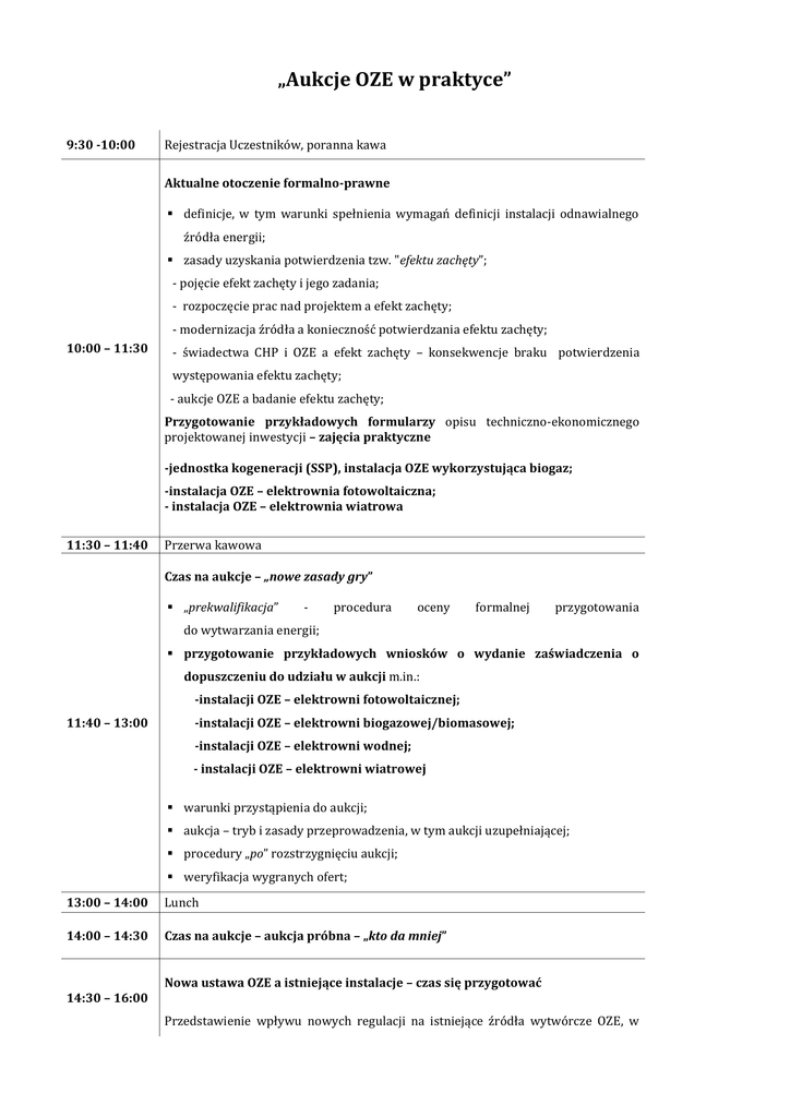 „Aukcje OZE w praktyce” 9:30 -10:00 Rejestracja Uczestników, poranna kawa Aktualne otoczenie formalno-prawne definicje, w tym warunki spełnienia wymagań definicji instalacji odnawialnego źródła energii; zasady uzyskania potwierdzenia tzw. "efektu zachęty”; - pojęcie efekt zachęty i jego zadania; - rozpoczęcie prac nad projektem a efekt zachęty; - modernizacja źródła a konieczność potwierdzania efektu zachęty; 10:00 – 11:30 - świadectwa CHP i OZE a efekt zachęty – konsekwencje braku potwierdzenia występowania efektu zachęty; - aukcje OZE a badanie efektu zachęty; Przygotowanie przykładowych formularzy opisu techniczno-ekonomicznego projektowanej inwestycji – zajęcia praktyczne -jednostka kogeneracji (SSP), instalacja OZE wykorzystująca biogaz; -instalacja OZE – elektrownia fotowoltaiczna; - instalacja OZE – elektrownia wiatrowa 11:30 – 11:40 Przerwa kawowa Czas na aukcje – „nowe zasady gry” „prekwalifikacja” - procedura oceny formalnej przygotowania do wytwarzania energii; przygotowanie przykładowych wniosków o wydanie zaświadczenia o dopuszczeniu do udziału w aukcji m.in.: -instalacji OZE – elektrowni fotowoltaicznej; 11:40 – 13:00 -instalacji OZE – elektrowni biogazowej/biomasowej; -instalacji OZE – elektrowni wodnej; - instalacji OZE – elektrowni wiatrowej warunki przystąpienia do aukcji; aukcja – tryb i zasady przeprowadzenia, w tym aukcji uzupełniającej; procedury „po” rozstrzygnięciu aukcji; weryfikacja wygranych ofert; 13:00 – 14:00 Lunch 14:00 – 14:30 Czas na aukcje – aukcja próbna – „kto da mniej” Nowa ustawa OZE a istniejące instalacje – czas się przygotować 14:30 – 16:00 Przedstawienie wpływu nowych regulacji na istniejące źródła wytwórcze OZE, w tym: nowe warunki obowiązku zakupu energii elektrycznej; zmiany procedury uzyskania świadectwa pochodzenia; mechanizmy zapobiegające nadpodaży świadectw pochodzenia; zasad przejścia z systemu kwotowego („certyfikatów”) do systemu „aukcyjnego”; przygotowanie przykładowych deklaracji do aukcji dla istniejących instalacji OZE 16:00 Zakończenie warsztatów i wręczenie certyfikatów o przystąpieniu