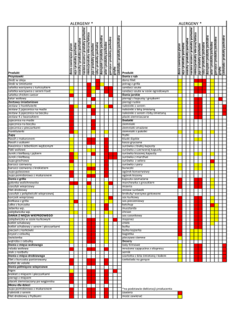 ALERGENY * Produkt Dania z ryb dorsz filet pstrag z grilla sandacz soute sandacz soute w sosie ogrodowym Dania jarskie pierogi z kapustą i grzybami pierogi ruskie naleśniki z serem naleśniki z bitą śmietaną naleśniki z serem i bitą śmietaną placki ziemniaczane Dodatki ziemniaki ziemniaki smażone ziemniaki z patelni frytki kluski śląskie kasza gryczana surówka z białej kapusty surówka z czerwonej kapusty surówka kiszonej kapusty surówka z marchwi surówka z selera surówka z pory buraczki ogórek konserwowy ogórek kiszony kapsuta zasmażana marchewka z groszkiem mizeria zestaw surówek brokuły/ warzywa gotowane sos kurkowy sos pieczeniowy ketchup musztarda chrzan sos czosnkowy majonez chleb bułka bułka kajzerka bagietka pieczywo ciemne Desery lody firmowe mrożone cappucino z ekspresu sernik szarlotka z bita śmietaną i lodem czekolada na gorąco *na podstawie deklaracji producenta zawiera może zawierać zboża zawierajace gluten soja i produkty pochodne orzechy i produkty pochodne nasiona sezamu i produkty pochodne mleko/produkty mleczne/laktoza jaja i produkty pochodne ryby i produkty pochodne skorupiak i produkty pochodne seler i produkty pochodne gorczyca i produkty pochodne grzyby czekolada i produkty pochodne Produkt Przystawki śledź w oleju śledź w śmietanie sałatka warzywna z tuńczykiem sałatka warzywna z serem Favit sałatka chicken caezar tatar wołowy Zestawy śniadaniowe zestaw 1 frankfuterki zestaw 2 jajecznica na maśle zestaw 3 jajecznica na boczku zestaw 4 z twarozkiem jajecznica na maśle jajecznica na boczku jajecznica z pieczarkami frankfuterki Zupy Rosół z makaronem Rosół z uszkami Kwaśnica z żeberkiem wędzonym flaki wołowe żurek z kiełbasą i jajkiem żurek z kiełbasą zupa grochowa barszcz czerwony barszcz czerwony z krokietem zupa gulaszowa zupa pomidorowa z makaronem Dania z grilla golonka walichnowska szaszłyk wieprzowy filet drobiowy szaszłyk z polędwiczki wieprzowej karczek wieprzowy kiełbasa z grilla udko z kurczaka żeberka wp. polędwiczka wp. DANIA Z MIĘSA WIEPRZOWEGO polędwiczka w sosie kurkowym kotlet schabowy kotlet schabowy z serem i pieczarkami pieczeń z karkówki bryzol z cebulką świeżonka wątroba z cebulką Dania z mięsa wołowego rolada wołowa stek z rostbefu Dania z mięsa drobiowego filet z kurczaka panierowany kotlet de volaile Dania półmięsne wieprzowe bigos krokiet z mięsem i pieczarkami pierogi z mięsem placek ziemniaczany po węgiersku Menu dla dzieci zupa pomidorowa z makaronem naleśnik z serem filet drobiowy z frytkami zboża zawierajace gluten soja i produkty pochodne orzechy i produkty pochodne nasiona sezamu i produkty pochodne mleko/produkty mleczne/laktoza jaja i produkty pochodne ryby i produkty pochodne skorupiak i produkty pochodne seler i produkty pochodne gorczyca i produkty pochodne grzyby czekolada i produkty pochodne ALERGENY *
