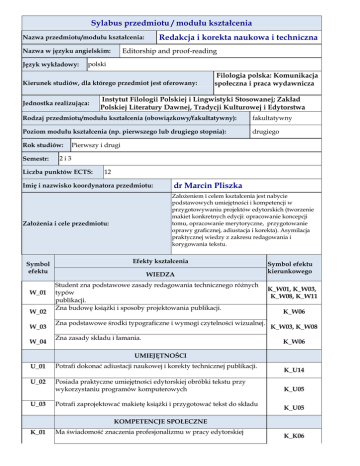 Sylabus przedmiotu / modułu kształcenia Redakcja i korekta naukowa i techniczna Nazwa przedmiotu/modułu kształcenia: Editorship and proof-reading Nazwa w języku angielskim: Język wykładowy: polski Kierunek studiów, dla którego przedmiot jest oferowany: Jednostka realizująca: Filologia polska: Komunikacja społeczna i praca wydawnicza Instytut Filologii Polskiej i Lingwistyki Stosowanej; Zakład Polskiej Literatury Dawnej, Tradycji Kulturowej i Edytorstwa Rodzaj przedmiotu/modułu kształcenia (obowiązkowy/fakultatywny): fakultatywny Poziom modułu kształcenia (np. pierwszego lub drugiego stopnia): drugiego Rok studiów: Semestr: Pierwszy i drugi 2i3 Liczba punktów ECTS: 12 Imię i nazwisko koordynatora przedmiotu: Założeniem i celem kształcenia jest nabycie podstawowych umiejętności i kompetencji w przygotowywaniu projektów edytorskich (tworzenie makiet konkretnych edycji: opracowanie koncepcji tomu, opracowanie merytoryczne, przygotowanie oprawy graficznej, adiustacja i korekta). Asymilacja praktycznej wiedzy z zakresu redagowania i korygowania tekstu. Założenia i cele przedmiotu: Symbol efektu W_01 W_02 W_03 W_04 dr Marcin Pliszka Efekty kształcenia WIEDZA Student zna podstawowe zasady redagowania technicznego różnych typów publikacji. Zna budowę książki i sposoby projektowania publikacji. Zna podstawowe środki typograficzne i wymogi czytelności wizualnej. Zna zasady składu i łamania. Symbol efektu kierunkowego K_W01, K_W03, K_W08, K_W11 K_W06 K_W03, K_W08 K_W06 UMIEJĘTNOŚCI U_01 Potrafi dokonać adiustacji naukowej i korekty technicznej publikacji. U_02 Posiada praktyczne umiejętności edytorskiej obróbki tekstu przy wykorzystaniu programów komputerowych U_03 Potrafi zaprojektować makietę książki i przygotować tekst do składu K_U14 K_U05 K_U05 KOMPETENCJE SPOŁECZNE K_01 Ma świadomość znaczenia profesjonalizmu w pracy edytorskiej K_K06 K_02 Ma pogłębioną świadomość potrzeby ustawicznego kształcenia Forma i typy zajęć: K_K10 ćwiczenia (60 godzin) Wymagania wstępne i dodatkowe: Podstawowa znajomość obsługi programów z pakietu Microsoft Office (ze szczególnym uwzględnieniem programu Word) Treści modułu kształcenia: 1. Zajęcia praktyczne obejmujące pogłębianie umiejętności sprawnego korygowania błędów w składanym do druku lub złożonym tekście (emendacje merytoryczne, stylistyczne, ortograficzne, interpunkcyjne) i inne. Praca wykonywana tradycyjnie i komputerowo (śledzenie zmian i komentarzy podczas edytowania tekstu). Elementy składu komputerowego. 2. Łączenie zdolności publicystycznych, redakcyjnych z kompetencjami specjalistycznie edytorskimi w celu uzyskania maksymalnie profesjonalnego efektu publikacji (sposoby prezentowania skomplikowanych treści w komunikatywnych formach, dostosowywanie adekwatnych mediów przekazu, przy pogłębionej znajomości narzędzi redagowania i składu). 3. Wykonywanie własnych projektów edytorskich. Analizowanie konkretnych rozwiązań. Podstawy typografii. Elementy liternictwa. Wymogi czytelności publikacji. Opracowanie graficzne publikacji. 4. Kompozycja edycji. Właściwy dobór formatu publikacji (wielkość strony, rozmiar kolumny, rodzaj czcionki, rodzaju papieru etc.). Sporządzanie makiet i szkiców. 5. Kontrola i korygowanie wieloaspektowej poprawności książki. Adiustacja i korekta techniczna. Typowe błędy składu. 6. Kształcenie umiejętności komunikacji interpersonalnej z autorami oraz z pracownikami wydawnictwa. Literatura podstawowa: Phil Baines, Andrew Haslam: Pismo i typografia. Tłum. Dorota Dziewońska. Warszawa 2010. Janusz Dunin: Wstęp do edytorstwa. Łódź 2003. Konrad Górski: Tekstologia i edytorstwo dzieł literackich. Warszawa 1975 (i wyd. nast.); Robert Krerowicz, Stanisław Krawiec: Wprowadzenie do edycji tekstów. Kraków 2000; Roman Loth: Podstawowe pojęcia i problemy tekstologii i edytorstwa naukowego. Warszawa 2006. Michael Mitchell, Susan Wightman: Typografia książki. Podręcznik projektanta. Tłum. Dorota Dziewońska. Kraków 2012. Barbara Osuchowska: Poradnik autora, tłumacza i redaktora. Warszawa 2005; Robin Williams: Mistrzowskie stosowanie czcionek. Gliwice 2003. Adam Wolański: Edycja tekstów. Praktyczny poradnik. Warszawa 2008. Literatura dodatkowa: Antoni Czyż: Jaki zapis? Poradnik polonisty. Siedlce 1999; Iskra Angełowa: Charakterystyka interpunkcji polskiej w świetle normy i praktyki. Wrocław 1985; Stanisław Gajda: Współczesna polszczyzna naukowa. Język czy żargon? Opole 1999; Filip Trzaska: Podstawy techniki wydawniczej. Warszawa 1987. Planowane formy/działania/metody dydaktyczne: praca przy komputerze; prezentacja Sposoby weryfikacji efektów kształcenia osiąganych przez studenta: Efekty W_01 – W_04 oraz U_01- U_03 weryfikowane są całościowo i stopniowo podczas wykonywanych prac podczas ćwiczeń. Forma i warunki zaliczenia: Warunek uzyskania zaliczenia przedmiotu: najwyżej dwie nieusprawiedliwione nieobecności i spełnienie każdego z opisanych niżej warunków: 1/ Przygotowanie do zajęć i aktywność – ocena na bieżąco w trakcie trwania zajęć. 2/ Zaliczenie dwóch projektów przygotowywanych indywidualnie na zajęciach; punktacja –0-25 (2,0) 26-30 (3,0) 31-35 (3,5) 36-41 (4,0) 42-46 (4,5) 47-50 (5,0) Bilans punktów ECTS: Aktywność Obciążenie studenta Udział w ćwiczeniach 90 godz. Samodzielne przygotowanie się do ćwiczeń 90 godz. Udział w konsultacjach z przedmiotu 50 godz. Samodzielne przygotowanie się do zaliczenia 50 godz. Sumaryczne obciążenie pracą studenta 280 godz. Punkty ECTS za przedmiot 12 ECTS