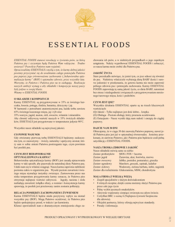 ESSENTIAL FOODS O SKŁADZIE I KOMPOZYCJI Karmy ESSENTIAL są przygotowywane w 35% ze świeżego kurczaka, łososia, pstrąga, śledzia, baraniny, dziczyzny i jaj. W harmonii z potrzebami anatomicznymi psa, każda torba zawiera 65% świeżego/suszonego mięsa, jaj i ryb oraz 35% warzyw, jagód, nasion, ziół, owoców, witamin i minerałów. Aby chronić odżywczą wartość naszych w 35% świeżych składników, ESSETIALS jest przygotowane w temperaturze jedynie 90°C. Wszystkie nasze składniki są najwyższej jakości. CO POWIE WAM NOS Gdy otwieramy pierwszą torbę ESSENTIALS będziemy zaskoczeniu tym, co zauważymy – świeży, naturalny i apetyczny aromat, który sam w sobie zmieni Państwa postrzeganie tego, czym powinien być posiłek psa. CZYM JEST BEHAWIORALNIE OPTYMALIZOWANA KARMA? Behawioralna optymalizacja karmy (BOF) jest zasadą opracowania karmy w taki sposób, aby pasowała do naturalnej diety Państwa psa. Udało nam się to właśnie osiągnąć. Nasza karma zapewnia stabilność poziomu cukru w organizmie psa. Wysoki poziom zawartości świeżego mięsa stymuluje instynkty zwierzęce. Zastosowana przez nas niska temperatura przygotowania karmy oznacza, że Państwa pies otrzymuje najlepsze wartości odżywcze. Jagody, nasiona i zioła naśladują zawartość żołądka ofiary, a rozmiar i konsystencja karmy sprawiają, że posiłek jest przeżuwany zanim zostanie połknięty. RELACJA POMIĘDZY ZACHOWANIEM I ŻYWIENIEM Karma ESSENTIALS będzie miała pozytywny wpływ na niemal wszystkie psy (BOF). Mogą Państwo oczekiwać, że Państwa pies będzie spokojniejszy przed, w trakcie i po karmieniu. Klienci opowiedzieli nam o dramatycznym zmniejszeniu złego za- chowania ich psów, a w niektórych przypadkach o jego zupełnym ustąpieniu. Należy wypróbować ESSENTIAL FOODS i zobaczyć, co nasza karma może zrobić dla Państwa psa. JAKOŚĆ ŻYCIA Stare porzekadło mówiące, że jesteś tym, co jesz odnosi się również do psa. Niektórzy właściciele wybierają dietę BARF (kości i surowe jedzenie) w przekonaniu, że gotowa karma nie może zapewnić pełnego zdrowia psa i potencjału zachowania. Karmy ESSENTIAL FOODS zapewniają tę samą jakość życia, co dieta BARF, natomiast bez stresu i niedogodności związanych z przygotowywaniem mrożonego/surowego mięsa, kości i podrobów. CZYM JEST QSE? Wszystkie działania ESSENTIAL oparte są na trzech kluczowych wartościach: (Q) Jakość - Tylko najlepsze jest dość dobre... kropka. (O) Obsługa - Poziom obsługi, który przerasta oczekiwania. (E) Entuzjazm - Nasze wyniki dają nam radość i energię do ciągłej poprawy. DAJCIE NAM 30 DNI Obiecujemy, że w ciągu 30 dni zauważą Państwo poprawę, nawet jeśli Państwa pies jest już w optymalnej równowadze. Jesteśmy przekonani, że zarówno Państwo, jak i Państwa pies będziecie czuli pełną satysfakcję z ESSENTIAL FOODS. NASZA TROSKA ZDROWIE I JAKOŚĆ Nasze składniki mówią same za siebie: Zestaw probiotyków MOS i FOS + lucerna Zestaw jagód Żurawina, akai, borówka, morwa Zestaw owocowy Jabłko, pomidor, pomarańcz, gruszka Zestaw ogrodowy Marchew, groszek, szpinak, kalafior Zestaw ziołowy Wodorosty, zielona herbata, imbir, nagietek Zestaw dla rozluźnienia Glukozamina, MSM, chondroityna MAŁA FIRMA Z WIELKĄ WIZJĄ • Zespół specjalistów z dużym doświadczeniem • 8 różnych receptur, dzięki czemu możemy służyć Państwa psu przez całe jego życie • Pełny wybór pysznych smakołyków. • Aktywnie wspieramy cierpiące zwierzęta na całym świecie. • Certyfikat BRC z oceną A (Najlepsza żywność bezpieczna dla zdrowia). • Oficjalni partnerzy, którzy oferują najwyższe standardy. • Porady i informacje. PRODUKT OPRACOWANY I WYPRODUKOWANY W WIELKIEJ BRYTANII v: 3.1 ESSENTIAL FOODS stanowi rewolucję w żywieniu psów, za którą Państwa psy i szczenięta będą Państwu Wam wdzięczne. Trudno uwierzyć? Pozwólcie Państwo nam wyjaśnić. Opracowaliśmy ESSENTIALS z myślą o tym, że karmy dobrej jakości powinny przyczyniać się do uwalniania całego potencjału Państwa psa poprzez jego zrównoważone zachowanie (,,behawioralna optymalizacja karmy’’ (BOF) i optymalne zdrowie, przez wszystkie lata. Wierzymy, że Państwo i Państwa pies na to zasługują. Realizacja naszych ambicji wymag a aby składniki i kompozycja naszej paszy były jedyne w swojej klasie. Witamy w ESSENTIAL FOODS. Organiczne Akai Kiełki Lucerny Jabłko Borówka Marchew Kalafior Kurczak Ross i Cobb Żurawina Kaczka Gressenham Jajko Imbir Żeń-szeń Zielona herbata Brytyjskie brązowe siemię lniane Nagietek Morwy Pomarańcz Gruszka Groszek angielski Ziemniaki Russet Probiotyki Rozmaryn Łosoś szkocki Szpinak Słodkie ziemniaki Beauregard i Jewel Pomidory Pstrąg Salisbury Rainbow Witaminy i minerały Dziczyzna czarna i płowa Śledzie Brytyjska baranina v: 3.1 PRODUKT OPRACOWANY I WYPRODUKOWANY W WIELKIEJ BRYTANII Ręcznie zbierane wodorosty