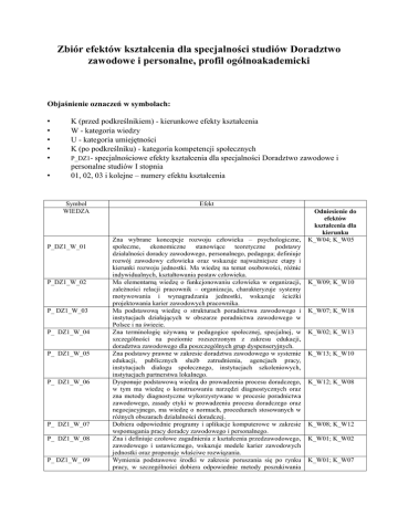 Zbiór efektów kształcenia dla specjalności studiów Doradztwo zawodowe i personalne, profil ogólnoakademicki Objaśnienie oznaczeń w symbolach: • • • • • • K (przed podkreślnikiem) - kierunkowe efekty kształcenia W - kategoria wiedzy U - kategoria umiejętności K (po podkreślniku) - kategoria kompetencji społecznych P_DZ1- specjalnościowe efekty kształcenia dla specjalności Doradztwo zawodowe i personalne studiów I stopnia 01, 02, 03 i kolejne – numery efektu kształcenia Symbol WIEDZA P_DZ1_W_01 P_DZ1_W_02 P_ DZ1_W_03 P_ DZ1_W_04 P_ DZ1_W_05 P_ DZ1_W_06 P_ DZ1_W_07 P_ DZ1_W_08 P_ DZ1_W_ 09 Efekt Zna wybrane koncepcje rozwoju człowieka – psychologiczne, społeczne, ekonomiczne stanowiące teoretyczne podstawy działalności doradcy zawodowego, personalnego, pedagoga; definiuje rozwój zawodowy człowieka oraz wskazuje najważniejsze etapy i kierunki rozwoju jednostki. Ma wiedzę na temat osobowości, różnic indywidualnych, kształtowania postaw człowieka. Ma elementarną wiedzę o funkcjonowaniu człowieka w organizacji, zależności relacji pracownik – organizacja, charakteryzuje systemy motywowania i wynagradzania jednostki, wskazuje ścieżki projektowania karier zawodowych pracownika. Ma podstawową wiedzę o strukturach poradnictwa zawodowego i instytucjach działających w obszarze poradnictwa zawodowego w Polsce i na świecie. Zna terminologię używaną w pedagogice społecznej, specjalnej, w szczególności na poziomie rozszerzonym z zakresu edukacji, doradztwa zawodowego dla poszczególnych grup dyspenseryjnych. Zna podstawy prawne w zakresie doradztwa zawodowego w systemie edukacji, publicznych służb zatrudnienia, agencjach pracy, instytucjach dialogu społecznego, instytucjach szkoleniowych, instytucjach partnerstwa lokalnego. Dysponuje podstawową wiedzą do prowadzenia procesu doradczego, w tym ma wiedzę o konstruowaniu narzędzi diagnostycznych oraz zna metody diagnostyczne wykorzystywane w procesie poradnictwa zawodowego, zasady etyki w prowadzeniu procesu doradczego oraz negocjacyjnego, ma wiedzę o normach, procedurach stosowanych w różnych obszarach działalności doradczej. Dobiera odpowiednie programy i aplikacje komputerowe w zakresie wspomagania pracy doradcy zawodowego i personalnego. Zna i definiuje czołowe zagadnienia z kształcenia przedzawodowego, zawodowego i ustawicznego, wskazuje modele karier zawodowych jednostki oraz proponuje właściwe rozwiązania. Wymienia podstawowe środki w zakresie poruszania się po rynku pracy, w szczególności dobiera odpowiednie metody poszukiwania Odniesienie do efektów kształcenia dla kierunku K_W04; K_W05 K_W09; K_W10 K_W07; K_W18 K_W02; K_W13 K_W13; K_W10 K_W12; K_W08 K_W08; K_W12 K_W01; K_W02 K_W01; K_W07 P_ DZ1_W_10 P_ DZ1_W_11 P_ DZ1_W_ 12 P_ DZ1_W_13 UMIEJĘTNOŚCI P_DZ1_U_01 P_ DZ1_U_02 P_ DZ1_U_03 P_ DZ1_U_04 P_ DZ1_U_05 P_ DZ1_U_06 P_ DZ1_U_ 07 P_ DZ1_U_ 08 P_ DZ1_U_ 09 P_ DZ1_U_ 10 P_ DZ1_U_11 P_ DZ1_U_ 12 P_ DZ1_U_ 13 P_ DZ1_U_14 KOMPETENCJE SPOŁECZNE P_ DZ1_K_01 pracy dla jednostki, identyfikuje problemy związane z zatrudnieniem, rodzajami umów o pracę. Wymienia i charakteryzuje podmioty rynku pracy. Ma podstawową wiedzę o funkcjonowaniu i patologii narządu mowy Zna struktury i funkcjonowania systemu edukacji – celów, podstaw prawnych, organizacji i funkcjonowania instytucji edukacyjnych, wychowawczych i opiekuńczy Ma wiedzę dotyczącą bezpieczeństwa i higieny pracy w instytucjach edukacyjnych, wychowawczych i opiekuńczych, do pracy w których uzyskuje przygotowanie Ma wiedzę dotyczącą etyki zawodu nauczyciela, pedagoga, doradcy zawodowego Potrafi wykorzystywać wiedzę teoretyczną z zakresu pedagogiki, oraz poradnictwa zawodowego, w celu analizy poznanych teorii i jej krytycznym zastosowaniu. Potrafi dokonać obserwacji i interpretacji zjawisk społecznych, w tym analizy sytuacji klienta z wykorzystaniem metod diagnostycznych. Potrafi wykorzystać wiedzę z zakresu doradztwa zawodowego do interpretowania problemów edukacyjnych i zawodowych jednostki. Posiada dobrą znajomość metod i technik diagnostycznych wykorzystywanych w placówkach oświatowych, publicznych służbach zatrudnienia. Potrafi łączyć, dokonywać syntezy, porównywać systemy edukacyjne i doradcze w Unii Europejskiej. Potrafi pracować w międzynarodowym zespole, posługując się wiedzą zdobytą w trakcie edukacji, korzystając z zasad komunikacji interpersonalnej. Potrafi przeprowadzić proces doradcy dla poszczególnych klientów, w tym dla klientów niepełnosprawnych z wykorzystaniem specjalistycznych testów zawodowych oraz technologii informatycznych ,jak również przygotować klienta odmiennego kulturowo do wkroczenia na polski rynek pracy. Potrafi generować oryginalne rozwiązania w zakresie aktywizacji zawodowej jednostki w tym posługiwać się technikami i metodami poszukiwania zatrudnienia dla klienta. Potrafi dokonać analizy sytuacji edukacyjnej, zawodowej zarówno młodzieży jak i osób dorosłych; posiada umiejętność stosowania indywidualnego i grupowego doradztwa zawodowego. Potrafi samodzielnie zdobywać wiedzę i rozwijać umiejętności w celu dokonywania modyfikacji systemów. Wykształcone prawidłowe nawyki posługiwania się narządem mowy Potrafi samodzielnie zdobywać wiedzę i rozwijać swoje profesjonalne umiejętności związane z działalnością pedagogiczną (dydaktyczną, wychowawcza i opiekuńczą), korzystając z różnych źródeł (w języku polskim i obcym) i nowoczesnych technologii Potrafi ocenić przydatność typowych metod, procedur i dobrych praktyk do realizacji zadań dydaktycznych, wychowawczych i opiekuńczych związanych z odpowiednimi etapami edukacyjnymi oraz wybranych metod personalnych Potrafi posługiwać się zasadami i normami etycznymi w wykonywanej działalności Jest przygotowany do aktywnej pracy ze specjalistami z zakresu poradnictwa zawodowego, rynku pracy, doradztwa personalnego K_W09; K_W10 K_W15; K_W10 K