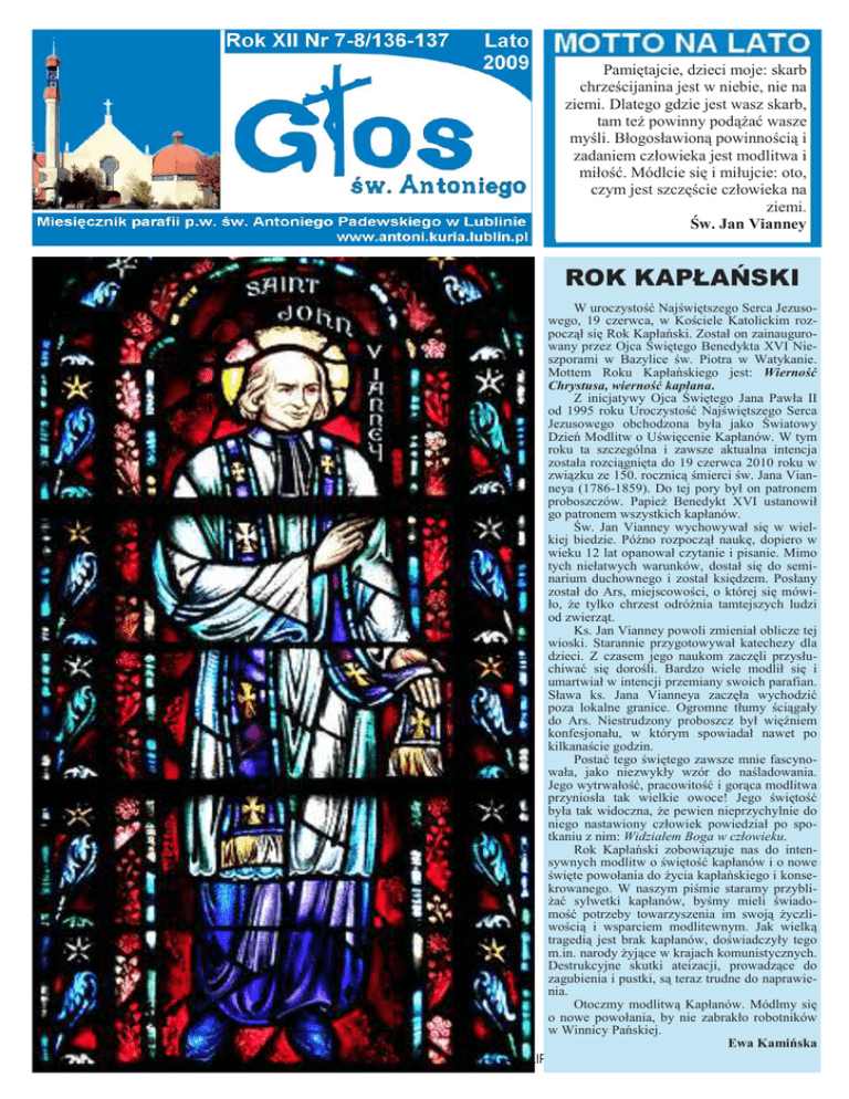 Pamiętajcie, dzieci moje: skarb chrześcijanina jest w niebie, nie na ziemi. Dlatego gdzie jest wasz skarb, tam teŜ powinny podąŜać wasze myśli. Błogosławioną powinnością i zadaniem człowieka jest modlitwa i miłość. Módlcie się i miłujcie: oto, czym jest szczęście człowieka na ziemi. Św. Jan Vianney ROK KAPŁAŃSKI W uroczystość Najświętszego Serca Jezusowego, 19 czerwca, w Kościele Katolickim rozpoczął się Rok Kapłański. Został on zainaugurowany przez Ojca Świętego Benedykta XVI Nieszporami w Bazylice św. Piotra w Watykanie. Mottem Roku Kapłańskiego jest: Wierność Chrystusa, wierność kapłana. Z inicjatywy Ojca Świętego Jana Pawła II od 1995 roku Uroczystość Najświętszego Serca Jezusowego obchodzona była jako Światowy Dzień Modlitw o Uświęcenie Kapłanów. W tym roku ta szczególna i zawsze aktualna intencja została rozciągnięta do 19 czerwca 2010 roku w związku ze 150. rocznicą śmierci św. Jana Vianneya (1786-1859). Do tej pory był on patronem proboszczów. PapieŜ Benedykt XVI ustanowił go patronem wszystkich kapłanów. Św. Jan Vianney wychowywał się w wielkiej biedzie. Późno rozpoczął naukę, dopiero w wieku 12 lat opanował czytanie i pisanie. Mimo tych niełatwych warunków, dostał się do seminarium duchownego i został księdzem. Posłany został do Ars, miejscowości, o której się mówiło, Ŝe tylko chrzest odróŜnia tamtejszych ludzi od zwierząt. Ks. Jan Vianney powoli zmieniał oblicze tej wioski. Starannie przygotowywał katechezy dla dzieci. Z czasem jego naukom zaczęli przysłuchiwać się dorośli. Bardzo wiele modlił się i umartwiał w intencji przemiany swoich parafian. Sława ks. Jana Vianneya zaczęła wychodzić poza lokalne granice. Ogromne tłumy ściągały do Ars. Niestrudzony proboszcz był więźniem konfesjonału, w którym spowiadał nawet po kilkanaście godzin. Postać tego świętego zawsze mnie fascynowała, jako niezwykły wzór do naśladowania. Jego wytrwałość, pracowitość i gorąca modlitwa przyniosła tak wielkie owoce! Jego świętość była tak widoczna, Ŝe pewien nieprzychylnie do niego nastawiony człowiek powiedział po spotkaniu z nim: Widziałem Boga w człowieku. Rok Kapłański zobowiązuje nas do intensywnych modlitw o świętość kapłanów i o nowe święte powołania do Ŝycia kapłańskiego i konsekrowanego. W naszym piśmie staramy przybliŜać sylwetki kapłanów, byśmy mieli świadomość potrzeby towarzyszenia im swoją Ŝyczliwością i wsparciem modlitewnym. Jak wielką tragedią jest brak kapłanów, doświadczyły tego m.in. narody Ŝyjące w krajach komunistycznych. Destrukcyjne skutki ateizacji, prowadzące do zagubienia i pustki, są teraz trudne do naprawienia. Otoczmy modlitwą Kapłanów. Módlmy się o nowe powołania, by nie zabrakło robotników w Winnicy Pańskiej. Ewa Kamińska LIPIEC SIERPIEŃ 2009 Nr 7-8/136-137 NABOśEŃSTWO PRZY FIGURZE MATKI BOśEJ Liczna grupa wiernych zgromadziła się w niedzielę 31 maja o godz. 20.00 przy figurze Matki BoŜej z Lourdes obok pawilonów przy ul. Tumidajskiego, aby wziąć udział w ostatnim NaboŜeństwie Majowym w tym roku. Modlitwie przewodniczył ks. Tomasz Serwin. Obecni byli takŜe: ks. Proboszcz Stanisław Róg, ks. Infułat Józef Szczypa, ks. Prałat Marian Matusik i ks. Sebastian Dec. RóŜaniec prowadziła Monika Domań, a śpiew lektor, Paweł Jabłoniec, któremu sekundował Ojciec Marian śpiewając wielozwrotkową pieśń maryjną. NaboŜeństwo zakończyło się błogosławieństwem i Apelem Jasnogórskim. DLA ŚW. ANTONIEGO Archidiecezjalny turniej piłki noŜnej odbył się 9 czerwca w Fajsławicach. Z dwutygodniowym wyprzedzeniem ks. Tomasz Serwin wybrał mnie, abym został selekcjonerem i zebrał trzy składy. Gdy byliśmy gotowi, pojechaliśmy pod opieką najwierniejszego kibica – ks. Mariusza Salacha, który dopingował nas w trudnych chwilach. Najmłodsza druŜyna grała zdumiewająco dobrze. Wygrała wszystkie mecze. Zajęli I miejsce w grupie i przywieźli do parafii złoty puchar. Średnia druŜyna grała równieŜ dobrze, ale im się niestety nie powiodło. Najstarsi zagrali fantastycznie. Zajęli jednak II miejsce, gdyŜ przegrali w rzutach karnych w finale. Wiemy, Ŝe czuwał nad nami św. Antoni, wspierał nas i dodawał sił. Wygraliśmy dla niego tuŜ przed jego świętem. Mam nadzieję, Ŝe za rok równieŜ nie przyjedziemy z pustymi rękami. Kamil Al-Swaiti PRZEKAZANIE OBRAZU MATKI BOśEJ W piątek 19 czerwca zakończyła się peregrynacja Obrazu Matki BoŜej Częstochowskiej w bloku przy ul. Niepodległości 6. Po Mszy św. wieczorowej obraz został przekazany rodzinie z bloku przy ul. Niepodległości 7. Mimo intensywnego deszczu nie brakowało chętnych, którzy włączyli się w procesyjny orszak odprowadzający obraz, tradycyjnie z lampionami. Procesję prowadzili: ks. Proboszcz Stanisław Róg i ks. Mariusz Salach a śpiew—niestrudzony lektor Paweł Jabłoniec. LIPIEC SIERPIEŃ 2009 Nr 7-8/136-137 2 Z HOMILII 2000 KM PO EUCHARYSTIĘ Miała 16 lat, kiedy wsadzono ją do pociągu pędzącego z Warszawy ku Wschodowi. (…) Patrzyła ze łzami w oczach na oddalającą się Warszawę. Dowiedziała się, dokąd jedzie. Przeznaczenie – Syberia. (…) Praca, śnieg, głód i poniewierka. Jak tu przeŜyć, kiedy nie ma chleba? Jak tu przeŜyć, kiedy nie ma gdzie mieszkać? Znalazła w końcu jakieś schronienie i tam przebywała, ale jej młode serce bardzo tęskniło za tym, aby przyjąć Komunię Świętą, aby porozmawiać z kapłanem, aby się wyspowiadać. Nazywała się Zofia Brudzińska. (…) [Później została siostrą zakonną] Kiedyś bardzo pragnęła przyjąć Komunię Świętą, ale w pobliŜu nie było kościoła, a za opuszczenie miejsca zesłania groziła śmierć. Ona sama była wielokrotnie bita, torturowana, przetrzymywana w więzieniach. śądano od niej, by wyrzekła się polskości, czego nigdy nie uczyniła. I Ŝądano od niej, b