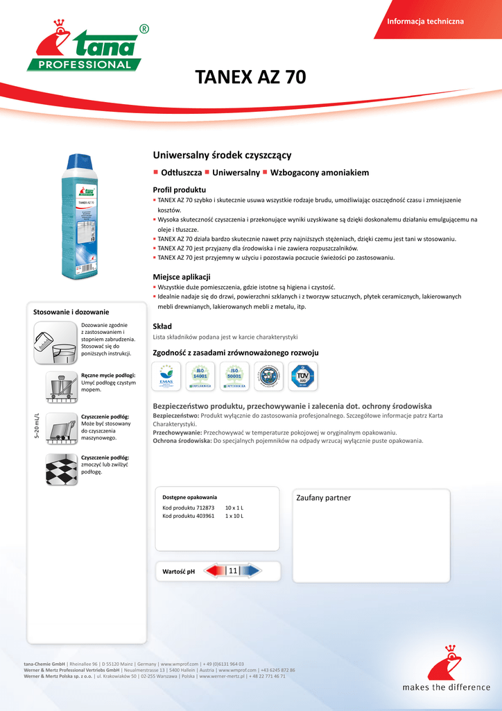 Informacja techniczna TANEX AZ 70 Uniwersalny środek czyszczący ■ Odtłuszcza ■ Uniwersalny ■ Wzbogacony amoniakiem Profil produktu TANEX AZ 70 szybko i skutecznie usuwa wszystkie rodzaje brudu, umożliwiając oszczędność czasu i zmniejszenie kosztów. ■ Wysoka skuteczność czyszczenia i przekonujące wyniki uzyskiwane są dzięki doskonałemu działaniu emulgującemu na oleje i tłuszcze. ■ TANEX AZ 70 działa bardzo skutecznie nawet przy najniższych stężeniach, dzięki czemu jest tani w stosowaniu. ■ TANEX AZ 70 jest przyjazny dla środowiska i nie zawiera rozpuszczalników. ■ TANEX AZ 70 jest przyjemny w użyciu i pozostawia poczucie świeżości po zastosowaniu. ■ Miejsce aplikacji ■ ■ Stosowanie i dozowanie Dozowanie zgodnie z zastosowaniem i stopniem zabrudzenia. Stosować się do poniższych instrukcji. Wszystkie duże pomieszczenia, gdzie istotne są higiena i czystość. Idealnie nadaje się do drzwi, powierzchni szklanych i z tworzyw sztucznych, płytek ceramicznych, lakierowanych mebli drewnianych, lakierowanych mebli z metalu, itp. Skład Lista składników podana jest w karcie charakterystyki Zgodność z zasadami zrównoważonego rozwoju Ręczne mycie podłogi: Umyć podłogę czystym mopem. 5–20 mL/L Bezpieczeństwo produktu, przechowywanie i zalecenia dot. ochrony środowiska Czyszczenie podłóg: Może być stosowany do czyszczenia maszynowego. Bezpieczeństwo: Produkt wyłącznie do zastosowania profesjonalnego. Szczegółowe informacje patrz Karta Charakterystyki. Przechowywanie: Przechowywać w temperaturze pokojowej w oryginalnym opakowaniu. Ochrona środowiska: Do specjalnych pojemników na odpady wrzucaj wyłącznie puste opakowania. Czyszczenie podłóg: zmoczyć lub zwilżyć podłogę. Zaufany partner Dostępne opakowania Kod produktu 712873 Kod produktu 403961 Wartość pH 10 x 1 L 1 x 10 L 11 tana-Chemie GmbH | Rheinallee 96 | D 55120 Mainz | Germany | www.wmprof.com | + 49 (0)6131 964 03 Werner & Mertz Professional Vertriebs GmbH | Neualmerstrasse 13 | 5400 Hallein | Austria | www.wmprof.com | +43 6245 872 86 Werner & Mertz Polska sp. z o.o. | ul. Krakowiaków 50 | 02-255 Warszawa | Polska | www.werner-mertz.pl | + 48 22 771 46 71
