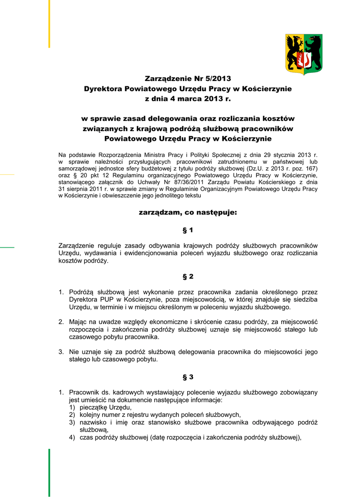 Zarządzenie Nr 5/2013 Dyrektora Powiatowego Urzędu Pracy w Kościerzynie z dnia 4 marca 2013 r. w sprawie zasad delegowania oraz rozliczania kosztów związanych z krajową podróżą służbową pracowników Powiatowego Urzędu Pracy w Kościerzynie Na podstawie Rozporządzenia Ministra Pracy i Polityki Społecznej z dnia 29 stycznia 2013 r. w sprawie należności przysługujących pracownikowi zatrudnionemu w państwowej lub samorządowej jednostce sfery budżetowej z tytułu podróży służbowej (Dz.U. z 2013 r. poz. 167) oraz § 20 pkt 12 Regulaminu organizacyjnego Powiatowego Urzędu Pracy w Kościerzynie, stanowiącego załącznik do Uchwały Nr 87/36/2011 Zarządu Powiatu Kościerskiego z dnia 31 sierpnia 2011 r. w sprawie zmiany w Regulaminie Organizacyjnym Powiatowego Urzędu Pracy w Kościerzynie i obwieszczenie jego jednolitego tekstu zarządzam, co następuje: §1 Zarządzenie reguluje zasady odbywania krajowych podróży służbowych pracowników Urzędu, wydawania i ewidencjonowania poleceń wyjazdu służbowego oraz rozliczania kosztów podróży. §2 1. Podróżą służbową jest wykonanie przez pracownika zadania określonego przez Dyrektora PUP w Kościerzynie, poza miejscowością, w której znajduje się siedziba Urzędu, w terminie i w miejscu określonym w poleceniu wyjazdu służbowego. 2. Mając na uwadze względy ekonomiczne i skrócenie czasu podróży, za miejscowość rozpoczęcia i zakończenia podróży służbowej uznaje się miejscowość stałego lub czasowego pobytu pracownika. 3. Nie uznaje się za podróż służbową delegowania pracownika do miejscowości jego stałego lub czasowego pobytu. §3 1. Pracownik ds. kadrowych wystawiający polecenie wyjazdu służbowego zobowiązany jest umieścić na dokumencie następujące informacje: 1) pieczątkę Urzędu, 2) kolejny numer z rejestru wydanych poleceń służbowych, 3) nazwisko i imię oraz stanowisko służbowe pracownika odbywającego podróż służbową, 4) czas podróży służbowej (datę rozpoczęcia i zakończenia podróży służbowej), 5) określenie celu podróży służbowej, 6) określenie środka lokomocji. 2. Pracownik wystawiający polecenie wyjazdu służbowego ewidencjonuje je w rejestrze wydanych poleceń wyjazdów służbowych, składa je do podpisu Dyrektorowi, a następnie po podpisaniu przekazuje osobie delegowanej. W przypadku, gdy udającym się w podróż służbową jest Dyrektor Urzędu, delegującym jest Starosta Kościerski. §4 1. Zwrot kosztów przejazdu środkami transportu zbiorowego (PKP-II klasa, PKS, inny przewoźnik) obejmuje cenę biletu określonego środka transportu, wraz ze związanymi z nimi opłatami dodatkowymi. 2. Rozliczenie kosztów przejazdu odnosi się do wydatku rzeczywistego, z uwzględnieniem przysługującej pracownikowi ulgi na dany środek transportu, bez względu na to, z jakiego tytułu ulga ta przysługuje. 3. Na wniosek pracownika, w uzasadnionych przypadkach, pracodawca może wyrazić zgodę na przejazd w podróży służbowej samochodem osobowym niebędącym własnością pracodawcy. 4. W przypadkach, o których mowa w ust. 3, zasady rozliczania podróży służbowej reguluje Zarządzenie nr 1/2011 Dyrektora PUP w Kościerzynie z dnia 5 stycznia 2011 r. w sprawie rozliczania podróży służbowej pracowników samochodem niebędącym własnością pracodawcy oraz Zarządzenie Nr 4/2013 Dyrektora Powiatowego Urzędu Pracy w Kościerzynie z dnia 4 marca 2013 r. w sprawie zmiany Zarządzenia Nr 1/2011 z dnia 5 stycznia 2011 r. §5 1. Pracownikowi z tytułu podróży służbowej przysługuje zwrot kosztów przejazdów, dojazdów środkami komunikacji miejscowej, noclegów i innych niezbędnych udokumentowanych wydatków oraz diety. 2. Do rozliczenia kosztów podróży pracownik załącza dokumenty, w szczególności rachunki, faktury lub bilety potwierdzające poszczególne wydatki. Nie dotyczy to zwrotu należności z tytułu diet oraz wydatków objętych ryczałtem, które wypłacane są na podstawie oświadczenia pracownika. 3. Jeżeli przedstawienie dokumentu potwierdzającego poniesienie wydatku nie jest możliwe, pracownik składa pisemne oświadczenie o dokonanym wydatku i przyczynach braku jego udokumentowania. Decyzję o akceptacji wydatku podpisuje Dyrektor Urzędu. 4. Pracownikowi przysługuje ryczałt na pokrycie kosztów dojazdów środkami komunikacji miejscowej, który wypłacany jest na podstawie oświadczenia pracownika zamieszczonego w rachunku kosztów podróży („Korzystałam/em lub nie korzystałam/em z komunikacji miejscowej”). 5. Jeżeli koszty przejazdu środkami komunikacji miejscowej są większe od przysługującego ryczałtu, pracodawca może wyrazić zgodę na ich zwrot na podstawie przedłożonych biletów. 6. Ryczałt na pokrycie kosztów dojazdu środkami komunikacji miejscowej nie przysługuje, jeżeli pracownik nie ponosi kosztów przejazdu w/w środkami komunikacji. 7. W przypadku braku bezpłatnego wyżywienia lub zapewnienia przez pracodawcę częściowego wyżywienia w czasie podróży służbowej, delegowanemu pracownikowi przysługuje dieta, zgodnie z § 7 w/w Rozporządzenia MPiPS. 8. Dodatkowe informacje i oświadczenie istotne dla prawidłowego rozliczenia kosztów podróży dotyczące korzystania z posiłków, pracownik zamieszcza w poleceniu wyjazdu służbowego w kolumnie „Stwierdzenie pobytu służbowego”. §6 1. Pracownik po odbyciu podróży służbowej jest zobowiązany wypełnić druk „Rachunek kosztów podróży” i przedłożyć wraz z załączonymi dokumentami potwierdzającymi poszczególne wydatki pracownikowi ds. kadrowych, celem weryfikacji danych zawartych w tych dokumentach. 2. Rachunek kosztów podróży zweryfikowany przez pracownika ds. kadrowych podlega kontroli merytorycznej dokumentów przez Kierownika Działu OrganizacyjnoAdministracyjnego. 3. Sprawdzone pod względem merytorycznym dokumenty potwierdzające odbycie podróży służbowej pracownik składa w Dziale 