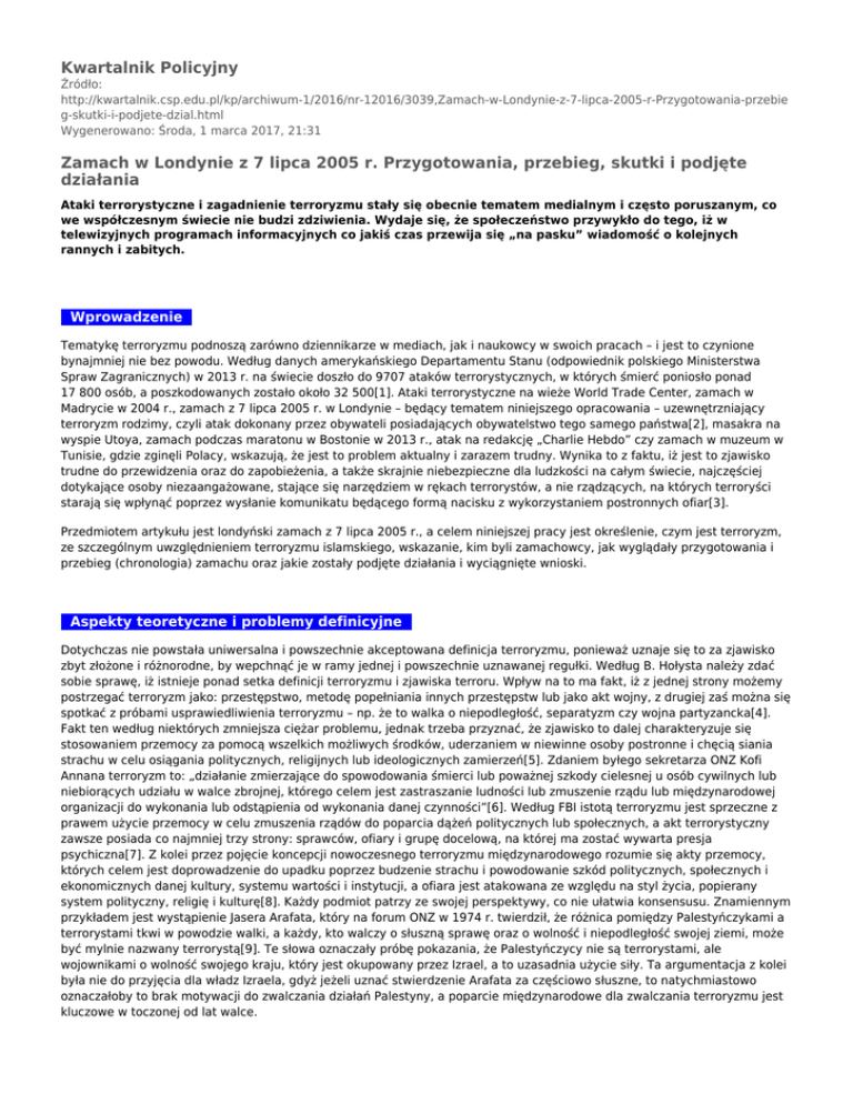 Kwartalnik Policyjny Źródło: http://kwartalnik.csp.edu.pl/kp/archiwum-1/2016/nr-12016/3039,Zamach-w-Londynie-z-7-lipca-2005-r-Przygotowania-przebie g-skutki-i-podjete-dzial.html Wygenerowano: Środa, 1 marca 2017, 21:31 Zamach w Londynie z 7 lipca 2005 r. Przygotowania, przebieg, skutki i podjęte działania Ataki terrorystyczne i zagadnienie terroryzmu stały się obecnie tematem medialnym i często poruszanym, co we współczesnym świecie nie budzi zdziwienia. Wydaje się, że społeczeństwo przywykło do tego, iż w telewizyjnych programach informacyjnych co jakiś czas przewija się „na pasku” wiadomość o kolejnych rannych i zabitych. Wprowadzenie Tematykę terroryzmu podnoszą zarówno dziennikarze w mediach, jak i naukowcy w swoich pracach – i jest to czynione bynajmniej nie bez powodu. Według danych amerykańskiego Departamentu Stanu (odpowiednik polskiego Ministerstwa Spraw Zagranicznych) w 2013 r. na świecie doszło do 9707 ataków terrorystycznych, w których śmierć poniosło ponad 17 800 osób, a poszkodowanych zostało około 32 500[1]. Ataki terrorystyczne na wieże World Trade Center, zamach w Madrycie w 2004 r., zamach z 7 lipca 2005 r. w Londynie – będący tematem niniejszego opracowania – uzewnętrzniający terroryzm rodzimy, czyli atak dokonany przez obywateli posiadających obywatelstwo tego samego państwa[2], masakra na wyspie Utoya, zamach podczas maratonu w Bostonie w 2013 r., atak na redakcję „Charlie Hebdo” czy zamach w muzeum w Tunisie, gdzie zginęli Polacy, wskazują, że jest to problem aktualny i zarazem trudny. Wynika to z faktu, iż jest to zjawisko trudne do przewidzenia oraz do zapobieżenia, a także skrajnie niebezpieczne dla ludzkości na całym świecie, najczęściej dotykające osoby niezaangażowane, stające się narzędziem w rękach terrorystów, a nie rządzących, na których terroryści starają się wpłynąć poprzez wysłanie komunikatu będącego formą nacisku z wykorzystaniem postronnych ofiar[3]. Przedmiotem artykułu jest londyński zamach z 7 lipca 2005 r., a celem niniejszej pracy jest określenie, czym jest terroryzm, ze szczególnym uwzględnieniem terroryzmu islamskiego, wskazanie, kim byli zamachowcy, jak wyglądały przygotowania i przebieg (chronologia) zamachu oraz jakie zostały podjęte działania i wyciągnięte wnioski. Aspekty teoretyczne i problemy definicyjne Dotychczas nie powstała uniwersalna i powszechnie akceptowana definicja terroryzmu, ponieważ uznaje się to za zjawisko zbyt złożone i różnorodne, by wepchnąć je w ramy jednej i powszechnie uznawanej regułki. Według B. Hołysta należy zdać sobie sprawę, iż istnieje ponad setka definicji terroryzmu i zjawiska terroru. Wpływ na to ma fakt, iż z jednej strony możemy postrzegać terroryzm jako: przestępstwo, metodę popełniania innych przestępstw lub jako akt wojny, z drugiej zaś można się spotkać z próbami usprawiedliwienia terroryzmu – np. że to walka o niepodległość, separatyzm czy wojna partyzancka[4]. Fakt ten według niektórych zmniejsza ciężar problemu, jednak trzeba przyznać, że zjawisko to dalej charakteryzuje się stosowaniem przemocy za pomocą wszelkich możliwych środków, uderzaniem w niewinne osoby postronne i chęcią siania strachu w celu osiągania politycznych, religijnych lub ideologicznych zamierzeń[5]. Zdaniem byłego sekretarza ONZ Kofi Annana terroryzm to: „działanie zmierzające do spowodowania śmierci lub poważnej szkody cielesnej u osób cywilnych lub niebiorących udziału w walce zbrojnej, którego celem jest zastraszanie ludności lub zmuszenie rządu lub międzynarodowej organizacji do wykonania lub odstąpienia od wykonania danej czynności”[6]. Według FBI istotą terroryzmu jest sprzeczne z prawem użycie przemocy w celu zmuszenia rządów do poparcia dążeń politycznych lub społecznych, a akt terrorystyczny zawsze posiada co najmniej trzy strony: sprawców, ofiary i grupę docelową, na której ma zostać wywarta presja psychiczna[7]. Z kolei przez pojęcie koncepcji nowoczesnego terroryzmu międzynarodowego rozumie się akty przemocy, których celem jest doprowadzenie do upadku poprzez budzenie strachu i powodowanie szkód politycznych, społecznych i ekonomicznych danej kultury, systemu wartości i instytucji, a ofiara jest atakowana ze względu na styl życia, popierany system polityczny, religię i kulturę[8]. Każdy podmiot patrzy ze swojej perspektywy, co nie ułatwia konsensusu. Znamiennym przykładem jest wystąpienie Jasera Arafata, który na forum ONZ w 1974 r. twierdził, że różnica pomiędzy Palestyńczykami a terrorystami tkwi w powodzie walki, a każdy, kto walczy o słuszną sprawę oraz o wolność i niepodległość swojej ziemi, może być mylnie nazwany terrorystą[9]. Te słowa oznaczały próbę pokazania, że Palestyńczycy nie są terrorystami, ale wojownikami o wolność swojego kraju, który jest okupowany przez Izrael, a to uzasadnia użycie siły. Ta argumentacja z kolei była nie do przyjęcia dla władz Izraela, gdyż jeżeli uznać stwierdzenie Arafata za częściowo słuszne, to natychmiastowo oznaczałoby to brak motywacji do zwalczania działań Palestyny, a poparcie międzynarodowe dla zwalczania terroryzmu jest kluczowe w toczonej od lat walce. Dużo częściej tworzy się definicje konkretnych rodzajów terroryzmu, np. cyberterroryzmu lub ekoterroryzmu, gdyż węższy zakres łatwiej zawrzeć w powszechnie akceptowalnych ramach[10]. Słowo terroryzm pochodzi od greckiego słowa treo, oznaczającego bać się, drżeć, oraz od łacińskiego czasownika terreo, oznaczającego wywoływać strach, przerażenie. Uważa się, że kluczową cechą terroryzmu jest poczucie niepewności, niebezpieczeństwa, odczuwanie zagrożenia i kształtowanie uległości, co odbywa się poprzez przemoc lub groźbę jej użycia. Równie ważna jest taktyka działania, która skutkuje tym, że najczęściej uderza się w otoczenie (postronne os
