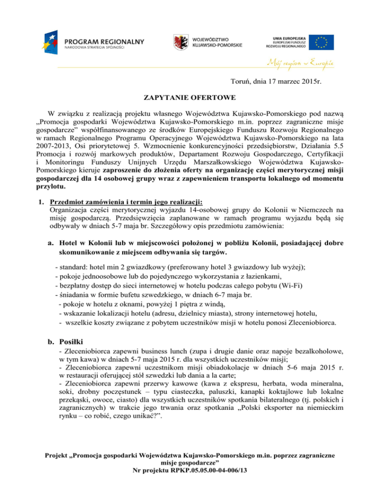 Toruń, dnia 17 marzec 2015r. ZAPYTANIE OFERTOWE W związku z realizacją projektu własnego Województwa Kujawsko-Pomorskiego pod nazwą „Promocja gospodarki Województwa Kujawsko-Pomorskiego m.in. poprzez zagraniczne misje gospodarcze” współfinansowanego ze środków Europejskiego Funduszu Rozwoju Regionalnego w ramach Regionalnego Programu Operacyjnego Województwa Kujawsko-Pomorskiego na lata 2007-2013, Osi priorytetowej 5. Wzmocnienie konkurencyjności przedsiębiorstw, Działania 5.5 Promocja i rozwój markowych produktów, Departament Rozwoju Gospodarczego, Certyfikacji i Monitoringu Funduszy Unijnych Urzędu Marszałkowskiego Województwa KujawskoPomorskiego kieruje zaproszenie do złożenia oferty na organizację części merytorycznej misji gospodarczej dla 14 osobowej grupy wraz z zapewnieniem transportu lokalnego od momentu przylotu. 1. Przedmiot zamówienia i termin jego realizacji: Organizacja części merytorycznej wyjazdu 14-osobowej grupy do Kolonii w Niemczech na misję gospodarczą. Przedsięwzięcia zaplanowane w ramach programu wyjazdu będą się odbywały w dniach 5-7 maja br. Szczegółowy opis przedmiotu zamówienia: a. Hotel w Kolonii lub w miejscowości położonej w pobliżu Kolonii, posiadającej dobre skomunikowanie z miejscem odbywania się targów. - standard: hotel min 2 gwiazdkowy (preferowany hotel 3 gwiazdowy lub wyżej); - pokoje jednoosobowe lub do pojedynczego wykorzystania z łazienkami, - bezpłatny dostęp do sieci internetowej w hotelu podczas całego pobytu (Wi-Fi) - śniadania w formie bufetu szwedzkiego, w dniach 6-7 maja br. - pokoje w hotelu z oknami, powyżej 1 piętra z windą, - wskazanie lokalizacji hotelu (adresu, dzielnicy miasta), strony internetowej hotelu, - wszelkie koszty związane z pobytem uczestników misji w hotelu ponosi Zleceniobiorca. b. Posiłki - Zleceniobiorca zapewni business lunch (zupa i drugie danie oraz napoje bezalkoholowe, w tym kawa) w dniach 5-7 maja 2015 r. dla wszystkich uczestników misji; - Zleceniobiorca zapewni uczestnikom misji obiadokolacje w dniach 5-6 maja 2015 r. w restauracji oferującej stół szwedzki lub dania a la carte; - Zleceniobiorca zapewni przerwy kawowe (kawa z ekspresu, herbata, woda mineralna, soki, drobny poczęstunek – typu ciasteczka, paluszki, kanapki koktajlowe lub lokalne przekąski, owoce, ciasto) dla wszystkich uczestników spotkania bilateralnego (tj. polskich i zagranicznych) w trakcie jego trwania oraz spotkania „Polski eksporter na niemieckim rynku – co robić, czego unikać?”. Projekt „Promocja gospodarki Województwa Kujawsko-Pomorskiego m.in. poprzez zagraniczne misje gospodarcze” Nr projektu RPKP.05.05.00-04-006/13 c. Transport - zapewnienie transportu w postaci autokaru/busa z kierowcą do wyłącznej dyspozycji grupy: o transport z lotniska w Niemczech do hotelu i z hotelu na lotnisko w Niemczech (dokładna lokalizacja lotniska zostanie przekazana w terminie późniejszym); o transport lokalny do 500 km licząc w okresie od momentu wyjazdu z lotniska w dniu 5 maja 2015 r. do momentu dojechania grupy na lotnisko w dniu 7 maja 2015 r. Zleceniodawca zastrzega możliwość zgłoszenia tras przejazdu dalej niż ww. 500 km. W ofercie należy wskazać cenę każdego dodatkowego, rzeczywiście przejechanego kilometra. - koszty związane z zatrudnieniem, ubezpieczeniem, noclegiem kierowcy (kierowców), opłatami parkingowymi oraz innymi związanymi ze świadczoną usługą ponosi Wykonawca; - autokar/bus powinien mieć maksimum 5 lat, posiadać sprawną klimatyzację, być w pełni sprawny, schludny i czysty, autokar/bus powinien posiadać pasy bezpieczeństwa oraz wydzielone miejsce bagażowe. d. Ubezpieczenie Zleceniobiorca wykupi ubezpieczenie zdrowotne i NNW dla wszystkich członków delegacji na cały czas trwania misji gospodarczej, zarówno na terenie Polski jak i Niemiec. e. Zorganizowanie wizyty studyjnej w wybranym przedsiębiorstwie i/ lub spotkania z architektami i projektantami wnętrz - Zleceniobiorca zobowiązuje się do dokonania wyboru jednej firmy niemieckiej, w której zostanie zorganizowana wizyta studyjna. Profil firmy powinien odpowiadać branży meblarskiej. i/lub - zorganizowanie spotkania z architektami i projektantami wnętrz, którzy pomogli by firmom polskim uczestniczącym w misji gospodarczej, w sprzedaży produktów na rynek niemiecki - spotkanie musi być koordynowane (tj. wprowadzenie uczestników misji, wzajemne przedstawienie przedstawicieli zwiedzanego przedsiębiorstwa niemieckiego/ architektów i uczestników misji) przez osobę zapewnioną przez Zleceniobiorcę – opiekuna/pilota grupy, która porozumiewa się w języku polskim i niemieckim. f. Organizacja wizyty uczestników misji na tragach INTERZUM w Kolonii - zakup wejściówek dla uczestników misji (14 osób) , Projekt „Promocja gospodarki Województwa Kujawsko-Pomorskiego m.in. poprzez zagraniczne misje gospodarcze” Nr projektu RPKP.05.05.00-04-006/13 - Zleceniobiorca dopełni wszelkich niezbędnych wymagań formalnych, stawianych przez organizatora targów INTERZUM, dotyczących rejestracji i uczestnictwa członków misji (np. wypełnienie i wysłanie zgłoszeń). g. Organizacja spotkania „Polski eksporter na niemieckim rynku – co robić, czego unikać?” - Zleceniobiorca zobowiązuje się do przygotowania treści spotkania i wybrania prelegentów. Spotkanie powinno trwać ok 2-3 godz.; - oczekiwania co do tematyki spotkania: wprowadzenie w tematykę polsko-niemieckich kontaktów gospodarczych, sposób postrzegania polskiego przedsiębiorcy przez przedsiębiorcę niemieckiego, zagadnienia praktyczne- co robić, czego unikać aby nawiązać i utrzymać owocną współpracę; - wynajęcie klimatyzowanej sali do spotkań w standardzie biznesowym; - wyposażenie wynajętej sali w sprzęt techniczny zapewniający obsługę spotkań, jak np. mównica, nagłośnienie, rzutnik z ekranem i podłączeniem do komputera, krzesła i stoliki dla wszystkich uczestnikó