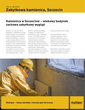 Karta obiektu Zabytkowa kamienica, Szczecin Kamienica w Szczecinie – wiekowy budynek zachowa zabytkowy wygląd Kamienica na rogu ulic Księcia gęstość materiału pozwalająca Bogusława i Jagiellońskiej wymaga- osiągnąć niski współczynnik ła generalnego remontu. Budynek, przewodzenia ciepła, niepalność, Technologia Multipor spełnia mieszczący lokale prywatne, jest a także, co szczególnie docenili wymagania dotyczące ochrony obiektem zabytkowym, co oznacza, pracownicy firmy remontującej obiektów zabytkowych, jak i te że jego elewacja podlega ochronie budynek, łatwość w obróbce. dotyczące ich termomodernizacji. konserwatorskiej. Nie było możliwe Zastosowanie tego rozwiązania Multipor to często jedyny sposób ocieplenie ścian metodą tradycyjną pozwoliło spełnić aktualne wymogi na uratowanie niszczejącego obiektu od zewnątrz. Rozwiązaniem okazały dotyczące izolacyjności cieplnej, przy i poprawę jego izolacji cieplnej. się płyty, które zastosowano jednoczesnym respektowaniu we wszystkich pomieszczeniach warunków związanych z ochroną Płyty Multipor mają bardzo szerokie kamienicy. Za ich użyciem przema- zabytków i zachowaniem oryginalnej zastosowanie, jednak w przypadku wiały właściwości płyt – niska elewacji. Natomiast mieszkańcy zabytków najczęściej stosuje się kamienicy zyskali komfort cieplny. Multipor – łatwa obróbka i montaż płyt do ściany je jako warstwę ocieplenia ściany Informacje dotyczące obiektu od wewnątrz. Rodzaj obiektu Zabytkowa kamienica Przeznaczenie obiektu Budynek mieszkalny Przed wykonaniem ocieplenia Miejscowość Szczecin, róg ulic Księcia Bogusława i Jagiellońskiej płytami Multipor warto przeprowa- Inwestor KONSART Sp z o.o. Konserwacja Zabytków Architektury Budownictwo Projektant KONSART Sp z o.o. Konserwacja Zabytków Architektury Budownictwo Firma wykonawcza KONSART Sp z o.o. Konserwacja Zabytków Architektury Budownictwo dzić analizę cieplno-wilgotnościową ściany. Polega ona na symulacji długoletniego okresu pracy przegrody w zadanych warunkach wilgoci oraz temperatury i pozwala na Zastosowane produkty określenie poziomu wilgoci groma- Rok zakończenia prac remontowych dzonej w murze w okresie zimowym. Właściwości Multipora Analiza cieplno-wilgotnościowa umożliwia wybór bezpiecznego wariantu izolacji z wykorzystaniem płyt Multipor. Można ją zamówić Multipor o grub. 60 mm - 30 m3 2009 Współczynnik przewodzenia ciepła 0,043 W/(mK) Klasa materiałów budowlanych A1 zgodnie z EN 13501-1 Gęstość ≤ 115 kg/m3 Wysoka stabilność i wytrzymałość na ściskanie ≤ 300 kPa Łatwość obróbki Europejska Aprobata techniczna ETA – 05/0093 Szeroki asortyment – grubość od 30 do 200 mm za pośrednictwem strony sklep.xella.pl. Zastosowanie płyt Multipor nie wymaga kołkowania, ani innych mocowań mechanicznych. Płyty jedynie przykleja się do ściany przy pomocy lekkiej zaprawy Multipor, która stanowi ważne uzupełnienie systemu. Korzyści z zastosowania ocieplenia od wewnątrz płytami Multipor: Zachowanie zabytkowej elewacji Do 70% niższe rachunki za ogrzewanie Niższe koszty robocizny dzięki szybkiemu montażowi Uzyskanie przyjaznego mikroklimatu pomieszczeń Całkowicie bezpieczne funkcjonowanie przegrody przy izolacji od wewnątrz. Zachęcamy Państwa do kontaktu z nami w celu porozmawiania o możliwości realizacji konkretnej inwestycji z wykorzystaniem płyt Multipor: 801 122 227 lub 29 767 03 60 Analizę cieplno-wilgotnościową dla indywidualnej przegrody mogą Państwo zamówić na stronie sklep.xella.pl