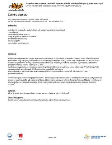 Scenariusz eksperymentu pochodzi z portalu Klubów Młodego Odkrywcy : www.kmo.org.pl Link do elektronicznej wersji scenariusza: www.kmo.org.pl/scenariusze/13 Camera obscura autor: Klub Młodego Odkrywcy dziedzina: Fizyka dział: Optyka min ilość osób potrzbna do realizacji: 1 szacowany czas: 60 min szacowany koszt: 15 zł składniki: pudełko, np. po butach z grubej tektury lub rura po wykładzinie dywanowej czarny karton papierowa taśma lakiernicza nożyczki, piłka do metalu lub drewna arkusze kalki technicznej świece i zapałki zaciemnione pomieszczenie przebieg: Jeżeli używamy papierowej rury po wykładzinie dywanowej, to musimy odciąć kawałek długości około 20 cm. Następnie jeden koniec rury zaklejamy czarnym kartonem (najlepiej podwójnym), a drugi koniec rury kalką techniczną. Karton i kalkę możemy przymocować do rury papierową taśmą lakierniczą. W czarnym kartonie, pośrodku, wykonujemy cyrklem lub gwoździkiem mały otwór o średnicy ok. 2 mm. Jeżeli używamy pudełka, to nakładamy jego pokrywkę i przyklejamy ją papierową taśmą lakierniczą. W najkrótszym boku wycinamy otwór o średnicy ok. 10-12 cm i zaklejamy go kalką techniczną. W przeciwległym boku, pośrodku, wykonujemy cyrklem lub gwoździkiem mały otwór o średnicy ok. 2 mm. Kamera jest gotowa. Przechodzimy do zaciemnionego pomieszczenia. Zapalamy świecę i umieszczamy ją w odległości kilkunastu centymetrów od otworu w ścianie pudełka lub w czarnej tekturze. Obserwujemy obrazy na kalce technicznej. Kamerę zbliżamy i oddalamy od płomienia świecy. Następnie zapalamy drugą świecę i obserwujemy dwa płomienie jednocześnie. Możemy świecami poruszać. pytania: Jak to się dzieje, że widzimy ruchome obrazy płomieni świec na kalce technicznej? słowa kluczowe: światło kamera aparat promienie fotografia matówka zdjęcie fotografia otworkowa strona 1/1