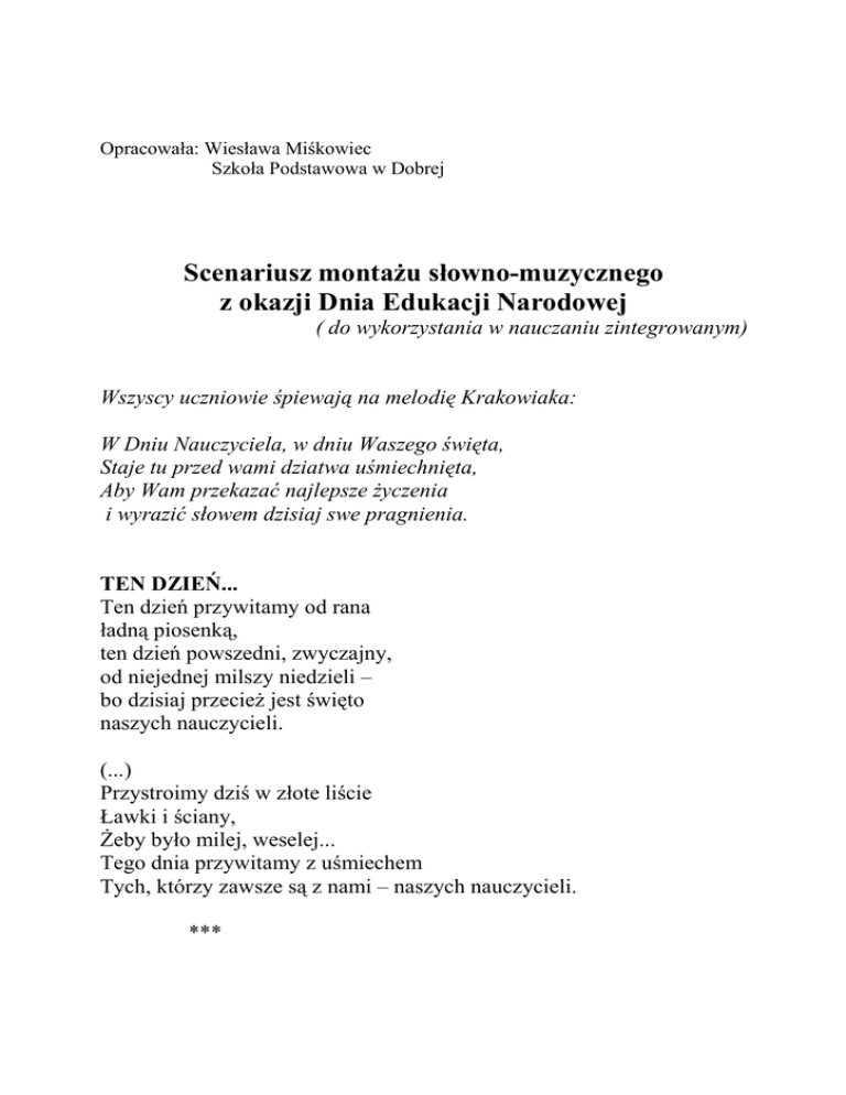 Opracowała: Wiesława Miśkowiec Szkoła Podstawowa w Dobrej Scenariusz montaŜu słowno-muzycznego z okazji Dnia Edukacji Narodowej ( do wykorzystania w nauczaniu zintegrowanym) Wszyscy uczniowie śpiewają na melodię Krakowiaka: W Dniu Nauczyciela, w dniu Waszego święta, Staje tu przed wami dziatwa uśmiechnięta, Aby Wam przekazać najlepsze Ŝyczenia i wyrazić słowem dzisiaj swe pragnienia. TEN DZIEŃ... Ten dzień przywitamy od rana ładną piosenką, ten dzień powszedni, zwyczajny, od niejednej milszy niedzieli – bo dzisiaj przecieŜ jest święto naszych nauczycieli. (...) Przystroimy dziś w złote liście Ławki i ściany, śeby było milej, weselej... Tego dnia przywitamy z uśmiechem Tych, którzy zawsze są z nami – naszych nauczycieli. *** ChociaŜ na dworze deszcz jesienny I z drzew kołując spada liść... Dzisiejszy dzień ma blask wiosenny I skrzydła ma radosna myśl. Bo dzisiaj Dzień Nauczyciela... To właśnie Pani, Pana Dzień. Dziś nawet deszcz się rozwesela I szepcze: - chmurko w blask się zmień! Zebraliśmy się tutaj wszyscy, By wypowiedzieć – choć słów brak – W ten dzień ogromnie uroczysty Ogromną wdzięczność, oto tak. Piosenka: „Piosenka dla naszej Pani” 1. Wiatr w górze obłoczki, owieczki pasie, cichutko, cichutko siedzimy w klasie. Błękitny strumyczek z gór wodę toczy Ma Pani błękitne, dobre oczy. Ref: Dziś piosenkę mamy nową, prosto z serca płynie w świat. W tej piosence kaŜde słowo to dla Pani kwiat. 2. Kalina, kalina korale na niej My Panią kochamy, nas kocha Pani. Ćwierkają wróbelki, wiatr w szybę dmucha Śpiewamy piosenkę - Pani słucha. Podziękowanie Dziękujemy jak kaŜdego roku! Z kaŜdym rokiem bardziej i goręcej, bo to dzięki Wam, Nauczyciele, wiemy, rozumiemy z kaŜdą lekcją więcej. Dziękujemy, jak kaŜdego roku… WciąŜ zbyt mało i nigdy zbyt wiele – Za to światło, co mroki rozjaśnia. Dziękujemy Wam, Nauczyciele! Radosny dzień Dzisiaj Dzień Nauczyciela. Więc raniutko, przed lekcjami, cała klasa uśmiechnięta dała kwiaty naszej pani. I Ŝyczyła pomyślności, I wszystkiego najlepszego, no, a Pani dziękowała koleŜankom i kolegom. Dzisiaj Dzień Nauczyciela. No i właśnie przy tym święcie Staś nie odrobione lekcje przyniósł Pani dziś w prezencie. Ewa zaś ma w swym zeszycie Takie kleksy, takie błędy, Ŝe aŜ kwiaty naszej Pani na ich widok zaraz zwiędły! Jeszcze Dzień Nauczyciela całkiem nam się popsuć gotów! Gdyby była dziś niedziela, nie byłoby tych kłopotów. MoŜe byłoby przyjemniej, i świąteczniej, i weselej, gdyby Dzień Nauczyciela przełoŜono na niedzielę? Ale chyba nie mam racji, bo … słuchajcie! Czy słyszycie? Cała klasa na pytania odpowiada znakomicie! Znowu Pani - uśmiechnięta, znowu jest radości wiele. Dobrze jest, Ŝe dzień Jej święta nie wypada nam w niedzielę! Piosenka: „Nasza Pani” Nasza Pani jest kolorowa uśmiechnięta jak polny kwiat. Troskę o nas w swym sercu chowa Wie, Ŝe kaŜdy ma trochę wad. Ref. My kochamy naszą Panią Tak na co dzień, nie od święta. śyczymy szczęścia, radości, Ŝeby była uśmiechnięta. *** (Wszyscy uczniowie chórem) Dziś jest Dzień Nauczyciela, Czas radości i wesela! Dziś składają Wam uczniowie Ŝyczeń moc w wiązanej mowie! (Uczniowie kolejno) -Niech Wam los łaskawy sprzyja! -Niech Was szczęście nie omija! -Niechaj głupstwa Was nie smucą! -Niech Wam gwiazdy do snu nucą! -Niechaj świat się do as śmieje! -Niech wiatr w oczy Wam nie wieje! -Niechaj Was omija grypka! -Wiernie słuŜy złota rybka! -Mądrych uczniów cne gromady wygrywają olimpiady! -Niech pedagogiczne ciało ku sukcesom kroczy śmiało! -A pedagogiczna dusza niech umysły nam rozrusza! (Pozostali uczniowie chórem) -Czerpcie z rogu obfitości całe fury cierpliwości, aby znosić bez paniki nasze psoty i wybryki! (Wszyscy razem) -Tego dziś w wiązanej mowie wszyscy Ŝyczą Wam uczniowie! Piosenka : „Słowa dla Naszej Pani” (Podręcznik cz. I, str. 70, „WESOŁA SZKOŁA” dla klasy III nagranie na kasecie magnetof. Wydaw. WESOŁA SZKOŁA ,cz.I dla klasy III) (Po zakończeniu części artystycznej uczniowie wręczają laurki zebranym na sali Gościom) Literatura: Krystyna Lenkiewicz - „Wybór wierszy okolicznościowych dla klas I – III”, WSiP Warszawa 1994, Ryszard Przymus -„Uroczystości pełne radości”, Wydawnictwo JUKA, Łódź 1994 Podręcznik „Wesoła szkoła”kl.III i kaseta audio wydaw. WSiP
