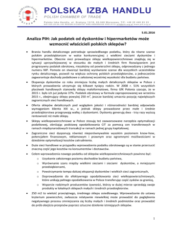POLSKA IZBA HANDLU POLISH CHAMBER OF TRADE Polska Izba Handl u, ul. Grażyny 13/10, 02 -548 W arszawa, T/F: +48 22 440 83 23 NIP:525-20-04-193 REGON:012864197 KRS: 0000099228 EKD:9112 [email protected] www.pih.org .pl 5.01.2016 Analiza PIH: Jak podatek od dyskontów i hipermarketów może wzmocnić właścicieli polskich sklepów? Branża handlu detalicznego potrzebuje sprawiedliwego podatku, który da równe szanse polskim przedsiębiorcom w walce konkurencyjnej z wielkimi sieciami dyskontów i hipermarketów. Obecnie sieci prowadzące sklepy wielkopowierzchniowe znajdują się w sytuacji uprzywilejowanej w stosunku do małych i średnich firm Rozwiązaniem jest progresywny podatek obrotowy, niezależny od powierzchni sklepu, odprowadzany z jednego numeru NIP. Pomoże on stworzyć bardziej wyrównane szanse dla wszystkich uczestników rynku detalicznego, pozwoli na większa ochronę polskich przedsiębiorców, a jednocześnie zagwarantuje dochody podatkowe o założonej wcześniej wysokości dla budżetu państwa. Ekspansja dyskontów co roku zmniejsza liczbę małych detalicznych sklepów w Polsce z których prowadzenia utrzymuje się kilkaset tysięcy rodzin. W 2008 r. 51% wszystkich placówek handlowych stanowiły sklepy małoformatowe, firma GfK Polonia szacuje, że w 2015 r. było ich już jedynie 37%. Podatek obrotowy w formule zaproponowanej we wrześniu 2015 r., obejmujący sklepy powyżej 250 m2, jeszcze bardziej umacnia pozycję największych zagranicznych sieci handlowych. Oferta sklepów detalicznych pod względem jakości i różnorodności bardziej odpowiada wymaganiom klienta XXI w., a jednak sklepy prowadzone przez małe i średnie przedsiębiorstwa przegrywają walkę z dyskontami. Dyskonty generują dwa - trzy razy wyższą rentowność niż małe sklepy. Sklepy wielkopowierzchniowe w Polsce stosują też zaawansowane narzędzia optymalizacji podatkowej, obniżając podstawę opodatkowania CIT za pomocą cen transferowych w ramach międzynarodowych transakcji w ramach jednej grupy kapitałowej. Zagraniczne sieci dysponują również nieporównywalnie wysokim poziomem know-how, potencjałem finansowym, reklamowym i prawnym oraz ogromnymi możliwościami w dziedzinie optymalizacji kosztów zatrudnienia. Duże sieci handlowe w przypadku wprowadzenia podatku obrotowego są w stanie przerzucić znaczną część jego kosztów na konsumentów i dostawców. Celem wprowadzenia nowego podatku od sklepów wielkopowierzchniowych powinno być: o Uzyskanie założonego poziomu dochodów budżetu państwa, o Wyrównanie szans między wielkimi sieciami i sieciami dyskontów, a mniejszymi przedsiębiorcami, o Powstrzymanie tempa dalszej ekspansji dyskontów i wielkich sieci zagranicznych, o Doprowadzenie do efektywnego opodatkowania sieci wielkopowierzchniowych, które unikają pełnego opodatkowania w Polsce transferując część zysków za granicę, o Wsparcie rodzimych producentów żywności, którzy w dużej mierze sprzedają swoje produkty w lokalnych sklepach małych i średnich przedsiębiorstw. 250 m2 to wielość przeciętnego, średniego sklepu osiedlowego. Wprowadzanie do ustawy kryterium powierzchni, zwłaszcza relatywnie niewielkiej może prowadzić do pogłębienia negatywnego procesu zmniejszania się liczby małych i średnich podmiotów oraz prowadzić do prób obejścia przepisów poprzez sztuczne dzielenie istniejących sklepów. 1 POLSKA IZBA HANDLU POLISH CHAMBER OF TRADE Polska Izba Handl u, ul. Grażyny 13/10, 02 -548 W arszawa, T/F: +48 22 440 83 23 NIP:525-20-04-193 REGON:012864197 KRS: 0000099228 EKD:9112 [email protected] www.pih.org .pl 1 Podatek uzależniony od powierzchni sklepu zachęca do podejmowania działań, które nie są w interesie klientów. Wprowadzany podatek nie powinien obejmować sieci franczyzowych ani hurtowni. Franczyza jest formą obrony małego i średniego handlu wobec potęgi wielkich sieci i dyskontów. Z kolei opodatkowanie hurtowni sprawiłoby, że sklepy kupujące w nich towar byłyby de facto opodatkowane podwójnie. Wprowadzono opinię publiczną w błąd nazywając podatek od wielkopowierzchniowego handlu detalicznego podatkiem od supermarketów. Supermarkety to sklepy o średniej wielkości - od 400 m2, w 70% pozostające w rękach polskich przedsiębiorców. Powierzchnia handlowa rzędu kilkuset metrów pozwala polskiemu detaliście skutecznie walczyć z dyskontem. Planowany podatek poprawniej byłoby nazywać podatkiem od dyskontów i hipermarketów. Ekspansja wielkopowierzchniowych sieci zagranicznych i dyskontów nie tylko przyczynia się do kurczenia się i stopniowej likwidacji polskich rodzinnych sklepów, ale także prowadzi do stopniowego eliminowania z rynku lokalnych producentów. Mimo, że zdecydowana większość żywności konsumowanej w Polsce jest wytwarzana w kraju, to aż 80% rynku spożywczego (nie licząc piekarni) należy do kapitału zagranicznego. Polscy producenci dominują tylko w branży mleczarskiej i w sektorze słodyczy. W debacie na temat opodatkowania handlu wielkopowierzchniowego dobrze jest zacząć od podstawowych definicji obiektów handlowych, które mają kluczowe znaczenie przy projektowaniu przepisów prawa. Zgodnie z terminologią stosowaną przez GUS1: o Supermarkety są to sklepy o powierzchni sprzedażowej od 400 m2 do 2499 m2 prowadzące sprzedaż głównie w systemie samoobsługowym, oferujące szeroki asortyment artykułów żywnościowych oraz artykuły nieżywnościowe częstego zakupu. o Hipermarkety są to sklepy o powierzchni sprzedażowej od 2500 m2 prowadzące sprzedaż głównie w systemie samoobsługowym, oferujące szeroki asortyment artykułów żywnościowych i nieżywnościowych częstego zakupu, zwykle z parkingiem samochodowym. o Powierzchnia sprzedażowa sklepu – część lokalu sklepowego przeznaczona na ekspozycję towarów oraz sprzedaż (tzn. część przeznaczona do eksponowania towarów i obsługi nabywców), mierzona w m2. o Małe przedsiębiorstwo to po