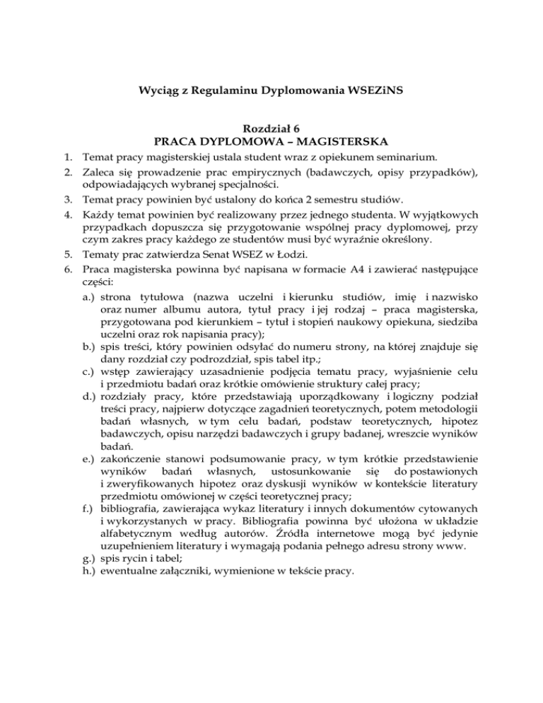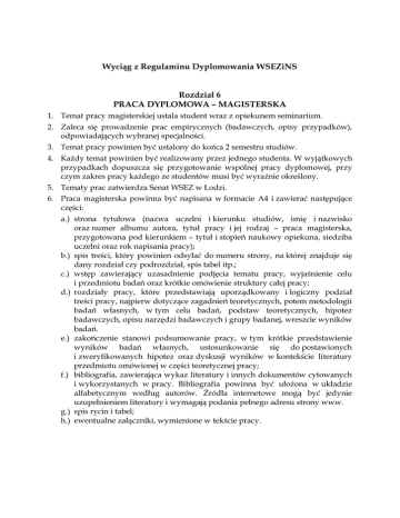 Wyciąg z Regulaminu Dyplomowania WSEZiNS Rozdział 6 PRACA