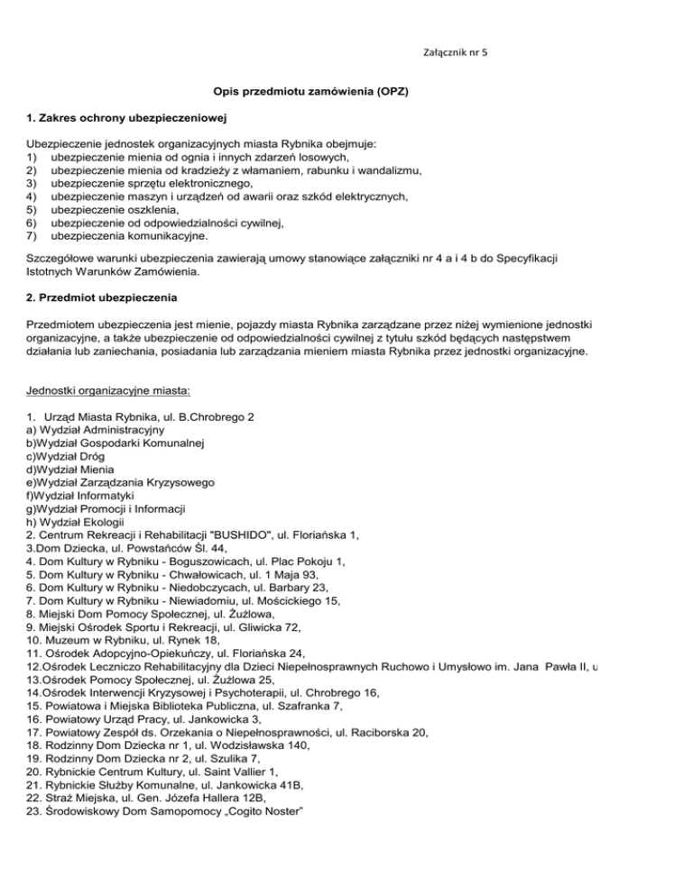 Załącznik nr 5 Opis przedmiotu zamówienia (OPZ) 1. Zakres ochrony ubezpieczeniowej Ubezpieczenie jednostek organizacyjnych miasta Rybnika obejmuje: 1) ubezpieczenie mienia od ognia i innych zdarzeń losowych, 2) ubezpieczenie mienia od kradzieŜy z włamaniem, rabunku i wandalizmu, 3) ubezpieczenie sprzętu elektronicznego, 4) ubezpieczenie maszyn i urządzeń od awarii oraz szkód elektrycznych, 5) ubezpieczenie oszklenia, 6) ubezpieczenie od odpowiedzialności cywilnej, 7) ubezpieczenia komunikacyjne. Szczegółowe warunki ubezpieczenia zawierają umowy stanowiące załączniki nr 4 a i 4 b do Specyfikacji Istotnych Warunków Zamówienia. 2. Przedmiot ubezpieczenia Przedmiotem ubezpieczenia jest mienie, pojazdy miasta Rybnika zarządzane przez niŜej wymienione jednostki organizacyjne, a takŜe ubezpieczenie od odpowiedzialności cywilnej z tytułu szkód będących następstwem działania lub zaniechania, posiadania lub zarządzania mieniem miasta Rybnika przez jednostki organizacyjne. Jednostki organizacyjne miasta: 1. Urząd Miasta Rybnika, ul. B.Chrobrego 2 a) Wydział Administracyjny b)Wydział Gospodarki Komunalnej c)Wydział Dróg d)Wydział Mienia e)Wydział Zarządzania Kryzysowego f)Wydział Informatyki g)Wydział Promocji i Informacji h) Wydział Ekologii 2. Centrum Rekreacji i Rehabilitacji "BUSHIDO", ul. Floriańska 1, 3.Dom Dziecka, ul. Powstańców Śl. 44, 4. Dom Kultury w Rybniku - Boguszowicach, ul. Plac Pokoju 1, 5. Dom Kultury w Rybniku - Chwałowicach, ul. 1 Maja 93, 6. Dom Kultury w Rybniku - Niedobczycach, ul. Barbary 23, 7. Dom Kultury w Rybniku - Niewiadomiu, ul. Mościckiego 15, 8. Miejski Dom Pomocy Społecznej, ul. śuŜlowa, 9. Miejski Ośrodek Sportu i Rekreacji, ul. Gliwicka 72, 10. Muzeum w Rybniku, ul. Rynek 18, 11. Ośrodek Adopcyjno-Opiekuńczy, ul. Floriańska 24, 12.Ośrodek Leczniczo Rehabilitacyjny dla Dzieci Niepełnosprawnych Ruchowo i Umysłowo im. Jana Pawła II, ul. Hibnera 55, 13.Ośrodek Pomocy Społecznej, ul. śuŜlowa 25, 14.Ośrodek Interwencji Kryzysowej i Psychoterapii, ul. Chrobrego 16, 15. Powiatowa i Miejska Biblioteka Publiczna, ul. Szafranka 7, 16. Powiatowy Urząd Pracy, ul. Jankowicka 3, 17. Powiatowy Zespół ds. Orzekania o Niepełnosprawności, ul. Raciborska 20, 18. Rodzinny Dom Dziecka nr 1, ul. Wodzisławska 140, 19. Rodzinny Dom Dziecka nr 2, ul. Szulika 7, 20. Rybnickie Centrum Kultury, ul. Saint Vallier 1, 21. Rybnickie SłuŜby Komunalne, ul. Jankowicka 41B, 22. StraŜ Miejska, ul. Gen. Józefa Hallera 12B, 23. Środowiskowy Dom Samopomocy „Cogito Noster” 24. Zakład Gospodarki Mieszkaniowej, ul. 3 Maja 12, 25. Zarząd Transportu Zbiorowego w Rybniku, ul. Budowlanych 6, 26. Zarząd Zieleni Miejskiej, ul. Pod Lasem 64, 27. Zespół Ognisk Wychowawczych, ul. Barbary 22, 28. Przedszkole nr 1, ul. Kościuszki 12, 29. Przedszkole nr 2, ul. Wodzisławska 51, 30. Przedszkole nr 3, ul. Za Torem 3 B, 31. Przedszkole nr 4, ul. Karola Miarki 72, 32. Przedszkole nr 5, ul. Mariańska 1, 33. Przedszkole nr 6, ul. Nacyńska 6, 34. Przedszkole nr 7, ul. Solskiego 2, 35. Przedszkole nr 9, ul. Wieniawskiego 9, 36. Przedszkole nr 10, ul. Św. Józefa 9, 37. Przedszkole nr 11 im. Marii Konopinickiej, ul. Westerplatte 10, 38. Przedszkole nr 12, ul. Zebrzydowicka 182, 39. Przedszkole nr 13 im. M. Kownackiej, ul. 1 Maja 29, 40. Przedszkole nr 14 im. J. Korczaka, ul. Śląska 1a, 41. Przedszkole nr 15, ul. Os. Południe 57b, 42. Przedszkole z Oddziałami Integracyjnymi nr 17 im. J. Brzechwy, ul. KrzyŜowa 12, 43. Przedszkole nr 18, ul. Małachowskiego 40, 44. Przedszkole nr 19, ul. śurawia 2, 45. Przedszkole nr 20, ul. Czwartaków 1, 46. Przedszkole nr 21, ul. Bracka 6, 47. Przedszkole nr 22, ul. Gotartowicka 24, 48. Przedszkole nr 23, ul. Górnośląska 21, 49. Przedszkole nr 25, ul. Weroniki 8, 50. Przedszkole nr 26, ul. Konarskiego 49, 51. Przedszkole nr 31, ul. Grodzka 14, 52. Przedszkole nr 32, ul. Gminna 6, 53. Przedszkole nr 35, ul. Łączna 9, 54. Przedszkole nr 36, ul. Winklera 6, 55.Przedszkole nr 37 im.J.Tuwima ul.Św.Maksymiliana 24 56. Przedszkole nr 39, ul. Os. Południe 20, 57. Przedszkole nr 41 "Puchatkowo", ul. Chabrowa 11, 58. Przedszkole nr 42 "Tęczowa Kraina", ul. Stalmacha 8, 59. Przedszkole nr 43, ul. Broniewskiego 26, 60. Zespół Szkolno - Przedszkolny Nr 1, ul. Gliwicka 105, 61. Zespół Szkolno - Przedszkolny Nr 2, ul. Morcinka 14, 62. Zespół Szkolno-Przedszkolny nr 3 im. Jana Pawła II, ul. Bernarda Kuglera 8a, 63. Zespół Szkolno-Przedszkolny nr 4 im. L. Kruczkowskiego, ul. Komisji Edukacji Narodowej 29, 64. Szkoła Podstawowa nr 1 im. Janusza Korczaka, ul. Chrobrego 29, 65. Szkoła Podstawowa nr 2, ul. Wodzisławska 46, 66. Szkoła Podstawowa nr 3 im. S. Kostki, ul. Wolna 17, 67. Szkoła Podstawowa nr 5 im. M. Kopernika, ul. RóŜańskiego 14a, 68. Szkoła Podstawowa nr 6, ul. Wodzisławska 123, 69. Szkoła Podstawowa nr 11 im. Maksymiliana Basisty, ul. Hibnera 25, 70. Szkoła Podstawowa nr 12 im. Kard. S. Wyszyńskiego, ul. Buhla 3, 71. Szkoła Podstawowa nr 13 im. Bohaterskich Harcerzy Rybnika – Chwałowic, ul. 1 Maja 51, 72. Szkoła Podstawowa nr 15 im. Ks. Prałata K. Szwedy, ul. Św. Maksymiliana 26, 73. Szkoła Podstawowa nr 16, ul. Małachowskiego 44, 74. Szkoła Podstawowa nr 18, ul. Lompy 6, 75. Szkoła Podstawowa nr 19, ul. Włościańska 39d, 76. Szkoła Podstawowa nr 20 im. Harcerzy Buchalików, ul. Ziołowa 3, 77. Szkoła Podstawowa nr 21 im. K. Miarki, ul. Niedobczycka 191, 78. Szkoła Podstawowa nr 22 im. J. Słowackiego, ul. Boczna 79. Szkoła Podstawowa nr 24 im. L. Kruczkowskiego, ul. Staffa 42a, 80. Szkoła Podstawowa nr 27 im. J. Dąbrowskiego, ul. Gzelska 7, 81. Szkoła Podstawowa nr 28 im. A. Szewczyka, ul. Szewczyka 6, 82. Szkoła Podstawowa nr 32 im. Alfreda Szklarskiego, ul. Łączna 14, 83. Szkoła Podstawowa nr 34, ul. Reymonta 69, 84. Szkoła Podstawowa nr 35 im. F. Blachnickiego, ul. Śląska 14, 85. Gimnazjum nr 1 im. A. Mickiewicza, ul. Cmentarna 1, 86. Gimnazjum nr 2 
