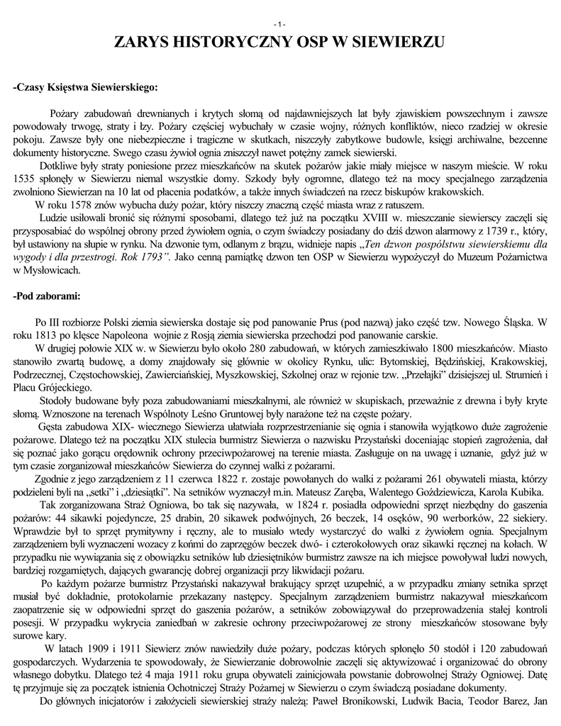 -1- ZARYS HISTORYCZNY OSP W SIEWIERZU -Czasy Księstwa Siewierskiego: Pożary zabudowań drewnianych i krytych słomą od najdawniejszych lat były zjawiskiem powszechnym i zawsze powodowały trwogę, straty i łzy. Pożary częściej wybuchały w czasie wojny, różnych konfliktów, nieco rzadziej w okresie pokoju. Zawsze były one niebezpieczne i tragiczne w skutkach, niszczyły zabytkowe budowle, księgi archiwalne, bezcenne dokumenty historyczne. Swego czasu żywioł ognia zniszczył nawet potężny zamek siewierski. Dotkliwe były straty poniesione przez mieszkańców na skutek pożarów jakie miały miejsce w naszym mieście. W roku 1535 spłonęły w Siewierzu niemal wszystkie domy. Szkody były ogromne, dlatego też na mocy specjalnego zarządzenia zwolniono Siewierzan na 10 lat od płacenia podatków, a także innych świadczeń na rzecz biskupów krakowskich. W roku 1578 znów wybucha duży pożar, który niszczy znaczną część miasta wraz z ratuszem. Ludzie usiłowali bronić się różnymi sposobami, dlatego też już na początku XVIII w. mieszczanie siewierscy zaczęli się przysposabiać do wspólnej obrony przed żywiołem ognia, o czym świadczy posiadany do dziś dzwon alarmowy z 1739 r., który, był ustawiony na słupie w rynku. Na dzwonie tym, odlanym z brązu, widnieje napis „Ten dzwon pospólstwu siewierskiemu dla wygody i dla przestrogi. Rok 1793”. Jako cenną pamiątkę dzwon ten OSP w Siewierzu wypożyczył do Muzeum Pożarnictwa w Mysłowicach. -Pod zaborami: Po III rozbiorze Polski ziemia siewierska dostaje się pod panowanie Prus (pod nazwą) jako część tzw. Nowego Śląska. W roku 1813 po klęsce Napoleona wojnie z Rosją ziemia siewierska przechodzi pod panowanie carskie. W drugiej połowie XIX w. w Siewierzu było około 280 zabudowań, w których zamieszkiwało 1800 mieszkańców. Miasto stanowiło zwartą budowę, a domy znajdowały się głównie w okolicy Rynku, ulic: Bytomskiej, Będzińskiej, Krakowskiej, Podrzecznej, Częstochowskiej, Zawierciańskiej, Myszkowskiej, Szkolnej oraz w rejonie tzw. „Przełajki” dzisiejszej ul. Strumień i Placu Grójeckiego. Stodoły budowane były poza zabudowaniami mieszkalnymi, ale również w skupiskach, przeważnie z drewna i były kryte słomą. Wznoszone na terenach Wspólnoty Leśno Gruntowej były narażone też na częste pożary. Gęsta zabudowa XIX- wiecznego Siewierza ułatwiała rozprzestrzenianie się ognia i stanowiła wyjątkowo duże zagrożenie pożarowe. Dlatego też na początku XIX stulecia burmistrz Siewierza o nazwisku Przystański doceniając stopień zagrożenia, dał się poznać jako gorącu orędownik ochrony przeciwpożarowej na terenie miasta. Zasługuje on na uwagę i uznanie, gdyż już w tym czasie zorganizował mieszkańców Siewierza do czynnej walki z pożarami. Zgodnie z jego zarządzeniem z 11 czerwca 1822 r. zostaje powołanych do walki z pożarami 261 obywateli miasta, którzy podzieleni byli na „setki” i „dziesiątki”. Na setników wyznaczył m.in. Mateusz Zaręba, Walentego Goździewicza, Karola Kubika. Tak zorganizowana Straż Ogniowa, bo tak się nazywała, w 1824 r. posiadła odpowiedni sprzęt niezbędny do gaszenia pożarów: 44 sikawki pojedyncze, 25 drabin, 20 sikawek podwójnych, 26 beczek, 14 osęków, 90 werborków, 22 siekiery. Wprawdzie był to sprzęt prymitywny i ręczny, ale to musiało wtedy wystarczyć do walki z żywiołem ognia. Specjalnym zarządzeniem byli wyznaczeni wozacy z końmi do zaprzęgów beczek dwó- i czterokołowych oraz sikawki ręcznej na kołach. W przypadku nie wywiązania się z obowiązku setników lub dziesiętników burmistrz zawsze na ich miejsce powoływał ludzi nowych, bardziej rozgarniętych, dających gwarancję dobrej organizacji przy likwidacji pożaru. Po każdym pożarze burmistrz Przystański nakazywał brakujący sprzęt uzupełnić, a w przypadku zmiany setnika sprzęt musiał być dokładnie, protokolarnie przekazany następcy. Specjalnym zarządzeniem burmistrz nakazywał mieszkańcom zaopatrzenie się w odpowiedni sprzęt do gaszenia pożarów, a setników zobowiązywał do przeprowadzenia stałej kontroli posesji. W przypadku wykrycia zaniedbań w zakresie ochrony przeciwpożarowej ze strony mieszkańców stosowane były surowe kary. W latach 1909 i 1911 Siewierz znów nawiedziły duże pożary, podczas których spłonęło 50 stodół i 120 zabudowań gospodarczych. Wydarzenia te spowodowały, że Siewierzanie dobrowolnie zaczęli się aktywizować i organizować do obrony własnego dobytku. Dlatego też 4 maja 1911 roku grupa obywateli zainicjowała powstanie dobrowolnej Straży Ogniowej. Datę tę przyjmuje się za początek istnienia Ochotniczej Straży Pożarnej w Siewierzu o czym świadczą posiadane dokumenty. Do głównych inicjatorów i założycieli siewierskiej straży należą: Paweł Bronikowski, Ludwik Bacia, Teodor Barez, Jan -2- Kolasiński, Edmund Korusiewicz, Hipolit Orłowski, Roman Piekarski, Tomasz Stefański, Wincenty Szulakowski, Eugeniusz Rusek i inni. Straż Ogniowa w tym okresie liczyła w Siewierzu 25 członków czynnych i 30 wspierających. Należała ona do pożarniczego stowarzyszenia – Związku Floriańskiego, który po połączeniu ze związkami strażackimi z Galicji i Wielkopolski przybrał nazwę Związek Ochotniczych Straży Pożarnych RP., na czele którego stanął jako pierwszy prezes Bolesław Chomicz. W 1911 roku na wyposażeniu siewierskiej straży ogniowej znajdowały się następujące sprzęty: 1 sikawka ręczna, 2 żelazne beczki na kołach, 4 drabiny, kilka łopat, wiader i osęków. Pierwszą murowaną strażnicę – remizę – przekazano straży ogniowej w 1912 r. Nie była ona zbyt duża, ale pomieściła niezbędny sprzęt gaśniczy. Należy podkreślić, że nie przestrzeni dziejów strażacy siewierscy aktywnie uczestniczyli nie tylko w zwalczaniu pożarów i innych zagrożeń oraz klęsk żywiołowych, ale także aktywnie brali udział w walc