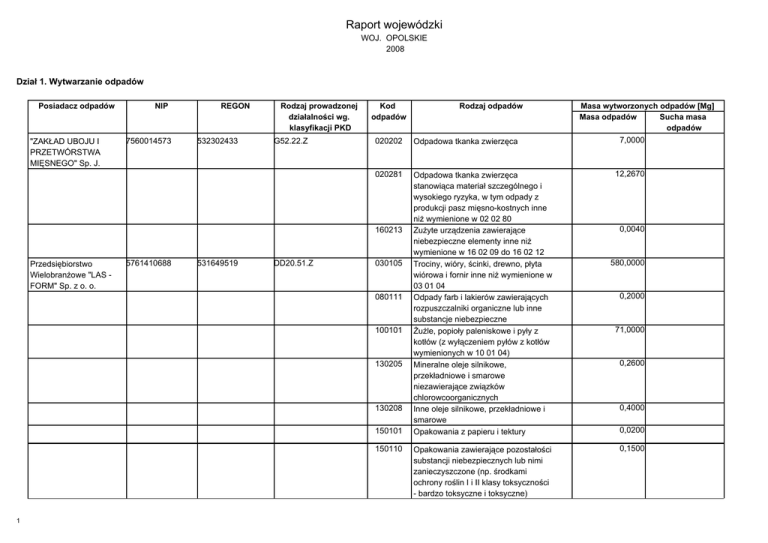 Raport wojewódzki WOJ. OPOLSKIE 2008 Dział 1. Wytwarzanie odpadów Posiadacz odpadów "ZAKŁAD UBOJU I PRZETWÓRSTWA MIĘSNEGO" Sp. J. NIP 7560014573 REGON 532302433 Rodzaj prowadzonej działalności wg. klasyfikacji PKD G52.22.Z Kod odpadów 020202 Odpadowa tkanka zwierzęca 020281 Odpadowa tkanka zwierzęca stanowiąca materiał szczególnego i wysokiego ryzyka, w tym odpady z produkcji pasz mięsno-kostnych inne niż wymienione w 02 02 80 Zużyte urządzenia zawierające niebezpieczne elementy inne niż wymienione w 16 02 09 do 16 02 12 Trociny, wióry, ścinki, drewno, płyta wiórowa i fornir inne niż wymienione w 03 01 04 Odpady farb i lakierów zawierających rozpuszczalniki organiczne lub inne substancje niebezpieczne Żużle, popioły paleniskowe i pyły z kotłów (z wyłączeniem pyłów z kotłów wymienionych w 10 01 04) Mineralne oleje silnikowe, przekładniowe i smarowe niezawierające związków chlorowcoorganicznych Inne oleje silnikowe, przekładniowe i smarowe Opakowania z papieru i tektury 160213 Przedsiębiorstwo Wielobranżowe "LAS FORM" Sp. z o. o. 5761410688 531649519 DD20.51.Z 030105 080111 100101 130205 130208 150101 150110 1 Rodzaj odpadów Opakowania zawierające pozostałości substancji niebezpiecznych lub nimi zanieczyszczone (np. środkami ochrony roślin I i II klasy toksyczności - bardzo toksyczne i toksyczne) Masa wytworzonych odpadów [Mg] Masa odpadów Sucha masa odpadów 7,0000 12,2670 0,0040 580,0000 0,2000 71,0000 0,2600 0,4000 0,0200 0,1500 Sorbenty, materiały filtracyjne, tkaniny do wycierania (np. szmaty, ścierki) i ubrania ochronne inne niż wymienione w 15 02 02 Zużyte opony 0,0120 0,0080 170405 Zużyte urządzenia inne niż wymienione w 16 02 09 do 16 02 13 Żelazo i stal 150101 Opakowania z papieru i tektury 6,1000 150102 Opakowania z tworzyw sztucznych 1,9000 160213 0,0650 150101 Zużyte urządzenia zawierające niebezpieczne elementy inne niż wymienione w 16 02 09 do 16 02 12 Surowce i produkty nienadające się do spożycia i przetwórstwa Opakowania z papieru i tektury 150102 Opakowania z tworzyw sztucznych 160380 101382 Produkty spożywcze przeterminowane lub nieprzydatne do spożycia Odpady farb drukarskich inne niż wymienione w 08 03 12 Wybrakowane wyroby 150101 Opakowania z papieru i tektury 0,0300 150102 Opakowania z tworzyw sztucznych 0,0150 150203 Sorbenty, materiały filtracyjne, tkaniny do wycierania (np. szmaty, ścierki) i ubrania ochronne inne niż wymienione w 15 02 02 Zużyte urządzenia zawierające niebezpieczne elementy inne niż wymienione w 16 02 09 do 16 02 12 Zużyte urządzenia inne niż wymienione w 16 02 09 do 16 02 13 Magnetyczne i optyczne nośniki informacji 0,0050 150203 160103 160214 "SUPER SAM" - Anna Nienartowicz, Renata Przyklenk Sp. J. "BILLA" Sp. z o. o. "DYCKERHOFF POLSKA" Sp. z o. o. 7540068548 7781022157 6570081493 530570282 630351559 290622478 G52.11.Z G52.11.Z DI26.51.Z 020203 080313 160213 160214 168001 2 0,0600 0,2000 3,5700 38,4900 3,9500 17,8900 0,0030 460,0000 0,0020 0,0460 0,0010 0,1950 150102 Inne odpady, które zawierają żywe drobnoustroje chorobotwórcze lub ich toksyny oraz inne formy zdolne do przeniesienia materiału genetycznego, o których wiadomo lub co do których istnieją wiarygodne podstawy do sądzenia, że wywołują choroby u ludzi i zwi Zużyte materiały szlifierskie inne niż wymienione w 12 01 20 Mineralne oleje i ciecze stosowane jako elektroizolatory oraz nośniki ciepła niezawierające związków chlorowcoorganicznych Szlamy z odwadniania olejów w separatorach Opakowania z tworzyw sztucznych 150104 Opakowania z metali 0,0100 150202 0,0710 170203 Sorbenty, materiały filtracyjne (w tym filtry olejowe nieujęte w innych grupach), tkaniny do wycierania (np. szmaty, ścierki) i ubrania ochronne zanieczyszczone substancjami niebezpiecznymi (np. PCB) Zużyte urządzenia zawierające niebezpieczne elementy inne niż wymienione w 16 02 09 do 16 02 12 Elementy usunięte ze zużytych urządzeń inne niż wymienione w 16 02 15 Tworzywa sztuczne 170303 Smoła i produkty smołowe 0,3100 170402 Aluminium 0,1150 170405 Żelazo i stal 7,1400 170407 Mieszaniny metali 7,0880 170409 Odpady metali zanieczyszczone substancjami niebezpiecznymi Kable inne niż wymienione w 17 04 10 5,5440 Niepubliczny ZOZ "MED - VITA" Sp. C. Małgorzata Holer, Dorota Kęcka, Dorota Szubelak, Wiesława Tuczyńska 7471567247 531500906 N85.12.Z 180103 "INDAVER POLSKA" Sp. z o. o. 7540339556 530575960 O90.02.Z 120121 130307 130502 160213 160216 170411 3 0,0130 0,4570 3,0000 0,0100 0,0518 1,6570 0,4380 0,0500 2,7790 200101 Inne materiały izolacyjne zawierające substancje niebezpieczne Materiały izolacyjne inne niż wymienione w 17 06 01 i 17 06 03 Papier i tektura 070213 Odpady tworzyw sztucznych 6,6600 080317 Odpadowy toner drukarski zawierający substancje niebezpieczne Żużle, popioły paleniskowe i pyły z kotłów (z wyłączeniem pyłów z kotłów wymienionych w 10 01 04) Kwasy trawiące 0,0030 170603 170604 P.P.U.H. "LEMET" Leon Pleśniak 7480001350 530533068 DJ28.22.Z 100101 110105 45,0000 120102 150102 Opakowania z tworzyw sztucznych 0,2200 150110 Opakowania zawierające pozostałości substancji niebezpiecznych lub nimi zanieczyszczone (np. środkami ochrony roślin I i II klasy toksyczności - bardzo toksyczne i toksyczne) Sorbenty, materiały filtracyjne (w tym filtry olejowe nieujęte w innych grupach), tkaniny do wycierania (np. szmaty, ścierki) i ubrania ochronne zanieczyszczone substancjami niebezpiecznymi (np. PCB) Zużyte urządzenia zawierające niebezpieczne elementy inne niż wymienione w 16 02 09 do 16 02 12 Mineralne oleje silnikowe, przekładniowe i smarowe niezawierające związków chlorowcoorganicznych 0,0100 120101 150202 160213 4 G50.20.A 19,3180 Wody popłuczne zawierające substancje niebezpieczne Odpady z toczenia i piłowania żelaza oraz jego stopów Cząstki i pyły żelaza oraz jego stopów 110111 530949768 2,0000 17,3330 110107 7541844463 0,0180 Odpady zawiera
