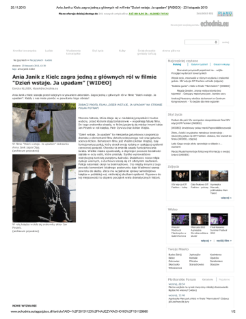 25.11.2013 Ania Janik z Kielc zagra jedną z głównych ról w filmie "Dzień wstaje. Ja upadam” [WIDEO] - 23 listopada 2013 ZALOGUJ SIĘ Piano oferuje dzisiaj dostęp do 241 nowych artykułów. JUŻ OD 9,90 ZŁ - KLIKNIJ TUTAJ Serwis jest częścią portalu szukaj Kronika towarzyska Ludzie Wydarzenia towarzyskie Styl życia Kulisy Świętokrzyskie gwiazdy tańczą strona główna Na językach » Na językach - Ludzie Najczęściej czytane Dzisiaj dodano: 23 listopada 2013, 12:30 tagi: anna janik k ielce Ania Janik z Kielc zagra jedną z głównych ról w filmie "Dzień wstaje. Ja upadam” [WIDEO] Dorota KLUSEK, [email protected] Ania Janik z Kielc stanęła przed kolejnym wyzwaniem aktorskim. Zagra jedną z głównych ról w filmie "Dzień wstaje. Ja upadam”. Każdy z nas może pomóc w powstaniu tego obrazu! Ostatni tydzień Ostatni miesiąc Staruszek przyszedł popatrzeć na… wójta. Przegląd wydarzeń towarzyskich Włoski szyk, moonwalk w różnym wydaniu i znakomici goście. XIV edycja Off Fashion od kulis (zdjęcia) "Kobieta guma" z Kielc w finale "Mam talent”! [WIDEO] Magdą Gessler, znaną restauratorka bez tajemnic: - Gotujący mężczyzna jest…bardzo sexy Andrzej Piaseczny wkrótce da koncert w Centrum Kongresowym: - To będzie dla mnie egzamin ZOBACZ PROFIL FILMU „DZIEŃ WSTAJE, JA UPADAM” NA STRONIE POLAK POTRAFI Styl życia Mroczna historia, która dzieje się w niedalekiej przyszłości i trudne wybory, przed którymi stają bohaterowie – wypełniają fabułę filmu. Do tego znakomita obsada, w której pojawią się miedzy innymi także Jan Peszek w roli księdza, Piotr Cyrwus oraz Adrian Wajda. W filmie "Dzień wstaje. Ja upadam” kielczanka Anna Janik zagra Olgę. (archiwum prywatne) "Dzień wstaje. Ja upadam” to mieszanka gatunkowa z pogranicza dramatu z elementami filmu detektywistycznego noir oraz gatunku science-fiction. Bohaterem filmu jest Wadim (Adrian Wajda), były funkcjonariusz policji, który stracił swoją rodzinę w szalejącej epidemii czerwonej gorączki. Choroba ta zmieniła zasady funkcjonowania świata. Wielkie miasta opustoszały, a depresja i poczucie bezsilności zajrzały w oczy osób, które przeżyły. Szybko wprowadzono restrykcyjną kontrolę przepływu ludności. Dodatkowo nowa religia zyskuje wiernych, a duchowni cieszą się ich olbrzymim zaufaniem. Policja natomiast cierpi na braki kadrowe. I to między innymi z tego powodu komendant lokalnego posterunku daje Wadimowi szansę powrotu do służby. Zleca mu wyjaśnienie sprawy samobójstwa księdza w pobliskiej wsi, nietkniętej skutkami epidemii. Wyprawa do tej miejscowości to dopiero początek wielu dramatycznych historii. Podium dla pań! Za nami pełen niespodzianek finał XIV edycji Off Fashion [WIDEO] [WIDEO] Urodzinowy pokaz marki Paprocki&Brzozowski Złoto, ćwieki i oryginalne metalowe konstrukcje niezwykły pokaz na Off Fashion. Zobacz, kto wszedł do finału (WIDEO, zdjęcia) Lady Gaga swoje płyty sprzedaje w sklepie z... ciuchami Maciej Musiał komentuje fałszywą informację o swojej śmierci [WIDEO] Zdjęcia XIV edy cja Off Fashion - k ulisy Gala finałowa Off A gnieszk a Fashion - pok azy Marczak , półfinalistk a Mam Talent więcej » Wideo W rolę księdza wciela się znakomity aktor Jan Peszek. (archiwum prywatne) Wieczór Modny ch Filantropów w Galerii Korona Miss Lata 2012 A gnieszk a Sk robisz odbiera sk uter Finał Karaok e Summer Festiv al 2012 więcej » | wyślij film » Twoje Miasto Busko-Zdrój Kielce Ostrowiec Skarżysko Włoszczowa Jędrzejów Końskie Pińczów Starachowice Plotkarskie Forum Kazimierza Opatów Sandomierz Staszów Ostatnie Popularne wczoraj, 20:54 Mocne wejście na rynek muzyczny młodej staszowianki. Będzie hit wiosny? (video) wczoraj, 11:46 Agnieszka Marczak z Kielc w finale "Mam talent"! Zobacz jak zachwyciła jury NOWE WYZWANIE www.echodnia.eu/apps/pbcs.dll/article?AID=%2F20131123%2FNAJEZYKACH0103%2F131129680 1/2 25.11.2013 Ania Janik z Kielc zagra jedną z głównych ról w filmie "Dzień wstaje. Ja upadam” [WIDEO] - 23 listopada 2013 Ania Janik, którą ostatnio mogliśmy zobaczyć między innymi w filmie "Pre Mortem” Konrada Łęckiego czy w serialu "Komisarz Alex” tym, razem wcieli się w bohaterkę o imieniu Olga. - To młoda dziewczyna. Jest częścią zamkniętej społeczności Chraszczewa, wsi położonej nieopodal Kijowa. Wiedzie spokojne i szczęśliwe życie. Jednak w przeciwieństwie do reszty mieszkańców nie jest ślepo zapatrzona w nowopowstałą, ogólnoświatową religię – tak o swojej postaci mówi Ania. – W wyniku dramatycznych wydarzeń we wsi, Olga jest zmuszona przeistoczyć się z grzecznej, cichej dziewczyny w kobietę walczącą o pamięć i cześć swoich najbliższych. Kielczanka jest aktorką, ale w tym filmie jest także drugim kierownikiem produkcji. - Moje obowiązki, które wchodziły w skład kompetencji drugiego kierownika produkcji koncentrowały się na działaniach poza planem zdjęciowym. Należało do nich miedzy innymi pozyskiwanie środków na realizację planu zdjęciowego, organizację kostiumów dla aktorów, promocję naszego projektu w mediach – wyjaśnia Janik. wczoraj, 10:52 Agnieszka Marczak z Kielc w półfinale "Mam Talent"! Oglądaj w sobotę na żywo [WIDEO, zdjęcia] wczoraj, 07:58 Kielecki radny zwiedzał Maroko 22 listopada, 08:21 Grzegorz Banaś poszedł na…grzyby 21 listopada, 18:31 Znani mieszkańcy regionu powiedzieli nam, co skrywają ich szafy więcej » Sonda Zobacz zwiastun filmu: Czy jesteś za wprowadzeniem obowiązku zmiany opon na zimowe? tak nie Głosuj » Zobacz wyniki » Strefa Imprez Jędrzejowski chór zaprasza na warsztaty Jędrzejów, 25 Listopada 2013 (Poniedziałek), g. 17:00 XIX Festiwal Form Dokumentalnych Nurt 2013 Kielce, 26 Listopada 2013 (Wtorek), g. 9:00 Andrzejki 2013 w Pińczowie Pińczów, 26 Listopada 2013 (Wtorek), g. 16:00 Andrzejki 2013 w powiecie jędrzejowskim Jędrzejów, 26 Listopada 2013 (Wtorek), g. 17:00 M
