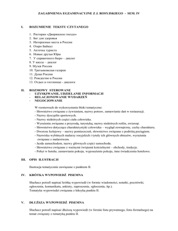 ZAGADNIENIA EGZAMINACYJNE Z J. ROSYJSKIEGO - SEM. IV I. ROZUMIENIE TEKSTU CZYTANEGO 1. Ресторан «Дворянское гнездо» 2. Бег для здоровья 3. Интересные места в России 4. Озеро Байкал 5. Аптечка туриста 6. Новые друзья Юры 7. У справочного бюро – диалог 8. У кассы – диалог 9. Музея России 10. Третьяковсеая галерея 11. Душа России 12. Рождество в России 13. Отдых в гостинице - диaлоги II. ROZMOWY STEROWANE - UZYSKIWANIE, UDZIELANIE INFORMACJI - RELACJONOWANIE WYDARZEŃ - NEGOCJOWANIE W rozmowach do wykorzystania bloki tematyczne: - Słownictwo związane z żywieniem, nazwy potraw, zamawianie dań w restauracji. - Nazwy dyscyplin sportowych. - Nazwy niektórych części ciała człowieka. - Wyrażenia związane z przyrodą, turystyką; nazwy niektórych roślin, zwierząt. - Słownictwo dotyczące charakterystyki człowieka – wygląd zewnętrzny, cechy charakteru. - Dworzec kolejowy – nazwy pomieszczeń, słownictwo związane z podróżą pociągiem. - Nazwiska wybitnych malarzy rosyjskich i tytuły ich głównych obrazów, wyrażenia związane z malarstwem. - Jazda samochodem, nazwy głównych części samochodu. - Słownictwo związane z ważnymi świętami kościelnymi – obchody, tradycje. - Pobyt w hotelu; zamawianie pokoju, wyposażenie pokoju, inne świadczenia hotelowe. III. OPIS ILUSTRACJI Ilustracja tematycznie zawiązane z punktem II. IV. KRÓTKA WYPOWIEDŹ PISEMNA Słuchacz potrafi napisać krótką wypowiedź (w formie wiadomości, notatki, pocztówki, ogłoszenia, komunikatu, ankiety, zaproszenia, zgłoszenia, itp.). Tematyka wypowiedzi związana z leksyką punktu II. V. DŁUŻSZA WYPOWIEDŹ PISEMNA Słuchacz potrafi napisać dłuższą wypowiedź (w formie listu prywatnego, listu formalnego) na temat związany z tematyką punktu II.