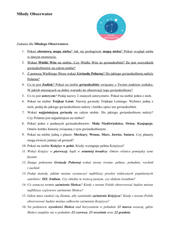 Młody Obserwator Zadania dla Młodego Obserwatora: 1. Pokaż obrotową mapę nieba? Jak się posługiwać mapą nieba? Pokaż wygląd nieba w danym momencie. 2. Wskaż Wielki Wóz na niebie. Czy Wielki Wóz to gwiazdozbiór? Ile jest wszystkich gwiazdozbiorów na całym niebie? 3. Z pomocą Wielkiego Wozu wskaż Gwiazdę Polarną? Do jakiego gwiazdozbioru należy Polarna? 4. Co to jest Zodiak? Pokaż na niebie gwiazdozbiór związany z Twoim znakiem zodiaku. W jakich miesiącach są dobre warunki do obserwacji tego gwiazdozbioru? 5. Co to jest asteryzm? Podaj nazwy 2 znanych asteryzmów. Pokaż na niebie jeden z nich. 6. Pokaż na niebie Trójkąt Letni. Nazwij gwiazdy Trójkąta Letniego. Wybierz jedną z nich, podaj do jakiego gwiazdozbioru należy i krótko opisz ten gwiazdozbiór. 7. Wskaż najjaśniejszą gwiazdę na całym niebie. Do jakiego gwiazdozbioru należy? Czy Polarna jest najjaśniejsza na niebie? 8. Pokaż jeden z podanych gwiazdozbiorów: Mała Niedźwiedzica, Orion, Kasjopeja. Omów krótko historię związaną z tym gwiazdozbiorem. 9. Pokaż na niebie jedną z planet: Merkury, Wenus, Mars, Jowisz, Saturn. Czy planety mogą świecić jaśniej od gwiazd? 10. Pokaż na niebie Księżyc w pełni. Kiedy występuje pełnia Księżyca? 11. Wskaż Księżyc w pierwszej, bądź w ostatniej kwadrze. Omów różnice pomiędzy tymi fazami. 12. Znając położenie Gwiazdy Polarnej wskaż strony świata: północ, południe, wschód i zachód. 13. Podaj metody, jakimi można wyznaczyć najbliższy przelot widocznych popularnych satelitów: ISS, Iridium. Czy obiekty te świecą jasnym, czy słabym światłem? 14. Co oznacza termin zaćmienie Słońca? Kiedy z terenu Polski obserwować będzie można najbliższe częściowe zaćmienie Słońca? 15. Gdzie musi znaleźć się Ziemia, aby zaistniało zaćmienie Księżyca? Kiedy z terenu Polski obserwować będzie można całkowite zaćmienie Księżyca? 16. Na podstawie wysokości Słońca nad horyzontem w południe 21 marca oszacuj, gdzie Słońce znajdzie się w południe 22 czerwca, 23 września oraz 22 grudnia.