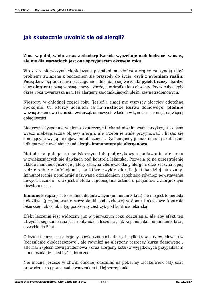 City Clinic, ul. Popularna 62A, 02-473 Warszawa 1 Jak skutecznie uwolnić się od alergii? Zima w pełni, wielu z nas z niecierpliwością wyczekuje nadchodzącej wiosny, ale nie dla wszystkich jest ona sprzyjającym okresem roku. Wraz z z pierwszymi cieplejszymi promieniami słońca alergicy zaczynają mieć problemy związane z budzeniem się przyrody do życia, czyli z pyleniem roślin. Początkowo są to drzewa (szczególnie silnie daje się we znaki pyłek brzozy– bardzo silny alergen) późną wiosną- trawy i zboża, a w środku lata chwasty. Przez cały ciepły okres roku towarzyszą nam też alergeny zarodnikujących pleśni zewnątrzdomowych. Niestety, w chłodnej części roku (jesień i zima) nie wszyscy alergicy odetchną spokojnie. Ci, którzy uczuleni są na roztocze kurzu domowego, pleśnie wewnątrzdomowe i sierści zwierząt domowych właśnie w tym okresie mają najwięcej dolegliwości. Medycyna dysponuje wieloma skutecznymi lekami niwelującymi przykre, a czasem wręcz niebezpieczne objawy alergii, ale trzeba je stale przyjmować , licząc się z mogącymi wystąpić objawami ubocznymi. Dysponujemy jednak metodą skutecznie i długotrwale uwalniającą od alergii- immunoterapią alergenową. Metoda ta polega na podskórnym lub podjęzykowym podawaniu alergenu w zwiększających się dawkach pod kontrolą lekarską. Pozwala to na przestrojenie układu immunologicznego , który zaczyna tolerować dany alergen, oraz zaczyna lepiej radzić sobie z infekcjami , na które zwykle alergik jest bardziej narażony. Immunoterapia popularnie nazywana odczulaniem zapobiega również powstawaniu nowych uczuleń , oraz jest metoda zapobiegania astmie u pacjentów z alergicznym nieżytem nosa. Immunoterapia jest leczeniem długotrwałym (minimum 3 lata) ale nie jest to metoda uciążliwa (przyjmowanie szczepionki podjęzykowej w domu i okresowe kontrole lekarskie, lub co ok 5 tyg podskórny zastrzyk pod kontrola lekarską) Efekt leczenia jest widoczny już w pierwszym roku odczulania, ale aby efekt ten utrzymał się, konieczna jest kontynuacja leczenia , jak wspomniałam minimum 3 lata , a zwykle do 5 lat. Odczulać można na alergeny powietrznopochodne jak pyłki traw, drzew, chwastów (odczulanie okołosezonowe), ale również na alergeny roztoczy kurzu domowego , alternarii (pleśń zewnątrzdomowa ) oraz alergeny kota (w wyjątkowych przypadkach) – tu odczulanie musi być całoroczne. Nie można jeszcze w chwili obecnej odczulać na pokarmy ,aczkolwiek cały czas prowadzone są prace nad stworzeniem takiej szczepionki. Wszystkie prawa zastrzeżone. City Clinic Sp. z o.o. -1/2- 01.03.2017 City Clinic, ul. Popularna 62A, 02-473 Warszawa 2 Aby rozpocząć immunoterapię konieczna jest staranna kwalifikacja pacjenta do tej metody. Ewentualne niepowodzenia leczenia związane są zwykle z błędną kwalifikacją lub nieprawidłowym prowadzeniem leczenia. Odpowiednie badania (w tym testy, spirometria i inn.) wykonujemy w okresie wolnym od objawów choroby, a więc dla uczulonych na pyłki zima jest najlepszym okresem do takiej kwalifikacji. Rozpocząć odczulanie również należy odpowiednio wcześnie przed spodziewanym pyleniem roślin. Trzeba więc odpowiednio wcześnie pomyśleć o nadchodzącej wiośnie abyśmy mogli cieszyć się jej urokami bez niepotrzebnych cierpień związanych z alergią Zapraszamy do umawiania wizyt u naszych lekarzy alergologów ——————————— Zamieszczone teksty stanowią własność intelektualną autorów, tym samym nie mogą być wykorzystywane w całości lub w części bez zgody autorów. Wszystkie prawa zastrzeżone. City Clinic Sp. z o.o. -2/2- 01.03.2017