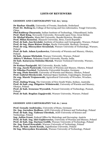 LISTS OF REVIEWERS GEODESY AND CARTOGRAPHY Vol. 62 / 2013 Dr Bashar Alsadik, University of Twente, Enschede, Nederland Prof. Dr. Bofeng Li, College of Surveying and Geo-informatics, Tongji University, China Phd Kuldeep Chuarasia, Indian Institute of Technology, Utharakhand, India Prof. Matt King, Newcastle University, Newcastle upon Tyne, Great Britan Dr Michal Klaučo, Matej Bel University, Banská Bystrica, Slovakia Prof. Milan Konečný, Masaryk University, Brno, Czech Republic Prof. dr hab. Jan Kryński, Institute of Geodesy and Cartography, Warsaw, Poland Prof. dr ing. Hans Rainer Kulpe, Ruchr Universität, Bochum, Germany Prof. dr eng. Mieczysław Kwaśniak, Warsaw University of Technology, Warsaw, Poland Prof. dr hab. Adam Łyszkowicz, University of Warmia and Mazury, Olsztyn, Poland Dr hab. Janusz Michalak, Warsaw University, Warsaw, Poland Athira V Mohan, Mahatma Gandi University, Kerala, India Dr hab. Katarzyna Osińska-Skotak, Warsaw Technical University, Warsaw, Polan Dr Kottan Panigrahi, MG University, Kerala, India Dr eng. Jacek Paziewski, University of Warmia and Mazury, Olsztyn, Poland Dr Nikolas Prechtel, Technische Universität Dresden, Germany Dr eng. Piotr Sawicki, University of Warmia and Mazury, Olsztyn, Poland Prof. Gabriel Strykowski, National Space Institute, Copenhagen, Denmark Dr eng. Marek Trojanowski, Agricultural University of Wrocław, Wrocław, Poland Prof. Jinling Wang, The University of New South Wales, Sydney, Australia Prof. dr hab. eng. Zbigniew Wiśniewski, University of Warmia and Mazury, Olsztyn, Poland Prof. dr hab. Ireneusz Wyczałek, Poznań University of Technology, Poznań, Poland Prof. dr hab. Bogdan Zagajewski, Warsaw University, Warsaw, Poland GEODESY AND CARTOGRAPHY Vol. 61 / 2012 Prof. Genady Andrienko, University of Bonn, Germany Dr. Ing. Jarosław Bydłosz, AGH-University of Science and Technology, Poland Prof. dr hab. Ing. Tadeusz Chrobak, AGH-University of Science and Technology, Poland Ing. Julius Ernst, Federal Office for Metrology and Surveying. Austria Prof. dr hab. Ing. Idzi Gajderowicz, University of Warmia and Mazury, Poland Prof. dr hab. Ing. Dariusz Gotlib, Warsaw University of Technology, Poland Dr. Ing. Paweł Kowalski, Warsaw University of Technology, Poland Prof., dr hab. Jacek Kozak, Jagiellonian University, Poland Dr Ing. Mieczysław Kwaśniak, Warsaw University of Technology, Poland Prof. Dr. Ing. Wolfgang Reinhardt, Universität der Bundeswehr München, Germany Dr. Jukka Krisp, Technische Universität München, Germany Dr. Huseyin Baki IZ, The Hong Kong Polytechnic University Hung Hom, Hong Kong Prof. Dr. Ing. Liqiu Meng, Technische Universität München, Germany Prof. Katarzyna Sobolewska-Mikulska, Warsaw University of Technology, Poland Prof. Vaclav Talhofer, Masaryk University, Czech Republic Prof. Dr. Drazen Tutic, University of Zagreb, Croatia Prof. dr hab. Piotr Werner, Warsaw University, Poland Prof. dr hab. Ing. Zbigniew Wiśniewski, University of Warmia and Mazury, Poland GEODESY AND CARTOGRAPHY Vol. 60 / 2011 Dr Huseyin Baki IZ, Hong Kong Polytechnic University Hung Hom, Kowloon, Hong Kong Prof. Piotr Banasik, AGH-University of Science and Technology, Poland Ph.D. Sergio Baselga, Universidad Politécnica de Valencia, Spain Prof. Jaroslaw Bosy, Uniwersytet Przyrodniczy we Wrocławiu, Poland Dr Sagi Dalyot, Leibniz Universität Hannover, Germany Dr Gilad Even-Tzur, Engineering, Technion, Haifa, Israel Prof. Will Featherstone, Curtin University, Perth, Australia Prof. Roman Galas, Technische Universität Berlin, Germany Dr Mieczysław Kwaśniak, Warsaw Technical University, Poland Dr Siegfried Meier, Technische Universität Dresden, Germany Prof. Janusz Narkiewicz, Warsaw Technical University, Poland Prof. Edward Osada, Wrocław University of Technology, Poland Prof. Witold Prószyński, Warsaw Technical University, Poland Porf. Jerzy B. Rogowski, Warsaw Technical University, Poland Prof. Monika Sester, Leibniz Universität Hannover, Germany Prof. František Vejražka, University in Prague, Czech Republic Prof. Peter Vörsmann, Institute of Aerospace Systems, Braunschweig, Germany Prof. Adam Weintrit, Gdynia Maritime University, Poland Prof. Paweł Wielgosz, University of Warmia and Mazury, Poland Prof. Zbigniew Wiśniewski, University of Warmia and Mazury, Poland Prof. Peiliang Xu, Kyoto University, Japan GEODESY AND CARTOGRAPHY Vol. 59 / 2010 Prof. Andrzej Borkowski, Agricultural University of Wrocław, Poland Dr Jan Cisak, Institute of Geodesy and Cartograhy, Warszawa, Poland Prof. Reinhard Dietrich, Technische Universität Dresden, Germany Prof. Bernd Eissfeller, Universität der Bundeswehr München, Germany Prof. Gilad Even-Tzur, Engineering, Technion, Haifa, Israel Prof. Roman Galas, Technische Universität Berlin, Germany Msc Lars Harrie, Lund University, Sweden Prof. Jacek Januszewski, Gdynia Maritime University, Poland Prof. Boris Jutzi, University of Karlsruhe, Germany Doc. Pavel Kovář, Czech Technical University in Prague, Czech Republik Prof. Jan Kryński, Institute of Geodesy and Cartograhy, Warszawa, Poland Dipl. Math. Felix Kneissl, Universität der Bundeswehr München, Germany Prof. Liqiu Meng, Technische Universität München, Germany Prof. Edward Osada, Wrocław Technical University, Poland Prof. Witold Prószyński, Warsaw Technical University, Poland Prof. Jerzy B. Rogowski, Warsaw Technical University, Poland Prof. Cezary Specht, Akademia Marynarki Wojennej w Gdyni, Poland Prof. Robert Weibel, University of Zurich, Switzerland Prof. Zbigniew Wiśniewski, University of Warmia and Mazury, Poland Prof. Leonard Ziemiański, Rzeszow University of Technology, Poland
