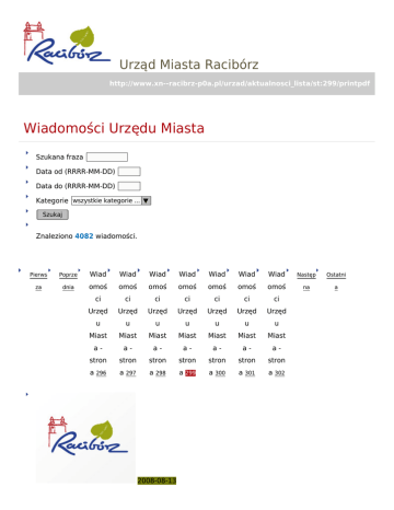 Urząd Miasta Racibórz http://www.xn--racibrz-p0a.pl/urzad/aktualnosci_lista/st:299/printpdf Wiadomości Urzędu Miasta Szukana fraza Data od (RRRR-MM-DD) Data do (RRRR-MM-DD) Kategorie wszystkie kategorie ... ▼ Szukaj Znaleziono 4082 wiadomości. Pierws Poprze Wiad Wiad Wiad Wiad Wiad Wiad Wiad Następ Ostatni za dnia omoś omoś omoś omoś omoś omoś omoś na a ci ci ci ci ci ci ci Urzęd Urzęd Urzęd Urzęd Urzęd Urzęd Urzęd u u u u u u u Miast Miast Miast Miast Miast Miast Miast a- a- a- a- a- a- a- stron stron stron stron stron stron stron a 296 a 297 a 298 a 299 a 300 a 301 a 302 2008-08-13 X Rodzinny Rajd Rowerowo-Rekreacyjny kategoria: Wiadomości i wydarzenia 24 sierpnia odbędzie się X edycja Rodzinnego Rajdu Rowerowego. Zapraszamy wszystkie rodziny do udziału! Start: ul. Nowa godz. 12:00. Atrakcyjne nagrody dla najlepszych 16 rodzin 2008-08-11 Festyn w Studziennej na zakończenie rajdu rowerowego kategoria: Wiadomości i wydarzenia Stowarzyszenie Przyjaciół Człowieka "TĘCZA" 15 sierpnia zaprasza na uroczyste zakończenie "X Jubileuszowego Raciborskiego Rajdu Rowerowego Środowisk Trzeźwościowych Dookoła Polski". 2008-08-08 Remont ronda na Placu Mostowym kategoria: Wiadomości i wydarzenia 11 sierpnia (poniedziałek) rozpoczną się roboty remontowe ronda na Placu Mostowym oraz ul. Reymonta. Wprowadzana zostanie czasowa zmiana organizacji ruchu drogowego. 2008-08-08 Spotkanie prezydenta z mieszkańcami kategoria: Wiadomości i wydarzenia Prezydent zaprasza właścicieli nieruchomości leżących przy ulicy Kołłątaja na spotkanie w sprawie omówienia podłączeń do sieci kanalizacji sanitarnej 2008-08-05 Hala sportowa doczekała się remontu kategoria: Wiadomości i wydarzenia Kompleksowy remont hali sportowej OSiR na zlecenie Miasta przeprowadzi Przedsiębiorstwo Usługowe BORBUD sp. z o.o. Remont potrwa prawie dwa lata. Zakres inwestycji obejmie prace budowlane wewnątrz hali jak i na zewnątrz. 2008-08-05 Herbem wita Racibórz kategoria: Wiadomości i wydarzenia Z końcem sierpnia na drogach wjazdowych do miasta pojawią się w pełnej krasie nowe herby – witacze. Trzy z nich przy ulicach Głubczyckiej, Hulczyńskiej i Kwiatowej zostały już wyremontowane. 2008-07-31 IV edycja Polsko-Niemieckiej Akademii Dziennikarskiej kategoria: Wiadomości i wydarzenia Akademia to sześciodniowe warsztaty i seminaria skierowane do studentek i studentów dziennikarstwa oraz kierunków pokrewnych, a także wszystkich tych, których interesuje magia świata mediów. 2008-07-29 Obchody 64. rocznicy wybuchu Powstania Warszawskiego kategoria: Wiadomości i wydarzenia Muzeum Powstania Warszawskiego oraz Instytut Pamięci Narodowej inicjują akcję na rzecz nadania obchodom 64. rocznicy wybuchu Powstania Warszawskiego charakteru ogólnopolskiego. 2008-07-29 kategoria: Marszałek z wizytą w Raciborzu Wiadomości i wydarzenia Marszałek Bogusław Śmigielski spotkał się z przedstawicielami samorządów Powiatu Raciborskiego. Inicjatorami rozmów byli prezydent Raciborza Mirosław Lenk oraz starosta powiatu Adam Hajduk. 2008-07-25 kategoria: Język obcy obowiązkowy od pierwszej klasy Wiadomości i wydarzenia Od 1 września tego roku nauka języka obcego będzie obowiązkowa od pierwszej klasy szkoły podstawowej, a od 1 września 2009 r. obowiązkowa będzie nauka drugiego języka obcego od pierwszej klasy gimnazjum. Pierws Poprze Wiad Wiad Wiad Wiad Wiad Wiad Wiad Następ Ostatni za dnia omoś omoś omoś omoś omoś omoś omoś na a ci ci ci ci ci ci ci Urzęd Urzęd Urzęd Urzęd Urzęd Urzęd Urzęd u u u u u u u Miast Miast Miast Miast Miast Miast Miast a- a- a- a- a- a- a- stron stron stron stron stron stron stron a 296 a 297 a 298 a 299 a 300 a 301 a 302