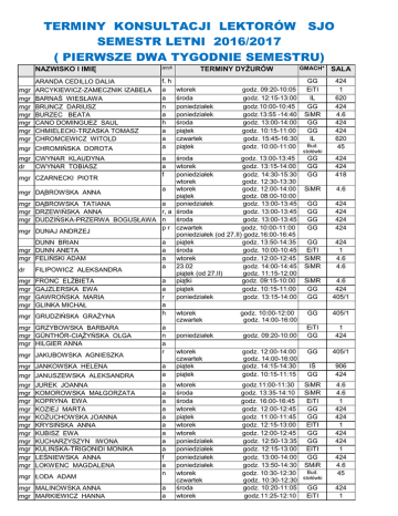 TERMINY KONSULTACJI LEKTORÓW SJO SEMESTR LETNI 2016/2017 ( PIERWSZE DWA TYGODNIE SEMESTRU) mgr mgr mgr mgr mgr mgr mgr NAZWISKO I IMIĘ język ARANDA CEDILLO DALIA ARCYKIEWICZ-ZAMECZNIK IZABELA BARNAŚ WIESŁAWA BRUNCZ DARIUSZ BURZEC BEATA CANO DOMINGUEZ SAUL CHMIELECKI-TRZASKA TOMASZ CHROMCEWICZ WITOLD f, h a a n a h a a a mgr CHROMIŃSKA DOROTA TERMINY DYŻURÓW wtorek środa poniedziałek poniedziałek środa piątek czwartek piątek godz. 09:20-10:05 godz. 12:15-13:00 godz.10:00-10:45 godz.13:55 -14:40 godz. 13:00-14:00 godz. 10:15-11:00 godz. 15:45-16:30 godz. 10:00-11:00 GMACH* SALA GG EiTI IL GG SiMR GG GG IL 424 1 620 424 4.6 424 424 620 45 Bud. stołówki środa godz. 13:00-13:45 GG wtorek godz. 13:15-14:00 GG poniedziałek godz. 14:30-15:30 GG mgr CZARNECKI PIOTR wtorek godz. 12:30-13:30 a wtorek godz. 12:00-14:00 SiMR mgr DĄBROWSKA ANNA piątek godz. 08:00-10:00 a poniedziałek godz. 13:00-13:45 GG mgr DĄBROWSKA TATIANA r, a środa godz. 13:00-13:45 GG mgr DRZEWIŃSKA ANNA środa godz. 13:00-13:45 GG mgr DUDZIŃSKA-PRZERWA BOGUSŁAWA n p r czwartek godz. 10:00-11:00 GG mgr DUNAJ ANDRZEJ poniedziałek (od 27.II) godz.16:00-16:45 a piątek godz. 13:50-14:35 GG DUNN BRIAN a środa godz. 10:00-10:45 EiTI mgr DUNN ANETA a wtorek godz. 12:00-12:45 SiMR mgr FELIŃSKI ADAM a 23.02 godz. 14:00-14:45 SiMR dr FILIPOWICZ ALEKSANDRA piątek (od 27.II) godz. 11:15-12:00 a piątki godz. 09:15-10:00 SiMR mgr FRONC ELŻBIETA a piątek godz. 10:15-11:00 GG mgr GAJZLERSKA EWA r poniedziałek godz. 13:15-14:00 GG mgr GAWROŃSKA MARIA a mgr GLINKA MICHAŁ h wtorek godz. 10:00-12:00 GG mgr GRUDZIŃSKA GRAŻYNA czwartek godz. 14:00-16:00 a EiTI mgr GRZYBOWSKA BARBARA n poniedziałek godz. 09:20-10:00 GG mgr GÜNTHÖR-CIĄŻYŃSKA OLGA a mgr HILGIER ANNA r wtorek godz. 12:00-14:00 GG mgr JAKUBOWSKA AGNIESZKA czwartek godz. 14:00-16:00 a piątek godz. 14:15-14:30 IŚ mgr JANKOWSKA HELENA a piątek godz. 10:15-11:15 GG mgr JANUSZEWSKA ALEKSANDRA a wtorek godz.11:00-11:30 SiMR mgr JUREK JOANNA a środa godz. 13:35-14:10 SiMR mgr KOMOROWSKA MAŁGORZATA a środa godz. 16:00-16:45 EiTI mgr KOPRYNA EWA a wtorek godz. 12:00-12:45 GG mgr KOZIEJ MARTA a piątek godz. 11:00-11:45 GG mgr KOŻUCHOWSKA JOANNA a wtorek godz. 12:15-13:00 EITI mgr KRYSIŃSKA ANNA a wtorek godz. 12:00-12:45 GG mgr KUBISZ EWA a poniedziałek godz. 12:50-13:35 GG mgr KUCHARZYSZYN IWONA mgr KULIŃSKA-TRIGONIDI MONIKA a poniedziałek godz. 12:15-13:00 EITI f poniedziałek godz. 13:00-14:00 GG mgr LEŚNIEWSKA ANNA a poniedziałek godz. 13:50-14:30 SMiR mgr LOKWENC MAGDALENA Bud. n wtorek godz. 10:30-12:30 mgr ŁODA ADAM czwartek godz. 10:30-12:30 stołówki a środa godz. 10:20-11:05 GG mgr MALINOWSKA ANNA a wtorek godz.11:25-12:10 EiTI mgr MARKIEWICZ HANNA mgr CWYNAR KLAUDYNA dr CWYNAR TOBIASZ a a f 424 424 418 4.6 424 424 424 424 424 1 4.6 4.6 4.6 424 405/1 405/1 1 424 405/1 906 424 4.6 4.6 1 424 424 1 424 424 1 424 4.6 45 424 1 mgr mgr mgr mgr mgr mgr MIKOŁAJCZYK JOLANTA MIROWSKA JOANNA MIZAK-WITKOWSKA OKÓLSKI MICHAŁ OLECHOWSKA TERESA OLSZEWSKA BARBARA mgr PANASIUK JULIA mgr mgr mgr mgr mgr mgr mgr PASTERNAK- WINIARSKA PAWŁOWSKA ANITA PISAREK AGNIESZKA PŁAWSKA OLGA POTTS MAGDALENA PRZESTRZELSKA EWA PRZYBYŁA BOŻENA mgr PRZYTOCKA-GRYKO BEATA SCHMIDT MAREIKE mgr SKWARKO LUCYNA mgr SŁOMCZYŃSKA MAŁGORZATA mgr SŁOWIŃSKA ELŻBIETA mgr SMARZYK KATARZYNA dr SOBCZAK IZABELLA mgr SOCZÓWKA ANNA mgr SOŁTYSKA DANUTA mgr SZACHUŁOWICZ INEZ mgr STREBEYKO EWA mgr SZADKOWSKA EWA mgr SZADKOWSKA BARBARA mgr SZPAK MARTA mgr SZYMAŃSKA JOANNA ŚCIEŃSKI JAN TABACZYŃSKA EWA TARCZEWSKA KRYSTYNA TEODOROWICZ JERZY TOMASZKIEWICZ AGNIESZKA TRAFFORD MARK mgr TUROWSKA MAGDA URBAŃSKA-RYSZKIEWICZ mgr ALEKSANDRA mgr mgr mgr mgr mgr URBANOWSKA MAGDALENA mgr WALCZAK-POPEK KATARZYNA mgr mgr mgr mgr WALENTA MAGDALENA WESOŁOWSKA KATARZYNA WIECZOREK MAŁGORZATA WIŚNIEWSKA JOANNA mgr WITCZAK MAŁGORZATA mgr WOJTAŚ MIROSŁAWA ANNA mgr mgr dr mgr mgr WUJEC MAŁGORZATA ZENIUK ANNA ZIELKIEWICZ MARCIN ŻMIJEWSKA DOROTA ŻYGADŁO ARKADIUSZ a a n a a a a a a a a a a a w n n a a a a a a a j n a p a a czwartek środa godz. 13:15-14:00 godz. 14:15-15:00 czwartek środa środa 20 luty 27 luty wtorek piątek wtorek poniedziałek poniedziałek poniedziałek wtorek 23.02 27.02 środa poniedziałek środa środa środa środa wtorek (od 27 II) godz. 13:15-14:00 godz. 11:55-12:40 godz. 9:10- 9:40 godz. 9:00- 9:45 godz. 12:10-12:55 godz. 12:00-12:45 godz. 11:15-12:00 godz. 12:00-12:45 godz. 10:30-11:15 godz. 12:15-13:00 godz. 10:15-11:00 godz. 13:15-14:00 godz. 11:00-11:45 godz. 12:00-12:45 godz. 8:30 - 9:30 godz. 10:00-11:00 godz. 12:00-13:00 godz. 10:15-11:00 godz. 13:00-14:00 godz. 09:15-10:00 godz.07:30-08:15 piątek czwartek wtorek czwartek godz. 11:15-12:00 godz. 12:45-13:30 godz.10:15-12:15 godz.10:15-12:15 piątek piątek 24.02 03.03 czwartek godz. 12:00-12:45 godz. 10:15-11:00 godz. 09:00-12:00 godz. 08:30-09:15 godz. 11:15-12:00 GG EiTI GG GG GG SIMR GG 424 1 424 424 424 4.6 424 SIMR GG EiTI GG EITI SiMR GG GG 4.6 424 1 424 1 4.6 424 424 GG GG 424 418 EiTI IŚ SiMR 1 906 4.6 EiTI GG GG GG 1 424 424 405/1 GG IŚ IŚ GG 424 906 906 424 SiMR 4.6 50 Bud. stołówki n n a a a w a środa piątek wtorek poniedziałek piątki poniedziałek wtorek godz. 15:00-15:15 godz. 10:00-10:45 godz. 11:45-12:30 godz. 12:15-13:00 godz.11:45-12:00 godz. 17:15-18:00 godz. 15:45-16:30 GG GG SiMR SiMR GG GG EiTI 424 424 4.6 4.6 424 424 1 a wtorek środa wtorek czwartek wtorek poniedziałek wtorek czwartek 23.02 01.03 środa wtorek środa piątek piątek wtorek poniedziałek godz. 10:15-12:15 godz. 12:00-14:00 godz. 12:00-14:00 godz. 10:00-12:00 godz. 12:00-12:45 godz. 10:15-11:15 godz. 12:00-12:45 godz. 10:15-11:00 godz. 10:30-11:15 godz. 10:30-11:15 godz. 12:30-13:30 godz. 11:15-12:15 godz. 13:15-14:00 godz. 11:00-11:45 godz. 10:20-11:05 godz. 12:00-12:45 godz. 13:35-14:20 EiTI 1 GG SiMR GG EITI EiTI SiMR EiTl 405/1 4.6 424 1 1 4.6 1 GG 418 IŚ GG GG EiTI SiMR 906 424 424 1 4.6 n a a 