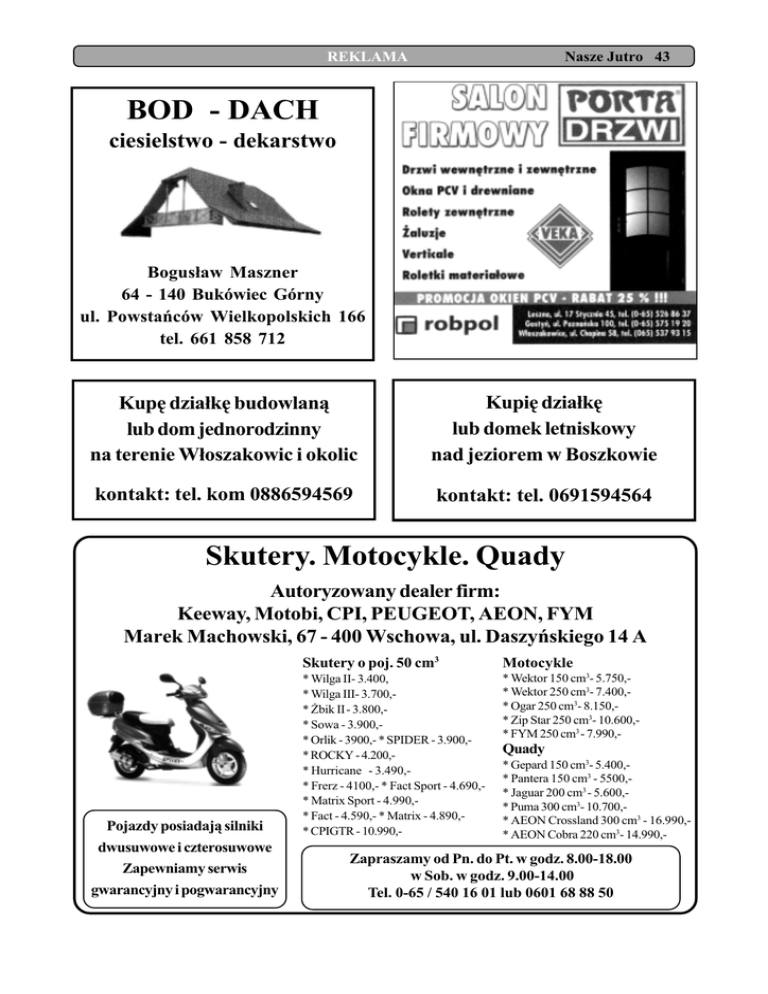 REKLAMA Nasze Jutro 43 BOD - DACH ciesielstwo - dekarstwo Bogus³aw Maszner 64 - 140 Bukówiec Górny ul. Powstañców Wielkopolskich 166 tel. 661 858 712 Kupê dzia³kê budowlan¹ lub dom jednorodzinny na terenie W³oszakowic i okolic Kupiê dzia³kê lub domek letniskowy nad jeziorem w Boszkowie kontakt: tel. kom 0886594569 kontakt: tel. 0691594564 Skutery. Motocykle. Quady Autoryzowany dealer firm: Keeway, Motobi, CPI, PEUGEOT, AEON, FYM Marek Machowski, 67 - 400 Wschowa, ul. Daszyñskiego 14 A Skutery o poj. 50 cm3 Pojazdy posiadaj¹ silniki dwusuwowe i czterosuwowe Zapewniamy serwis gwarancyjny i pogwarancyjny * Wilga II- 3.400, * Wilga III- 3.700,* ¯bik II - 3.800,* Sowa - 3.900,* Orlik - 3900,- * SPIDER - 3.900,* ROCKY - 4.200,* Hurricane - 3.490,* Frerz - 4100,- * Fact Sport - 4.690,* Matrix Sport - 4.990,* Fact - 4.590,- * Matrix - 4.890,* CPIGTR - 10.990,- Motocykle * Wektor 150 cm3- 5.750,* Wektor 250 cm3- 7.400,* Ogar 250 cm3- 8.150,* Zip Star 250 cm3- 10.600,* FYM 250 cm3 - 7.990,- Quady * Gepard 150 cm3- 5.400,* Pantera 150 cm3 - 5500,* Jaguar 200 cm3 - 5.600,* Puma 300 cm3- 10.700,* AEON Crossland 300 cm3 - 16.990,* AEON Cobra 220 cm3- 14.990,- Zapraszamy od Pn. do Pt. w godz. 8.00-18.00 w Sob. w godz. 9.00-14.00 Tel. 0-65 / 540 16 01 lub 0601 68 88 50