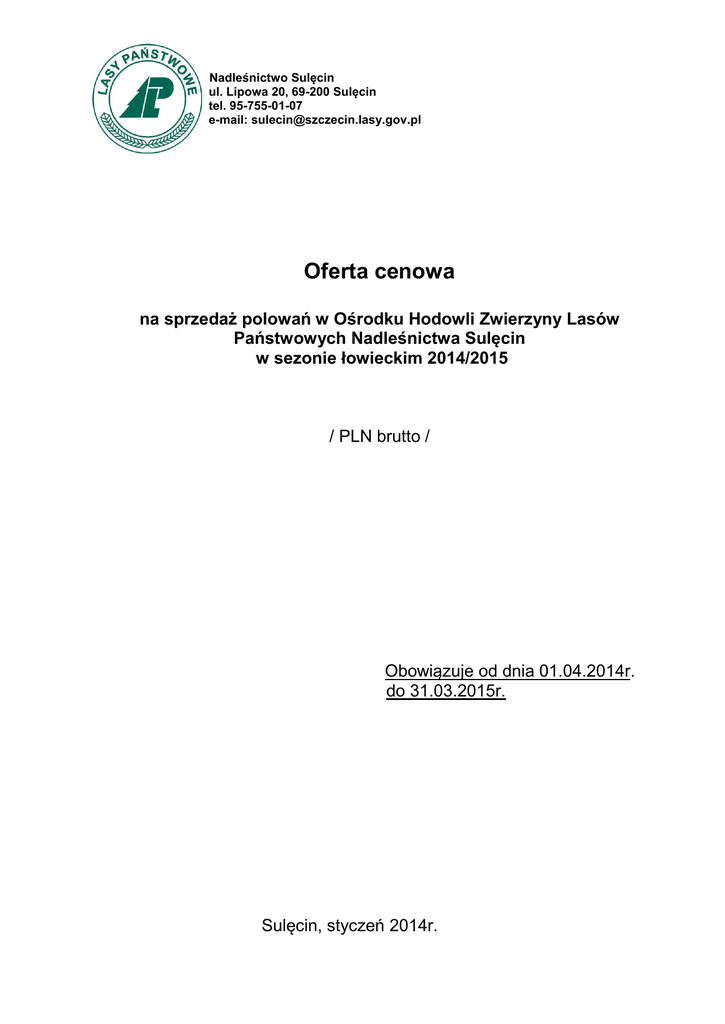Oferta na polowania - Nadleśnictwo Sulęcin