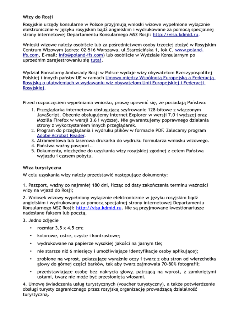 Wizy do Rosji Rosyjskie urzędy konsularne w Polsce przyjmują wnioski wizowe wypełnione wyłącznie elektronicznie w języku rosyjskim bądź angielskim i wydrukowane za pomocą specjalnej strony internetowej Departamentu Konsularnego MSZ Rosji: http://visa.kdmid.ru. Wnioski wizowe należy osobiście lub za pośrednictwem osoby trzeciej złożyć w Rosyjskim Centrum Wizowym (adres: 02-516 Warszawa, ul.Starościńska 1, lok.C, www.polandifs.com, E-mail: [email protected]) lub osobiście w Wydziale Konsularnym po uprzednim zarejestrowaniu się tutaj. Wydział Konsularny Ambasady Rosji w Polsce wydaje wizy obywatelom Rzeczypospolitej Polskiej i innych państw UE w ramach Umowy między Wspólnotą Europejską a Federacją Rosyjską o ułatwieniach w wydawaniu wiz obywatelom Unii Europejskiej i Federacji Rosyjskiej. Przed rozpoczęciem wypełniania wniosku, proszę upewnić się, że posiadają Państwo: 1. Przeglądarka internetowa obsługującą szyfrowanie 128-bitowe z włączonym JavaScript. Obecnie obsługujemy Internet Explorer w wersji 7.0 i wyższej oraz Mozilla Firefox w wersji 3.6 i wyższej. Nie gwarantujemy poprawnego działania strony z wykorzystaniem innych przeglądarek. 2. Program do przeglądania i wydruku plików w formacie PDF. Zalecamy program Adobe Acrobat Reader. 3. Atramentowa lub laserowa drukarka do wydruku formularza wniosku wizowego. 4. Państwa ważny paszport.. 5. Dokumenty, niezbędne do uzyskania wizy rosyjskiej zgodnej z celem Państwa wyjazdu i czasem pobytu. Wiza turystyczna W celu uzyskania wizy należy przedstawić następujące dokumenty: 1. Paszport, ważny co najmniej 180 dni, licząc od daty zakończenia terminu ważności wizy na wjazd do Rosji; 2. Wniosek wizowy wypełniony wyłącznie elektronicznie w języku rosyjskim bądź angielskim i wydrukowany za pomocą specjalnej strony internetowej Departamentu Konsularnego MSZ Rosji: http://visa.kdmid.ru. Nie są przyjmowane kwestionariusze nadesłane faksem lub pocztą. 3. Jedno zdjęcie • rozmiar 3,5 x 4,5 cm; • kolorowe, ostre, czyste i kontrastowe; • wydrukowane na papierze wysokiej jakości na jasnym tle; • nie starsze niż 6 miesięcy i umożliwiające identyfikacje osoby aplikującej; • zrobione na wprost, pokazujące wyraźnie oczy i twarz z obu stron od wierzchołka głowy do górnej części barków, tak aby twarz zajmowała 70-80% fotografii; • przedstawiające osobę bez nakrycia głowy, patrzącą na wprost, z zamkniętymi ustami, twarz nie może być przesłonięta włosami. 4. Umowę świadczenia usług turystycznych (voucher turystyczny), a także potwierdzenie obsługi turysty zagranicznego przez rosyjską organizację prowadzącą działalność turystyczną. 5. Ubezpieczenie zdrowotne z pokryciem €30 000 ważne na terenie Federacji Rosyjskiej na okres pobyty w Rosji. W przypadku wizy wielokrotnej – ważne na okres pierwszego wjazdu. Wiza turystyczna (jedno lub dwukrotna) wystawiana maksymalnie na okres do 30 dni. Uwaga! W Rosji obowiązuje konieczność zameldowania się w miejscu pobytu w organie terytorialnym Federacyjnej Służby Migracyjnej Rosji. Szczegółowe informacje dotyczące uzyskania wizy (wykaz niezbędnych dokumentów, tryb złożenia dokumentów, wymagane parametry fotografii, opłaty, termin odbioru i t.p.) mogą Państwo uzyskać wyłącznie w tej placówce dyplomatycznej, urzędzie konsularnym Federacji Rosyjskiej w której będą Państwo składać dokumenty celem uzyskania wizy. Uwaga: przy wstrzymaniu wypełniania formularza na czas dłuższy niż 20 minut, sesja zostanie zamknięta. W przypadku, jeśli Pastwo nie zapisali numeru wniosku lub nie zachowali kopii roboczej, należy rozpocząć wypełnianie ponwnie. Sposób wypełnienia elektronicznego formularza wniosku wizowego 1. Z wyświetlonej listy „Kraj“, w którym znajduje się placówka dyplomatyczna, urząd konsularny Federacji Rosyjskiej lub Rosyjskie Centrum Wizowe,wybrać kraj gdzie Państwo zamierzają wnioskować o uzyskanie wizy. 2. Z wyświetlonej listy „Język podpowiedzi“ proszę wybrać odpowiedni język. Podpowiedzi te będą wyjaśniać sens pytań, na które należy udzielić odpowiedzi. Jeśli do podpowiedzi wybrali Państwo język rosyjski, wszystkie odpowiedzi na pytania wniosku wizowego należy wprowadzać wyłącznie w języku rosyjskim za wyjątkiem nazwisk, imion, adresów i nazw instytucji, które należy wpisać w języku angielskim. W przypadku wyboru języka innego niż rosyjski, wszystkie Państwa odpowiedzi powinny być wpisane w języku ojczystym z wyłącznym wykorzystaniem znaków alfabetu łacińskiego. W razie występowania w nazwisku lub imieniu znaków alfabetu języka ojczystego nie zawartych w alfabecie łacińskim (takich, jak Ñ, É, Ü, Ā, Ŏ lub Ç), przy wypełnianiu poszczególnych pól formularza należy wpisać transliterację, umieszczoną w pierwszym odczytywanym elektronicznie wierszu wpisu w Państwa paszporcie. Na przykład, jeśli zapis na stronie z fotografią wygląda następująco: «Séo Türre», to we wniosku wizowym należy wpisać imiona i nazwisko z powyższego wiersza. P<UTOTUERRE<<SEO<<<<<<<<<<<<<<<<<<<<<<<<<<<< L898902C<3UTO6908061F9406236ZE184226B<<<<<14 3. W celu rozpoczęcia wypełniania nowego formularza wniosku należy kliknąć przycisk „Wypełnij nowy wniosek”. Aby kontynuować wypełnianie formularza, edytować wcześniej wypełniony formularz, utworzyć nowy formularz na bazie uprzednio wprowadzonych danych, proszę kliknąć przycisk „Otwórz wcześniej wypełniony formularz”. 4. Należy zapisać numer wniosku wskazany w górnym prawym rogu strony. Będzie on potrzebny do dalszego wypełniania wniosku w przypadku przerwania sesji. Celem zachowania kopii roboczej formularza należy skorzystać z przycisku „Zachowaj kopię”. 5. Proszę postępować według instrukcji zamieszczonych na każdej stronie formularza wniosku. Pola zaznaczone symbolem „*” należy wypełnić obowiązkowo. W razie pomyłek pr