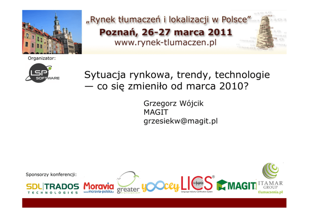 Organizator: Sytuacja rynkowa, trendy, technologie — co się zmieniło od marca 2010? Grzegorz Wójcik MAGIT [email protected] Sponsorzy konferencji: Plan prezentacji • • • • Sytuacja ogólna - rewolucja czy ewolucja? MT - krok po kroku, nieubłaganie Ekosystemy Tłumaczenia „tłumne” (crowdsourcing/community sourcing) • Narzędzia w chmurach • Będzie Pan zadowolony... • Pomysły, trendy, rozwaŜania... „Rynek tłumaczeń i lokalizacji w Polsce”, Poznań, 26-27 marca 2011 2/20 Sytuacja ogólna - rewolucja czy ewolucja? •Rynek - ogólny trend wzrostowy - ok. 5-11% rocznie do 2015 •Decyzja o zakupie podejmowana jest na podstawie materiałów w języku ojczystym (ok. 90% klientów): Willy Brandt - „If I’m selling to you, I speak your language. If I’m buying, dann müssen Sie Deutsch sprechen.” „Rynek tłumaczeń i lokalizacji w Polsce”, Poznań, 26-27 marca 2011 3/20 Sytuacja ogólna Najpopularniejsze języki w Internecie Liczba znających język: angielski - ok. 1,3 mld chiński - ok. 1,3 mld hinduskie - ok. 900 mln arabski - ok. 530 mln Angielski Chiński Hiszpański Japoński Portugalski Niemiecki Arabski Francuski Koreański Liczba uŜytkowników wg znajomości języka Pozostałe Dane na 30.6.2010 Rosyjski 0 100 200 300 400 500 600 Miliony uŜytkowników Źródło: www.internetworldstats.com • Chiński niedługo przegoni angielski (2000: 25 mln, 2010: 430 mln) „Rynek tłumaczeń i lokalizacji w Polsce”, Poznań, 26-27 marca 2011 4/20 Sytuacja ogólna Podział rynku firm tłumaczeniowych Skandynaw ia 3% 30 największych firm: - 26,6% rynku - ok. 980 osób/firmę Azja 3% Reszta Europy 17% Reszta: - 73,4% rynku - b. duŜe rozdrobnienie UK 15% USA 62% Dla 30 największych firm tłumaczeniowych Źródło: Common Sense Advisory • Domincja firm z USA i Europy. Ale dla Azji prognoza wzrostowa (Chiny, Indie) „Rynek tłumaczeń i lokalizacji w Polsce”, Poznań, 26-27 marca 2011 5/20 Sytuacja ogólna - rewolucja czy ewolucja? • Ceny nie idą w górę... - branŜa podwykonawcza (bierna) - tłumaczenie jako towar (prąd, cukier...) • Skalowalność, ale bez planowania • Przerzucanie kosztów w dół łańcucha MLV • Narzędzia, systemy: - rynek w fazie zmiany - koniec „monopolu” Tradosa - platformy, nowi gracze, open source - MT się rozpowszechnia „Rynek tłumaczeń i lokalizacji w Polsce”, Poznań, 26-27 marca 2011 6/20 MT - krok po kroku, nieubłaganie • Nie panaceum, ale narzędzie • Google Translate - zło konieczne? • Rozwój oferty narzędzi (Systran, Asia Online, PROMT, MOSES+...) • Duzi klienci intensywnie wdraŜają - ogrom zgromadzonych danych/TM - publiczne repozytoria (TAUS, itp.) - „szybki” sposób na ograniczenie kosztów • Czy MT zwiększy wolumen tłumaczeń? „Rynek tłumaczeń i lokalizacji w Polsce”, Poznań, 26-27 marca 2011 7/20 MT - krok po kroku, nieubłaganie • Jak liczyć pracę? Wg badań TAUS: 40% - stawka fuzzy, 34% - wg godzin, 26% - inaczej • Jak ma być efekt i jaki proces? - MT+PE, MT+PE+autoQA, MT+PE+E/P • Przydatność MT: - zaleŜy od jakości danych językowych - zaleŜy od pary językowej, dziedziny, a nawet typu tekstu - brak miar oceny „jakości MT” • Nie da się wdroŜyć na chybcika • Pomaga standaryzacja źródła „Rynek tłumaczeń i lokalizacji w Polsce”, Poznań, 26-27 marca 2011 8/20 Ekosystemy/platformy • Próba stworzenia systemu online, który łączy dostęp dla klientów, narzędzia MT/TM/CAT, wyceny, określanie toku prac, automatyczną dystrybucję zadań (aukcja, kto szybszy...) wśród podwykonawców • ZagroŜenie dominacją? Np. przez Lionbridge Translation Workspace (droga Google czy Facebooka) • Próby promowania platform: Lingotek (OEM), mygengo, Translia? • Lionbridge współpracuje z TDA (zasoby TM) • Duzi MLV dopuszczają współpracę z freelancerami „Rynek tłumaczeń i lokalizacji w Polsce”, Poznań, 26-27 marca 2011 9/20 Tłumaczenie „tłumne” (crowd/community sourcing) • Pomysł się przyjął - pionierzy: np. Linux, Panoramio • Implementacja takiego trybu pracy dodawana systemów TMS online • Tłumaczenie społecznościowe - da się, jeśli jest społeczność • Nie mieszać entuzjazmu z biznesem (patrz LinkedIn) • Kosztów zarządzania nie da się uniknąć • Jak wynagradzać? • Crowdsourcing -> tłumoczenie „Rynek tłumaczeń i lokalizacji w Polsce”, Poznań, 26-27 marca 2011 10/20 Narzędzia w chmurach • Systemy TM/TMS online (WordFast Anywhere, XTM, itd.): - większy wybór dla LSP i klientów - coraz niŜsza bariera wejścia - czy klienci będą chcieli płacić za narzędzia? • Uwiązanie do pracy online to teŜ minusy: - mniejsza szybkość pracy - nie cały świat ma szybki dostęp - mniejsza elastyczność podwykonawców „Rynek tłumaczeń i lokalizacji w Polsce”, Poznań, 26-27 marca 2011 11/20 Będzie Pan zadowolony... • Wybór podwykonawców silniej zaleŜy od poziomu cen - czy to tylko dla „wiodących klientów IT”? • Nie tylko model T+E+P - klienci oczekują poziomu jakości i mniej ich interesuje jak się go osiąga • Unikanie minimalnego zamówienia, tryb ciągły, rozliczenia okresowe • „Good enough” - nie zawsze najlepsza jakość jest najlepsza, poziomy jakości: - róŜnice w procesie, - róŜne stawki zaleŜnie od wymagań? „Rynek tłumaczeń i lokalizacji w Polsce”, Poznań, 26-27 marca 2011 12/20 Trendy • LISA kończy działanie (ponad 20 lat) - komitet OSCAR (TMX, TBX, SRX...) - potrzeba wypracowania standardów - TAUS chce przejąć pałeczkę - powstanie stowarzyszenia GALA (2002) • Narzędzia oddane w Open Source: IBM TM/2, Welocalize GlobalSight • Lionbridge - przejmuje MT od IBM • SDL - współpraca z Language Weaver „Rynek tłumaczeń i lokalizacji w Polsce”, Poznań, 26-27 marca 2011 13/20 TAUS + TDA • TAUS (zał. 2004 r.)/ - Organizacja „non profit”, „think tank” - Kilkadziesiąt znaczących firm - Cel: poprawa ja