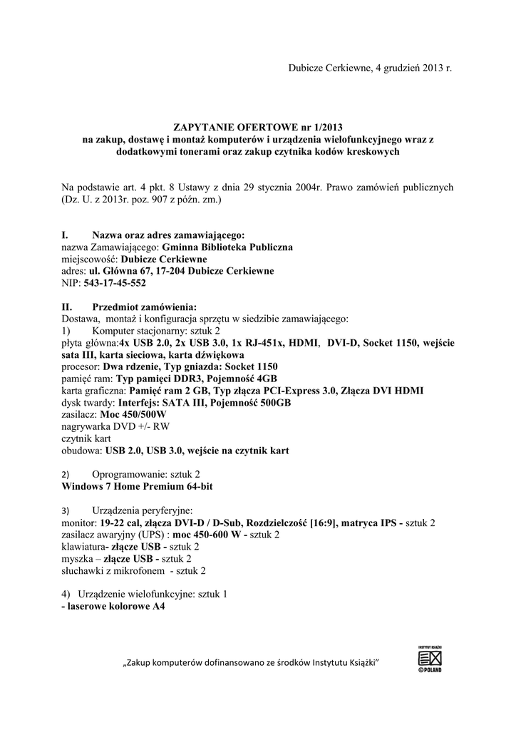 Dubicze Cerkiewne, 4 grudzień 2013 r. ZAPYTANIE OFERTOWE nr 1/2013 na zakup, dostawę i montaż komputerów i urządzenia wielofunkcyjnego wraz z dodatkowymi tonerami oraz zakup czytnika kodów kreskowych Na podstawie art. 4 pkt. 8 Ustawy z dnia 29 stycznia 2004r. Prawo zamówień publicznych (Dz. U. z 2013r. poz. 907 z późn. zm.) I. Nazwa oraz adres zamawiającego: nazwa Zamawiającego: Gminna Biblioteka Publiczna miejscowość: Dubicze Cerkiewne adres: ul. Główna 67, 17-204 Dubicze Cerkiewne NIP: 543-17-45-552 II. Przedmiot zamówienia: Dostawa, montaż i konfiguracja sprzętu w siedzibie zamawiającego: 1) Komputer stacjonarny: sztuk 2 płyta główna:4x USB 2.0, 2x USB 3.0, 1x RJ-451x, HDMI, DVI-D, Socket 1150, wejście sata III, karta sieciowa, karta dźwiękowa procesor: Dwa rdzenie, Typ gniazda: Socket 1150 pamięć ram: Typ pamięci DDR3, Pojemność 4GB karta graficzna: Pamięć ram 2 GB, Typ złącza PCI-Express 3.0, Złącza DVI HDMI dysk twardy: Interfejs: SATA III, Pojemność 500GB zasilacz: Moc 450/500W nagrywarka DVD +/- RW czytnik kart obudowa: USB 2.0, USB 3.0, wejście na czytnik kart Oprogramowanie: sztuk 2 Windows 7 Home Premium 64-bit 2) Urządzenia peryferyjne: monitor: 19-22 cal, złącza DVI-D / D-Sub, Rozdzielczość [16:9], matryca IPS - sztuk 2 zasilacz awaryjny (UPS) : moc 450-600 W - sztuk 2 klawiatura- złącze USB - sztuk 2 myszka – złącze USB - sztuk 2 słuchawki z mikrofonem - sztuk 2 3) 4) Urządzenie wielofunkcyjne: sztuk 1 - laserowe kolorowe A4 „Zakup komputerów dofinansowano ze środków Instytutu Książki” -automatyczny dwustronny podajnik oryginałów -drukarka sieciowa -automatyczny moduł druku dwustronnego -podajnik na papier 350 szt. -prędkość drukowania ok. 20str/min 5) zestaw oryginalnych tonerów do urządzenia wielofunkcyjnego: sztuk 2 (w zestawie kolor czarny, żółty, niebieski, czerwony) 6) czytnik kodów kreskowych + podstawka – sztuk 1 szybkość skanowania do 100 kodów/s norma szczelności Ip42 dwa tryby pracy łatwa obsługa i duża dokładność Wszystkie parametry techniczne winny być potwierdzone w specyfikacji technicznej producenta. Urządzenia powinny być nowe z potwierdzonego źródła pochodzenia, gotowe do pracy, z kompletem standardowych materiałów eksploatacyjnych. Cena ofertowa i sposób jej podania: Cenę ofertową wyrażoną w złotych polskich z wyodrębnieniem wartości podatku VAT, Wykonawca poda na formularzu ofertowym stanowiącym załącznik Nr 1. Cena podana w ofercie powinna obejmować wszystkie koszty i składniki związane z wykonaniem zamówienia oraz warunkami stawianymi przez Zamawiającego w tym koszt dostawy, montażu i konfiguracji sprzętu. III. IV. Okres związania ofertą: 30 dni od terminu składania ofert. V. Czas realizacji zamówienia: od 9.12.2013r. do 14.12.2013r. VI. Opis warunków udziału w postępowaniu: 1) Wykonawca ubiegający się o realizację zamówienia musi spełniać warunki zawarte w art.22 ust. 1 i nie podlegać wykluczeniu na podstawie art. 24 ust.1 i 2 ustawy Prawo zamówień publicznych. 2) Udzieli 24 m-cy gwarancji. 3) Zaakceptuje 14 – dniowy termin płatności faktur VII. Wykaz dokumentów wymaganych do potwierdzenia nie podlegania wykluczeniu na podstawie art. 24 ust. 1 i 2 oraz spełnienie warunków art. 22 ust. 1 ustawy PZP: 1) Oświadczenie Wykonawcy o spełnieniu warunków zawartych w art.22 ust.1 ustawy Prawo zamówień publicznych (załącznik nr 2 do zapytania ofertowego). 2) Oświadczenie Wykonawcy o niepodleganiu wykluczeniu na podstawie art. 24 ust. 1 i 2 ustawy Prawo zamówień publicznych (załącznik nr 2 do zapytania ofertowego). 3) Specyfikacja oferowanych urządzeń, certyfikat bezpieczeństwa, atesty, deklaracje zgodności itp. „Zakup komputerów dofinansowano ze środków Instytutu Książki” 4) Wypełniony formularz – oferta podpisany przez upoważnionego przedstawiciela Wykonawcy( załącznik nr 1 do zapytania ofertowego) VIII. Miejsce złożenia ofert: - pocztą tradycyjną na adres: Gminna Biblioteka Publiczna, 17-204 Dubicze Cerkiewne, ul. Główna 67 – z adnotacją: Zapytanie ofertowe do postępowania o udzielenie zamówienia publicznego na zakup sprzętu w ramach Programu „Kraszewski. Komputery dla bibliotek 2013” - przesłać e-mailem na adres: [email protected] - przesłać faksem na nr 85 6827980 - złożyć osobiście w siedzibie Biblioteki. IX. Termin złożenia ofert: Ofertę określającą cenę wykonania zamówienia należy złożyć na formularzu ofertowym w formie pisemnej, stanowiącym załącznik nr 1 do niniejszego zapytania w terminie do 7 grudnia 2013 roku do godz. 1200 na adres siedziby zamawiającego lub na adres mailowy: [email protected] Do formularza należy załączyć specyfikację techniczną oferowanego sprzętu, deklaracje zgodności oraz oświadczenie zgodnie z załącznikiem nr 2. Zamawiający nie dopuszcza składania ofert częściowych. Realizacja zamówienia nie może być powierzona podwykonawcom. X. XI. Zamawiający wyznaczył następujące kryteria oceny ofert i ich znaczenie: cena – 100%. W trakcie porównania ofert Zamawiający zastosuje następujące metody obliczania: cena oferty najniższej ------------------------------ x 100 pkt cena oferty rozpatrywanej XII. Zapytania o przedmiot zamówienia: Wszelkich informacji dotyczących przedmiotu zamówienia udziela Kierownik Gminnej Biblioteki Publicznej w Dubiczach Cerkiewnych Pani Mirosława Siemieniuk-Morawska, tel. 85 6827998 E-mail: [email protected] Wykonawca, którego oferta będzie najkorzystniejsza zostanie poinformowany telefonicznie o wyborze oferty i terminie podpisania umowy w dniu 9.12.2013 r. (wzór umowy w załączniku) XIII. Załączniki nr 1 - Formularz oferty nr 2 - Oświadczenie o spełnieniu warunków zawartych w art. 22 ust. 1 oraz o niepodleganiu wykluczeniu na podstawie art. 24 ust. 1 i 2 ustawy Prawo zamówień publicznych. nr 3 - Wzór umowy „Zakup komputerów dofinansowano ze środków Instytutu Ksi