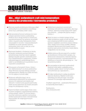 Abc... zdjec podwodnych czyli mini kompendium wiedzy dla producenta i kierownika produkcji. ierwsza zasada produkcyjna dotycząca zdjęć P podwodnych to pomnożenie wszystkiego przez trzy tj. pieniędzy, ludzi i czasu. F akt posiadania licencji nurkowej nie czyni z kogoś operatora kamery podwodnej. Działa to też w drugą stronę to, że ktoś jest operatorem kamery nie oznacza, że poradzi sobie z nią pod wodą. Rozwiązanie, które zaoszczędzi Ci nerwów i nieprzewidzianych wydatków to nurek operator kamery podwodnej, który wie co robi, bo w ten sposób zarabia na życie. bcinanie budżetu i chodzenie na skróty O to bardzo ryzykowny pomysł, którego konsekwencją może być nawet wypadek. Dlatego też jeśli operator podwodny prosi Cię o zespół lekarski w pogotowiu, nurków zabezpieczających, podwodnego focus puller’a czy dodatkowych asystentów ma to racjonalne uzasadnienie. F ilmowanie w formatach 35mm, 16mm i tzw. elektronicznych ze strony podwodnej ekipy filmowej wymaga takiego samego zaangażowania, dlatego też wybór formatu nie ma wpływu na koszt zdjęć. urkowie zabezpieczający nie są N podwodnymi dyżurnymi czy asystentami kamery. Ich zadaniem jest opieka nad aktorami i nurkami pracującymi pod wodą. Jeżeli zaczną zajmować się innymi rzeczami mogą nie zareagować w porę… apewnij ekipie wystarczająco dużo czasu Z na prace związane z wyjmowaniem kamery, zmianą optyki i baterii. To nie jest łatwe i musi być wykonane zgodnie z procedurą. Drobne przeoczenie może w konsekwencji doprowadzić do nadprogramowych wydatków. ddychanie sprężonym powietrzem O powoduje odwodnienie organizmu, aby tego uniknąć zapewnij wystarczającą ilość napoi przy basenie… Uwaga! Nie pijemy wody z basenu :) imo że praca w wodzie wydaje się być M lekka i przyjemna wiedz, że tak nie jest. Woda przy swojej ponad 800 krotnie większej gęstości względem powietrza stawia większy opór i każdy ruch to duży wysiłek. Dlatego pamiętaj! Ograniczona ilość godzin pracy i przerwy są po prostu konieczne, nawet płatne nadgodziny nas nie cieszą. rótkie przerwy dla pracujących w wodzie K są nieodzowne. Zmianę butli, sprzętu, czy konieczność skorzystania z łazienki staramy się zsynchronizować z wymianą baterii czy obiektywu w kamerze, ale pamiętaj, że… my też jesteśmy ludźmi. ie oszczędzaj na łączności podwodnej! N Wyobraź sobie jakby wyglądała praca na planie, gdyby reżyser nie był w stanie komunikować się z operatorem… o zdjęć podwodnych nadają się jedynie D sztywne obudowy. Miękkie worki typu Splashbag nie służą do tego i nie mogą stanowić ich tańszego odpowiednika. A byłbym zapomniał… podwodne filmowanie to naprawdę duża frajda :) Pozdrawiam, Artur Zwierzchowski Aquafilm ul. Asfaltowa 2 m. 29 02-527 Warsaw, Poland tel. +48 503 007 116 tel. +48 606 140 423 [email protected] www.aquafilm.pl