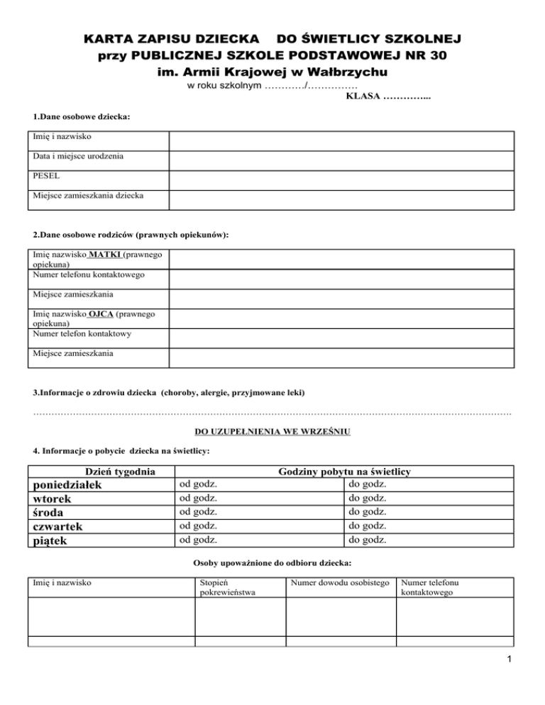 KARTA ZAPISU DZIECKA DO ŚWIETLICY SZKOLNEJ przy PUBLICZNEJ SZKOLE PODSTAWOWEJ NR 30 im. Armii Krajowej w Wałbrzychu w roku szkolnym …………/…………… KLASA …………... 1.Dane osobowe dziecka: Imię i nazwisko Data i miejsce urodzenia PESEL Miejsce zamieszkania dziecka 2.Dane osobowe rodziców (prawnych opiekunów): Imię nazwisko MATKI (prawnego opiekuna) Numer telefonu kontaktowego Miejsce zamieszkania Imię nazwisko OJCA (prawnego opiekuna) Numer telefon kontaktowy Miejsce zamieszkania 3.Informacje o zdrowiu dziecka (choroby, alergie, przyjmowane leki) …………………………………………………………………………………………………………………………………………. DO UZUPEŁNIENIA WE WRZEŚNIU 4. Informacje o pobycie dziecka na świetlicy: Dzień tygodnia poniedziałek wtorek środa czwartek piątek od godz. od godz. od godz. od godz. od godz. Godziny pobytu na świetlicy do godz. do godz. do godz. do godz. do godz. Osoby upoważnione do odbioru dziecka: Imię i nazwisko Stopień pokrewieństwa Numer dowodu osobistego Numer telefonu kontaktowego 1 UWAGA ! W przypadku odbioru dziecka przez osobę niepełnoletnią bierzemy pełną odpowiedzialność prawną za bezpieczeństwo odebranego dziecka od momentu jego odbioru przez wskazaną powyżej, upoważnioną przez nas osobę. …………………………………………………………………… ……………………………………………........................... (Czytelny podpis) Data i podpis matki /prawnego opiekuna prawnego (Czytelny podpis) Data i podpis ojca /opiekuna W przypadku zgody na samodzielny powrót dziecka do domu, rodzice (opiekunowie prawni) zobowiązani są wypełnić poniższe oświadczenie: ( do uzupełnienia we wrześniu) OŚWIADCZENIE i ZOBOWIĄZANIA Oświadczam, że moje dziecko……… ………………………………………………………………………………………...może na moją odpowiedzialność samodzielnie wychodzić ze świetlicy szkolnej: Dzień tygodnia poniedziałek wtorek środa czwartek piątek Godziny wyjścia ze świetlicy - zobowiązuje się do informowania o wszelkich zmianach danych zawartych w niniejszym zgłoszeniu i ich uaktualniania - zobowiązuje się również do punktualnego odbierania mojego dziecka ze świetlicy …...... …................ …………….................... (Czytelny podpis) Data i podpis matki /prawnego opiekuna ………………............................................. (Czytelny podpis) Data i podpis ojca /opiekuna prawnego 2