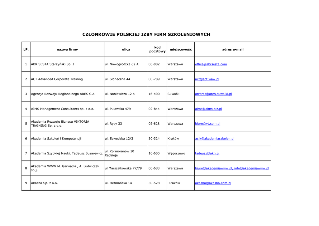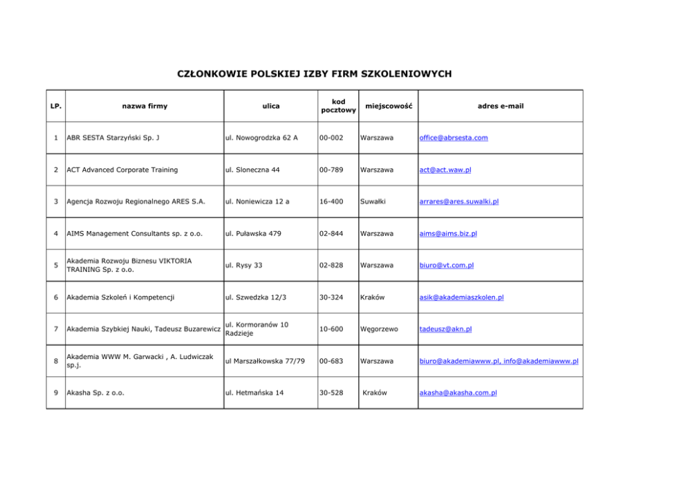 CZŁONKOWIE POLSKIEJ IZBY FIRM SZKOLENIOWYCH LP. nazwa firmy ulica kod pocztowy miejscowość adres e-mail 1 ABR SESTA Starzyński Sp. J ul. Nowogrodzka 62 A 00-002 Warszawa [email protected] 2 ACT Advanced Corporate Training ul. Sloneczna 44 00-789 Warszawa [email protected] 3 Agencja Rozwoju Regionalnego ARES S.A. ul. Noniewicza 12 a 16-400 Suwałki [email protected] 4 AIMS Management Consultants sp. z o.o. ul. Puławska 479 02-844 Warszawa [email protected] 5 Akademia Rozwoju Biznesu VIKTORIA TRAINING Sp. z o.o. ul. Rysy 33 02-828 Warszawa [email protected] 6 Akademia Szkoleń i Kompetencji ul. Szwedzka 12/3 30-324 Kraków [email protected] 7 Akademia Szybkiej Nauki, Tadeusz Buzarewicz ul. Kormoranów 10 Radzieje 10-600 Węgorzewo [email protected] 8 Akademia WWW M. Garwacki , A. Ludwiczak sp.j. ul Marszałkowska 77/79 00-683 Warszawa [email protected], [email protected] 9 Akasha Sp. z o.o. ul. Hetmańska 14 30-528 Kraków [email protected] 10 Altkom Akademia S.A ul. Stawki 2 00-193 Warszawa [email protected] 11 AMC Advanced Manufacturing Consulting and Training ul. Słowicza 25A 05-807 Podkowa Leśna [email protected] 12 ANVIX Spółka z o.o. ul. Kordylewskiego 11 31-543 Kraków [email protected] 13 ARK Consulting Romuald Korach ul. Grunwaldzka 5 lok. 39 05-825 Grodzisk Mazowiecki [email protected] 14 ASPEN CONSULTING ul. Przy Lesie 1 96-321 śabia Wola, OSOWIEC [email protected] 15 ASYLON Ośrodek Psychoedukacyjny, Teresa Sasak ul. Gwiaździsta 33/164 01-651 Warszawa [email protected] 16 ATC s.c. ul. Lipowa 1 63-800 Gostyń [email protected] 17 B&O NAVIGATOR Firma Szkoleniowa Sp. z o.o. ul. Obozowa 61/3 01-418 Warszawa [email protected] 18 BDG Sp. z o.o. ul. Ligi Polskiej 12H 87-100 TORUŃ [email protected] 19 BERNDSON Sp. z o.o. ul. 3-go Maja 9 30-062 Kraków [email protected] 20 BIB BoŜydar Marcin Błęcki ul. Pstrowskiego 14 B/85 10-602 Olsztyn [email protected] 21 BMM Sp. z o.o. ul. 8 Marca 3 35-065 Rzeszów [email protected] 22 British Class s.c., M. Jamiołkowski, R. Pieczkowski, A. Sobota ul. Westerplatte 2/1 10-900 Olsztyn [email protected] 23 Business Center 1.Anna Kępka (BC1) ul. Staromiejska 2/7 40-013 Katowice [email protected] 24 CADExpert Sp. z o.o. ul. śeromskiego 94 C 90-550 Łódź [email protected] 25 CEGOS Polska sp. z o.o. ul. Świętojerska 5/7 00-236 Warszawa [email protected] 26 Centrum Edukacji EKSPERT ul. Stawki 14 00-178 Warszawa [email protected] 27 Centrum Edukacji Grupa ORLEN ul. Kobylińskiego 25 09-400 Płock [email protected] 28 Centrum Edukacji Logistycznej Sp. z o.o. ul. Estkowskiego 6 61-755 Poznań [email protected] 29 Centrum Edukacji Psychologicznej FENIX ul. Francuska 30 03-905 Warszawa [email protected] 30 Centrum Kreowania Liderów S.A. - 05-824 Kłudzienko k. Warszawy [email protected], [email protected], [email protected] 31 Centrum Kształcenia MenedŜerów Przemysłowych Sp. z o.o. w Lublinie ul. Bursaki 12 20-150 Lublin [email protected] 32 Centrum Organizacji Szkoleń MenedŜerskich ul. Kwitnąca 5/52 01-926 Warszawa [email protected] 33 Centrum Rozwiązań MenedŜerskich S.A. ul. Batalionu Platerówek 3 03-308 WARSZAWA [email protected] 34 Centrum Szkoleniowe FRR Sp. z o.o. ul. Nowogrodzka 4 lok. 7 i 8 00-513 Warszawa [email protected] 35 Centrum Szkoleniowo-Konsultingowe KONCEPT ul. Kasztanowa 16 Krzysztof Wiśniak 46-022 Kępa k/Opola [email protected] 36 Centrum Wspierania Projektów Europejskich Sp. z o.o. ul. Rogowska 127 54-440 Wrocław [email protected] 37 CERTUS Centrum Szkolenia i Doradztwa Sp. z o.o. ul. Dobrowoja 11 04-003 Warszawa [email protected] 38 Cezary Radomski ul. Latawcowa 10/16 54-130 Wrocław [email protected] 39 CHILTERN CONSULTANCY INTERNATIONAL POLSKA Sp. Z o.o. ul. Obrońców 2B 03-933 Warszawa [email protected], [email protected] 40 COMARTIN - Marcin Chodorowski ul. Staszica 2 05-092 Łomianki [email protected] 41 Compendium - Centrum Edukacyjne Sp. z o.o. ul. Tatarska 5 30-103 Kraków [email protected] 42 COMPUTER SERVICE SUPPORT S.A. 03-301 Warszawa [email protected] ul. Jagiellońska 78 43 CONEX Szkolenia i Doradztwo ul. Marii Skłodowskiej Curie 24/28 10-112 Olsztyn [email protected] 44 Consult Małopolski Instytut NLP ul. Św. Sebastiana 20/12 31-049 Kraków [email protected] 45 CS Szkolenia i Doradztwo Sp. z o.o. ul. Minerska 16 04-506 Warszawa [email protected] 46 Denis' School Sp z o.o. Al. Jana Pawla II 12 00-124 Warszawa [email protected] 47 DICORIA Grupa Doradcza ul. Godebskiego 61 05-420 Józefów [email protected] 48 DMD CENTRUM SZKOLENIOWE A. Kempińska i ul. Lazara 19 M. Klimontowicz Sp. J 41-608 Świętochłowice [email protected] [email protected] 49 DOCTOR CONSULTING Quality Management Business Processes Sp.z o.o. ul. Szewska 74/3 50-121 Wrocław 50 DOOR Poland Sp. z o.o. ul Włodarzewska 33 03-384 Warszawa [email protected] 51 DSMG Management Consulting ul. J.J. Rostafińskich 4 02-593 Warszawa [email protected] 52 EGERIA CONSULTING W. L. Szymczak Sp. J. ul. Chopina 8 66-300 Międzyrzecz [email protected] 53 EHRENFELD POLSKA Sp. z o.o. ul. Wita Stwosza 1-2 50-148 Wrocław [email protected] 54 EKOLOGUS Sp. z o.o. ul. Karpacka 22 43-300 Bielsko-Biała [email protected] 55 EUREKA Niepubliczna Placówka Doskonalenia i Dokształcania Pracowników Szkolnictwa , ul. Czeremchowa 12/21 SłuŜby Zdrowia i Opieki Społecznej , Jan Zaręba 20-807 Lublin 56 Euro - Konsultant Sp. z o.o. Al. Pokoju 81 31-564 KRAKÓW [email protected], [email protected] 57 EUROFINANCE TRAINING SP. Z O.O. ul. Chałubińskiego 8 00-613 WARSZAWA [email protected] 58 Europejski Instytut Rozwoju Kadr Sp. z o.o. ul. Dzieci Warszawy 31/12 02-495 Warszawa [email protected] 59 Europejski Instytut Szkoleń „COMPENDIUM” ul. Spółdzielców 12/134 30-682 KRAKÓW [email protected] 60 Europejskie Centrum Kształcenia Zawodowego ul. Mickiewicza 36 "Eureka" 20-466 Lublin [email protected] 61 Europejskie Stowarzyszenie Badań i Rozwoju InŜynierii Informacji, Psychocybernetyki i NLP "COGITATE" ul. Widok 19/187 00-026 Warszawa [email
