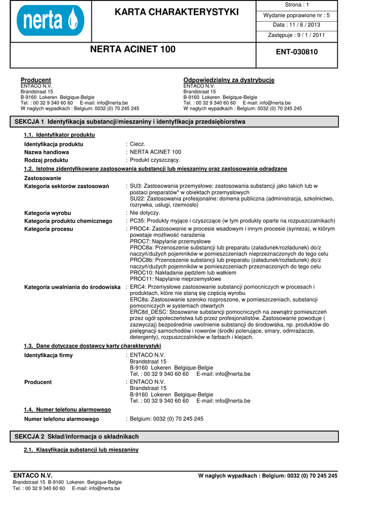 Strona : 1 KARTA CHARAKTERYSTYKI Wydanie poprawione nr : 5 Data : 11 / 6 / 2013 Zastępuje : 9 / 1 / 2011 NERTA ACINET 100 Producent ENTACO N.V. Brandstraat 15 B-9160 Lokeren Belgique-Belgie Tel. : 00 32 9 340 60 60 E-mail: [email protected] W nagłych wypadkach : Belgium: 0032 (0) 70 245 245 ENT-030810 Odpowiedzialny za dystrybucję ENTACO N.V. Brandstraat 15 B-9160 Lokeren Belgique-Belgie Tel. : 00 32 9 340 60 60 E-mail: [email protected] W nagłych wypadkach : Belgium: 0032 (0) 70 245 245 SEKCJA 1 Identyfikacja substancji/mieszaniny i identyfikacja przedsiębiorstwa 1.1. Identyfikator produktu Identyfikacja produktu Nazwa handlowa Rodzaj produktu : Ciecz. : NERTA ACINET 100 : Produkt czyszczący. 1.2. Istotne zidentyfikowane zastosowania substancji lub mieszaniny oraz zastosowania odradzane Zastosowanie Kategoria sektorów zastosowań : SU3: Zastosowania przemysłowe: zastosowania substancji jako takich lub w postaci preparatów* w obiektach przemysłowych SU22: Zastosowania profesjonalne: domena publiczna (administracja, szkolnictwo, rozrywka, usługi, rzemiosło) : Nie dotyczy. Kategoria wyrobu : PC35: Produkty myjące i czyszczące (w tym produkty oparte na rozpuszczalnikach) Kategoria produktu chemicznego : PROC4: Zastosowanie w procesie wsadowym i innym procesie (synteza), w którym Kategoria procesu powstaje możliwość narażenia PROC7: Napylanie przemysłowe PROC8a: Przenoszenie substancji lub preparatu (załadunek/rozładunek) do/z naczyń/dużych pojemników w pomieszczeniach nieprzeznaczonych do tego celu PROC8b: Przenoszenie substancji lub preparatu (załadunek/rozładunek) do/z naczyń/dużych pojemników w pomieszczeniach przeznaczonych do tego celu PROC10: Nakładanie pędzlem lub wałkiem PROC11: Napylanie nieprzemysłowe Kategoria uwalniania do środowiska : ERC4: Przemysłowe zastosowanie substancji pomocniczych w procesach i produktach, które nie staną się częścią wyrobu ERC8a: Zastosowanie szeroko rozproszone, w pomieszczeniach, substancji pomocniczych w systemach otwartych ERC8d_DESC: Stosowanie substancji pomocniczych na zewnątrz pomieszczeń przez ogół społeczeństwa lub przez profesjonalistów. Zastosowanie powoduje ( zazwyczaj) bezpośrednie uwolnienie substancji do środowiska, np. produktów do pielęgnacji samochodów i rowerów (środki polerujące, smary, odmrażacze, detergenty), rozpuszczalników w farbach i klejach. 1.3. Dane dotyczące dostawcy karty charakterystyki Identyfikacja firmy Producent : ENTACO N.V. Brandstraat 15 B-9160 Lokeren Belgique-Belgie Tel. : 00 32 9 340 60 60 E-mail: [email protected] : ENTACO N.V. Brandstraat 15 B-9160 Lokeren Belgique-Belgie Tel. : 00 32 9 340 60 60 E-mail: [email protected] 1.4. Numer telefonu alarmowego Numer telefonu alarmowego : Belgium: 0032 (0) 70 245 245 SEKCJA 2 Skład/informacja o składnikach 2.1. Klasyfikacja substancji lub mieszaniny ENTACO N.V. Brandstraat 15 B-9160 Lokeren Belgique-Belgie Tel. : 00 32 9 340 60 60 E-mail: [email protected] W nagłych wypadkach : Belgium: 0032 (0) 70 245 245 Strona : 2 KARTA CHARAKTERYSTYKI Wydanie poprawione nr : 5 Data : 11 / 6 / 2013 Zastępuje : 9 / 1 / 2011 NERTA ACINET 100 ENT-030810 SEKCJA 2 Skład/informacja o składnikach (ciąg dalszy) Klasyfikacja wg 67/548/EWG lub 1999/45/WE Klasyfikacja : C; R34 Klasa zagrożenia i kody kategorii, Rozporządzenie (WE) NR 1272/2008 (CLP) Zagrożenia dla zdrowia : Działanie żrące na skórę - Kategoria 1B - Niebezpieczeństwo (CLP : Skin Corr. 1B) Poważne uszkodzenie oczu - Kategoria 1 - Niebezpieczeństwo (CLP : Eye Dam. 1) 2.2. Elementy oznakowania Oznakowanie wg 67/548/EWG lub 1999/45/WE C ê Symbol(e) Zwrot(y) R Zwrot(y) S : C : Produkt żrący : R34 : Powoduje oparzenia. : S26 : Zanieczyszczone oczy przemyć natychmiast dużą ilością wody i zasięgnąć porady lekarza. S36/37 : Nosić odpowiednią odzież ochronną i odpowiednie rękawice ochronne. S45 : W przypadku awarii lub jeżeli źle się poczujesz, niezwłocznie zasięgnij porady lekarza - jeżeli to możliwe, pokaż etykietę. Oznakowanie wg Rozporządzenia (WE) nr 1272/2008 (CLP) » M Piktogramy określające rodzaj zagrożenia : SGH05 Piktogramy określające rodzaj zagrożenia : Niebezpieczeństwo Hasła ostrzegawcze Zwroty wskazujące rodzaj zagrożenia : H314 - Powoduje poważne oparzenia skóry i uszkodzenie oczu. Zwroty wskazujące środki ostrożności - Zapobieganie - reagowanie : P260 - Nie wdychać pyłu, dymu, gazu, mgły, par, rozpylonej cieczy. P264 - Dokładnie umyć po manipulowaniu. P280 - Używać rękawic ochronnych, odzieży ochronnej, ochrony oczu, ochrony twarzy. : P301+330+331 - W PRZYPADKU POŁKNIĘCIA: wypłukać usta. NIE wywoływać wymiotów. P303+361+353 - W PRZYPADKU DOSTANIA SIę NA SKÓRę (lub na włosy) : Natychmiast usunąć/zdjąć całą zanieczyszczoną odzież. Spłukać skórę pod strumieniem wody/prysznicem. P305+P351+P338 - W PRZYPADKU DOSTANIA SIę DO OCZU : Ostrożnie płukać wodą przez kilka minut. Wyjąć soczewki kontaktowe, jeżeli są i można je łatwo usunąć. Nadal płukać. 2.3. Inne zagrożenia Inne zagrożenia : W normalnych warunkach nieobecne. SEKCJA 3 Identyfikacja zagrożeń Substancja / Preparat : Mieszanina. 3.1./3.2. Substancja / Preparat ENTACO N.V. Brandstraat 15 B-9160 Lokeren Belgique-Belgie Tel. : 00 32 9 340 60 60 E-mail: [email protected] W nagłych wypadkach : Belgium: 0032 (0) 70 245 245 Strona : 3 KARTA CHARAKTERYSTYKI Wydanie poprawione nr : 5 Data : 11 / 6 / 2013 Zastępuje : 9 / 1 / 2011 NERTA ACINET 100 ENT-030810 SEKCJA 3 Identyfikacja zagrożeń (ciąg dalszy) Produkt ten uważa się za niebezpieczny. : ROZPORZADZENIE (WE) NR 648/2004 PARLAMENTU EUROPEJSKIEGO I Skład RADY z dnia 31 marca 2004 r.w sprawie detergentów < 5% : - Niejonowe srodki powierzchniowo czynne Nazwa substancji Kwas fosforowy : Zawartość 30 - 40 % Nr CAS 7664-38-2 Nr WE 231-633-2 Nr indeksu 015-011-00-6 REACH 01-2119485921-21 Oksyetylowany alkohol tluszczowy : 1 - 10 % 68439-50-9 POLYMER --
