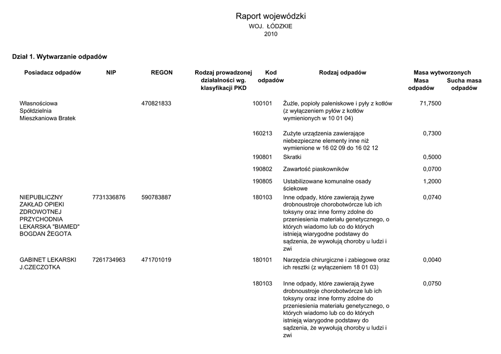 Raport wojewódzki WOJ. ŁÓDZKIE 2010 Dział 1. Wytwarzanie odpadów Posiadacz odpadów NIP Własnościowa Spółdzielnia Mieszkaniowa Bratek REGON 470821833 Rodzaj prowadzonej Kod działalności wg. odpadów klasyfikacji PKD Rodzaj odpadów Masa wytworzonych Masa Sucha masa odpadów odpadów 71,7500 100101 śuŜle, popioły paleniskowe i pyły z kotłów (z wyłączeniem pyłów z kotłów wymienionych w 10 01 04) 160213 ZuŜyte urządzenia zawierające niebezpieczne elementy inne niŜ wymienione w 16 02 09 do 16 02 12 0,7300 190801 Skratki 0,5000 190802 Zawartość piaskowników 0,0700 190805 Ustabilizowane komunalne osady ściekowe Inne odpady, które zawierają Ŝywe drobnoustroje chorobotwórcze lub ich toksyny oraz inne formy zdolne do przeniesienia materiału genetycznego, o których wiadomo lub co do których istnieją wiarygodne podstawy do sądzenia, Ŝe wywołują choroby u ludzi i zwi 1,2000 NIEPUBLICZNY ZAKŁAD OPIEKI ZDROWOTNEJ PRZYCHODNIA LEKARSKA "BIAMED" BOGDAN śEGOTA 7731336876 590783887 180103 0,0740 GABINET LEKARSKI J.CZECZOTKA 7261734963 471701019 180101 Narzędzia chirurgiczne i zabiegowe oraz ich resztki (z wyłączeniem 18 01 03) 0,0040 180103 Inne odpady, które zawierają Ŝywe drobnoustroje chorobotwórcze lub ich toksyny oraz inne formy zdolne do przeniesienia materiału genetycznego, o których wiadomo lub co do których istnieją wiarygodne podstawy do sądzenia, Ŝe wywołują choroby u ludzi i zwi 0,0750 Prywatny Gabinet Lekarski Andrzej Ziemba 7751535024 610118940 Logwin SGS Poland Sp. z o.o. 7282158105 471683801 "POLONIT" Sp. z o. o. 470579131 180103 I63.40.C 150101 Inne odpady, które zawierają Ŝywe drobnoustroje chorobotwórcze lub ich toksyny oraz inne formy zdolne do przeniesienia materiału genetycznego, o których wiadomo lub co do których istnieją wiarygodne podstawy do sądzenia, Ŝe wywołują choroby u ludzi i zwi 0,0447 Opakowania z papieru i tektury 5,6200 150102 Opakowania z tworzyw sztucznych 5,2150 070299 Inne niewymienione odpady 150101 Opakowania z papieru i tektury 0,2500 150102 Opakowania z tworzyw sztucznych 0,0800 170401 Miedź, brąz, mosiądz 3,7040 33,7000 NZOZ nr 1474 HOLLYDENT 7331311720 100104268 180103 Inne odpady, które zawierają Ŝywe drobnoustroje chorobotwórcze lub ich toksyny oraz inne formy zdolne do przeniesienia materiału genetycznego, o których wiadomo lub co do których istnieją wiarygodne podstawy do sądzenia, Ŝe wywołują choroby u ludzi i zwi 0,2610 Praktyka Stomatologiczna Rafał Piątek 8271796392 100011992 180103 Inne odpady, które zawierają Ŝywe drobnoustroje chorobotwórcze lub ich toksyny oraz inne formy zdolne do przeniesienia materiału genetycznego, o których wiadomo lub co do których istnieją wiarygodne podstawy do sądzenia, Ŝe wywołują choroby u ludzi i zwi 0,0230 KAJUS-Usługi Ogrodnicze i Agencja Pracy Tymczasowej 7691502793 590486557 200201 Odpady ulegające biodegradacji 471981674 070213 Odpady tworzyw sztucznych LASER-SINEX Sp. z o.o. - Zakład Pracy Chronionej 27,0000 0,3000 Chronionej 140603 150101 Inne rozpuszczalniki i mieszaniny rozpuszczalników Opakowania z papieru i tektury 0,2800 4,1560 150102 Opakowania z tworzyw sztucznych 0,2360 150203 Sorbenty, materiały filtracyjne, tkaniny do wycierania (np. szmaty, ścierki) i ubrania ochronne inne niŜ wymienione w 15 02 02 0,1580 160117 Metale Ŝelazne 5,9720 160118 Metale nieŜelazne 5,9970 160213 ZuŜyte urządzenia zawierające niebezpieczne elementy inne niŜ wymienione w 16 02 09 do 16 02 12 0,0320 191204 Tworzywa sztuczne i guma 0,9990 NZOZ Centrum Stomatologii DORDENT Anna Gągolewska 7752069239 472225199 180103 Inne odpady, które zawierają Ŝywe drobnoustroje chorobotwórcze lub ich toksyny oraz inne formy zdolne do przeniesienia materiału genetycznego, o których wiadomo lub co do których istnieją wiarygodne podstawy do sądzenia, Ŝe wywołują choroby u ludzi i zwi 0,0034 Adam Bielak 7251040058 470999577 180103 Inne odpady, które zawierają Ŝywe drobnoustroje chorobotwórcze lub ich toksyny oraz inne formy zdolne do przeniesienia materiału genetycznego, o których wiadomo lub co do których istnieją wiarygodne podstawy do sądzenia, Ŝe wywołują choroby u ludzi i zwi 0,0340 "ASAJ" Sp. z o.o. 8212227830 712308273 150101 Opakowania z papieru i tektury 1,1900 160213 ZuŜyte urządzenia zawierające niebezpieczne elementy inne niŜ wymienione w 16 02 09 do 16 02 12 0,0017 020502 Osady z zakładowych oczyszczalni ścieków Okręgowa Spółdzielnia Mleczarska w Radomsku 000439196 190,7000 020580 Odpadowa serwatka 130205 Mineralne oleje silnikowe, przekładniowe i smarowe niezawierające związków chlorowcoorganicznych 150101 Opakowania z papieru i tektury 150102 Opakowania z tworzyw sztucznych 150105 Opakowania wielomateriałowe 150110 Opakowania zawierające pozostałości substancji niebezpiecznych lub nimi zanieczyszczone (np. środkami ochrony roślin I i II klasy toksyczności - bardzo toksyczne i toksyczne) 1,1770 150202 Sorbenty, materiały filtracyjne (w tym filtry olejowe nieujęte w innych grupach), tkaniny do wycierania (np. szmaty, ścierki) i ubrania ochronne zanieczyszczone substancjami niebezpiecznymi (np. PCB) 0,1200 150203 Sorbenty, materiały filtracyjne, tkaniny do wycierania (np. szmaty, ścierki) i ubrania ochronne inne niŜ wymienione w 15 02 02 0,1600 160103 ZuŜyte opony 4,0000 160107 Filtry olejowe 0,2800 160213 ZuŜyte urządzenia zawierające niebezpieczne elementy inne niŜ wymienione w 16 02 09 do 16 02 12 0,0210 160214 ZuŜyte urządzenia inne niŜ wymienione w 16 02 09 do 16 02 13 Elementy usunięte ze zuŜytych urządzeń inne niŜ wymienione w 16 02 15 0,5600 160216 160380 170405 NZOZ "ELMED" Dariusz Stangreciak 7751085265 610404142 180103 5 888,9000 1,3900 20,0000 6,1000 14,7000 0,0300 Produkty spoŜywcze przeterminowane lub nieprzydatne do spoŜycia śelazo i stal 12,0000 Inne odpady, które zawierają Ŝywe drobnoustroje chorobotwórcze lub ich toksyny oraz inne formy z