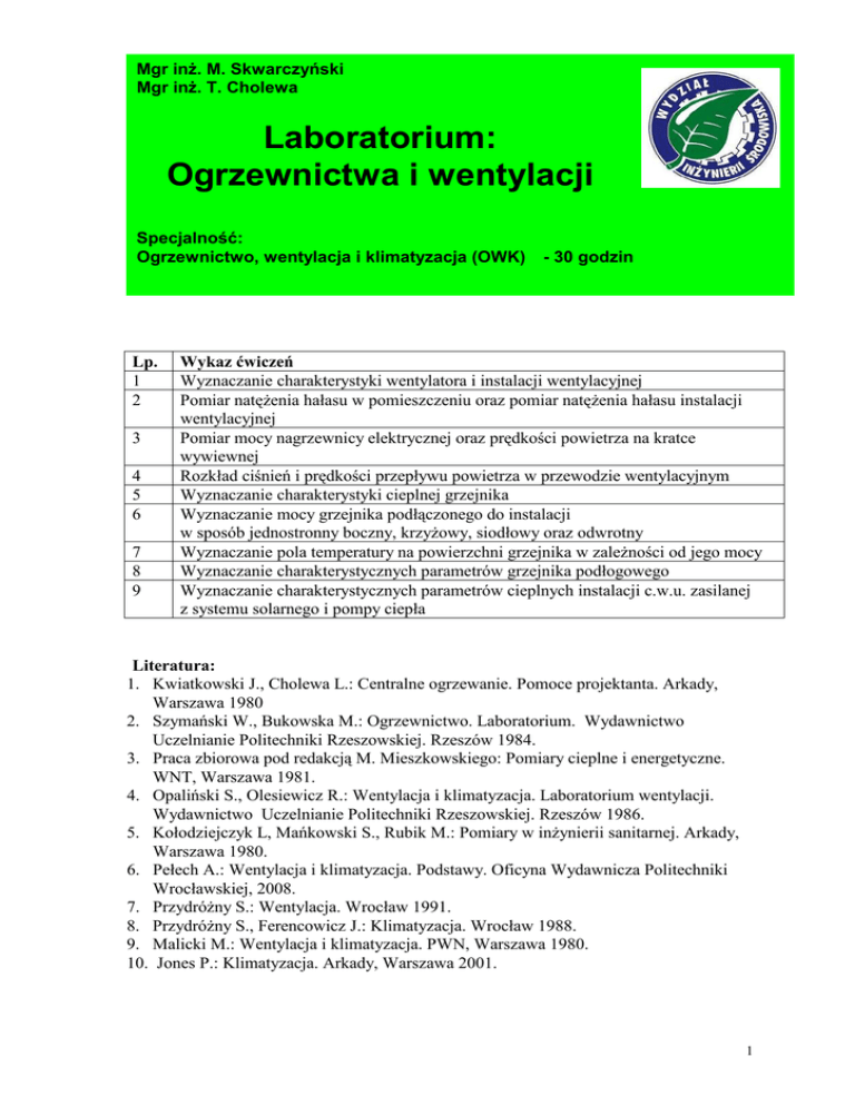 Mgr inŜ. M. Skwarczyński Mgr inŜ. T. Cholewa Laboratorium: Ogrzewnictwa i wentylacji Specjalność: Ogrzewnictwo, wentylacja i klimatyzacja (OWK) Lp. 1 2 3 4 5 6 7 8 9 - 30 godzin Wykaz ćwiczeń Wyznaczanie charakterystyki wentylatora i instalacji wentylacyjnej Pomiar natęŜenia hałasu w pomieszczeniu oraz pomiar natęŜenia hałasu instalacji wentylacyjnej Pomiar mocy nagrzewnicy elektrycznej oraz prędkości powietrza na kratce wywiewnej Rozkład ciśnień i prędkości przepływu powietrza w przewodzie wentylacyjnym Wyznaczanie charakterystyki cieplnej grzejnika Wyznaczanie mocy grzejnika podłączonego do instalacji w sposób jednostronny boczny, krzyŜowy, siodłowy oraz odwrotny Wyznaczanie pola temperatury na powierzchni grzejnika w zaleŜności od jego mocy Wyznaczanie charakterystycznych parametrów grzejnika podłogowego Wyznaczanie charakterystycznych parametrów cieplnych instalacji c.w.u. zasilanej z systemu solarnego i pompy ciepła Literatura: 1. Kwiatkowski J., Cholewa L.: Centralne ogrzewanie. Pomoce projektanta. Arkady, Warszawa 1980 2. Szymański W., Bukowska M.: Ogrzewnictwo. Laboratorium. Wydawnictwo Uczelnianie Politechniki Rzeszowskiej. Rzeszów 1984. 3. Praca zbiorowa pod redakcją M. Mieszkowskiego: Pomiary cieplne i energetyczne. WNT, Warszawa 1981. 4. Opaliński S., Olesiewicz R.: Wentylacja i klimatyzacja. Laboratorium wentylacji. Wydawnictwo Uczelnianie Politechniki Rzeszowskiej. Rzeszów 1986. 5. Kołodziejczyk L, Mańkowski S., Rubik M.: Pomiary w inŜynierii sanitarnej. Arkady, Warszawa 1980. 6. Pełech A.: Wentylacja i klimatyzacja. Podstawy. Oficyna Wydawnicza Politechniki Wrocławskiej, 2008. 7. PrzydróŜny S.: Wentylacja. Wrocław 1991. 8. PrzydróŜny S., Ferencowicz J.: Klimatyzacja. Wrocław 1988. 9. Malicki M.: Wentylacja i klimatyzacja. PWN, Warszawa 1980. 10. Jones P.: Klimatyzacja. Arkady, Warszawa 2001. 1 Ćwiczenie nr 1 Wyznaczanie charakterystyki wentylatora i instalacji wentylacyjnej 1. Cel ćwiczenia Celem ćwiczenia jest: • • wyznaczenie charakterystyki wentylatora wydatek-spręŜ wydatek-moc wydatek-sprawność wyznaczenie charakterystyki instalacji przy róŜnych ustawieniach przepustnicy powietrza 2. Schemat i opis stanowiska pomiarowego Rys. 1.1. Model instalacji doświadczalnej w 3D Rys. 1.2. Schemat stanowiska doświadczalnego Stanowisko pomiarowe (rys. 1.2) zbudowane jest z elementów zestawionych w tabeli 1.1. 2 Tabela. 1.1. Elementy składowe stanowiska doświadczalnego Lp. N 1.1 N 1.2 N 1.3 N 1.4 N 1.5 N 1.6 N 1.7 N 1.8 N 1.9 N 1.10 N 1.11 N 1.12 N 1.13 Nazwa Czerpnia IGC φ = 200 Kanał wentylacyjny Spiro φ = 200; l= 400 mm Element pomiarowy DEBIMO φ = 200 Kanał wentylacyjny Spiro φ = 200; l= 1000 mm Wentylator do kanałów o przekroju kołowym K 200L Kanał wentylacyjny Spiro φ = 200; l= 600 mm Element pomiarowy DEBIMO φ = 200 Kanał wentylacyjny Spiro φ = 200; l= 500 mm Przepustnica powietrza FMU φ = 200 Wyrzutnia IGC φ = 200 Kanał wentylacyjny Spiro φ = 200; l= 500 mm Rejestrator róŜnicy ciśnień C200 Rejestrator róŜnicy ciśnień C200 Producent Systemair Systemair KIMO Systemair Systemair Systemair KIMO Systemair Smay Systemair Systemair KIMO KIMO Szt. 1 1 1 1 1 1 1 1 1 1 1 1 1 Doświadczalne wyznaczenie strat ciśnienia przy przepływie powietrza odbywa się na stanowisku przedstawionym na powyŜszym rysunku. Powietrza zasysane jest przez wentylator (N 1.5), odcinkami prostych przewodów (N 1.2 i N 1.4), między którymi wbudowano elementy pomiarowe Debimo (N 1.4). Element pomiarowy Debimo stanowi urządzenie wymienne i moŜe być zastąpione termomanometrem, rurką Pitota, dostępnymi w laboratorium elementami pomiarowymi Lindab i Systemair. Strona tłoczna instalacji wyposaŜona została w odcinki proste przewodów (N 1.6 i N 1.8), między które równieŜ zainstalowano wymienny element pomiarowy Debimo (N 1.7). Na początku odcinka pomiarowego zainstalowano czerpnię powietrza (N 1.1). Pomiar ciśnienia prowadzony jest za pomocą przetwornika róŜnicy ciśnień KIMO. Do urządzenia za pomocą gumowych węŜyków podłączone są elementy pomiarowe Debimo, dzięki którym pomiar dokonywany jest jednocześnie w kilkunastu punktach przekroju przewodu. 3. Przebieg ćwiczenia I. Instrukcje ogólne 1. Zapoznać się z budową stanowiska, rozmieszczeniem i zakresami punktów pomiarowych 2. Podłączyć rejestratory róŜnicy ciśnień 3. Uruchomić wentylator wyłącznie na polecenie prowadzącego zajęcia. II. Wyznaczanie podstawowej charakterystyki wentylatora wydatek-spręŜ 1. Ustawić napięcie zasilające wentylator za pomocą regulatora prędkości obrotowej wentylatora 2. Dławić przepływ powietrza w przewodzie przy pomocy przepustnicy w taki sposób, aby uzyskać na rejestratorze N1.12 ciśnienie dynamiczne o wartościach zestawionych w tabeli 1.2 3. Obliczyć przepływ w przewodzie wentylacyjnym wykorzystując wzór dla elementów Debimo: V =K⋅ 574,2 ⋅ t p + 156842,77 p0 ⋅ p d [m/s] gdzie: K – współczynnik przeliczeniowy Debimo tp – temperatura powietrza [°C], p0 – ciśnienie barometryczne [Pa]. pd – ciśnienie dynamiczne [Pa]. 3 4. Odczytać spręŜ wentylatora ∆p 5. Dane pomiarowe opracować w tabeli 1.2 6. Sporządzić wykres pracy wentylatora Q = f(∆p) III. Wyznaczanie hydraulicznej charakterystyki instalacji 1. Ustawić napięcie zasilające wentylator za pomocą regulatora prędkości obrotowej wentylatora 2. Dla róŜnych stopni otwarcia przepustnicy dokonać pomiar ciśnienia dynamicznego na rejestratorze N1.12 oraz odczytać spadek ciśnienia w instalacji za pomocą rejestratora N1.13 3. Powtórzyć pomiar dla kilkunastu wartości napięcia 4. Dane pomiarowe opracować w tabeli 1.3 5. Sporządzić wykres charakteryzujący opory hydrauliczne instalacji Q = f(∆p) IV. Wyznaczanie charakterystyki wentylatora wydatek-moc oraz wydatek-sprawność 1. Ustawić napięcie zasilające wentylator za pomocą regulatora prędkości obrotowej wentylatora 2. Wykonać pomia